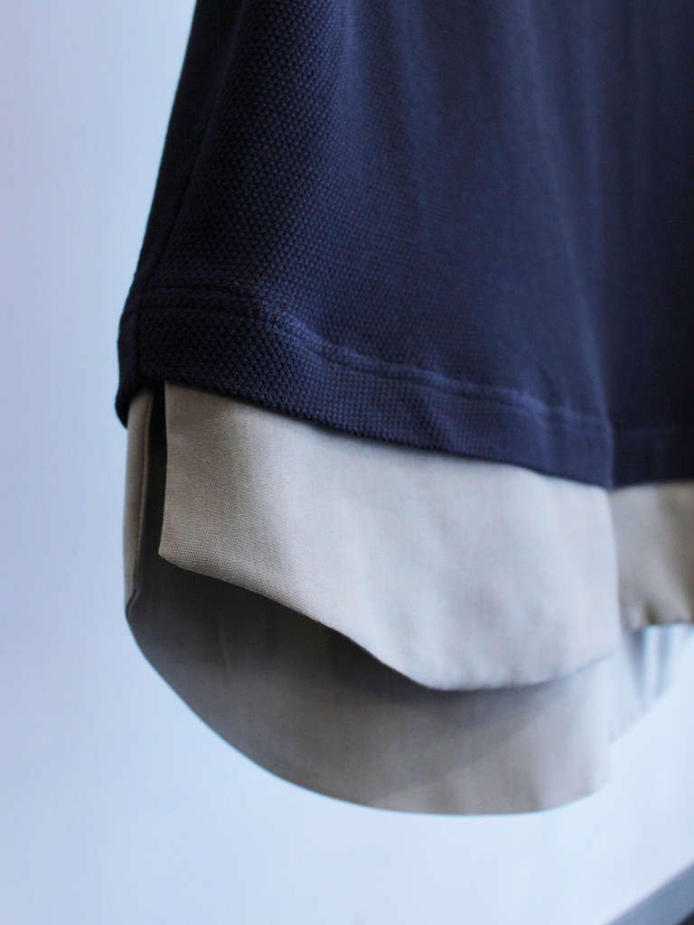 レイヤードを前提としたショート丈のカフドボートネックをシャツテールの配色切り替えの仕様にリメイクしたプルオーバーです。