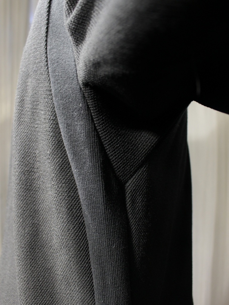 特徴として「ドラッピング」の概念を取り入れ、肩甲骨より始まるサイド切り替えが手前に向かうよう立体的に配されており、シンプルで複雑な雰囲気に仕上がっております。 セットインアレンジメントスリーブで身体のラインに沿いながらも程よいゆとりのあるシルエットです。