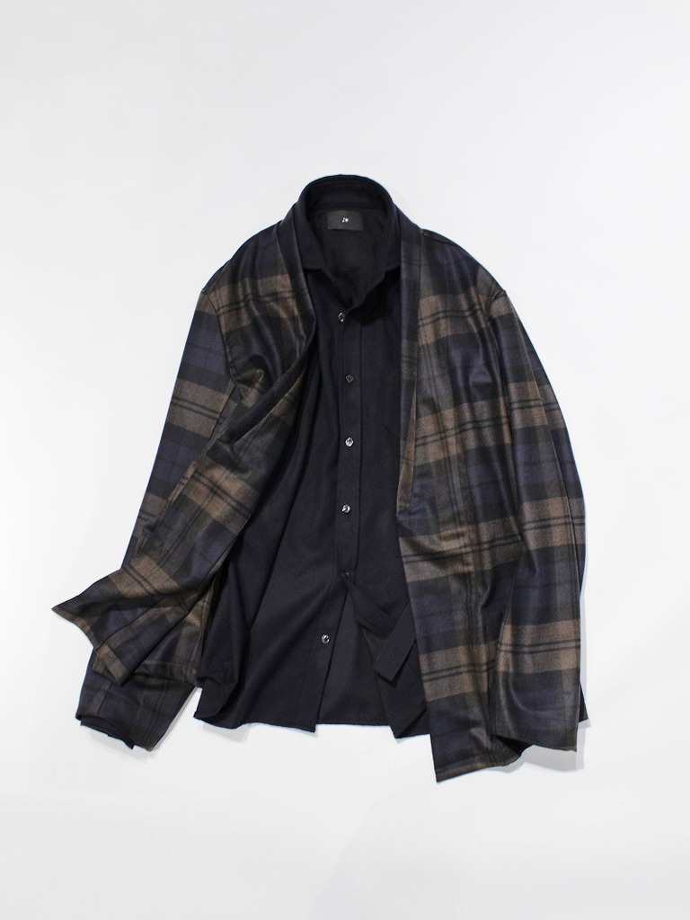 紡毛のシャツの上に梳毛のノーカラージャケットという究極の素材遊びという合わせです。