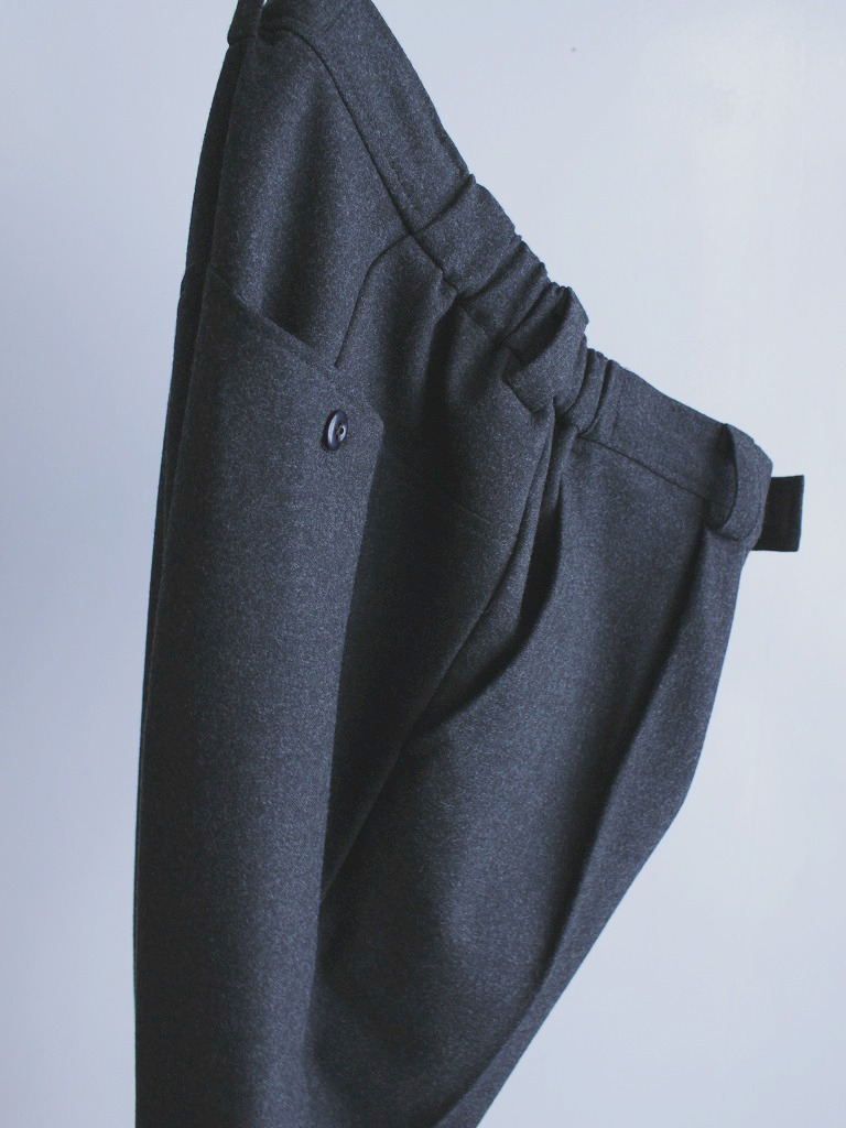 寒冷期のメインボトムとしての優れた特性を持つウオーム生地を使用したバージョンのシャーリングトラウザースが完成致しました。