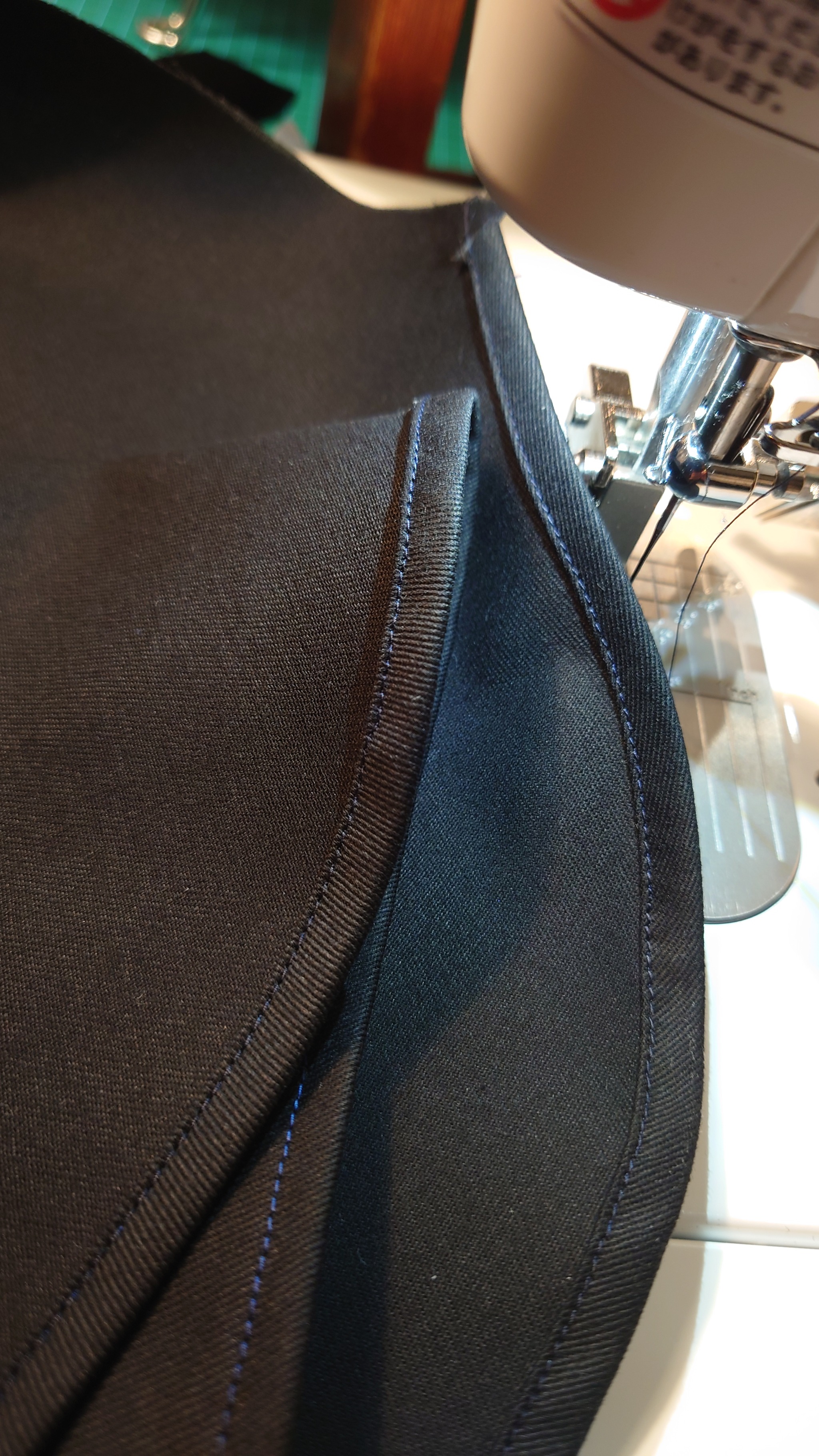 例えば、シャツの三ツ巻裾であればヘマーなど専用アタッチメントの工業用ミシンを使えば数秒で縫い上がるものを、アトリエメイドでは芯を張り、アイロンで巻いて目視でカーブを縫っていきます。