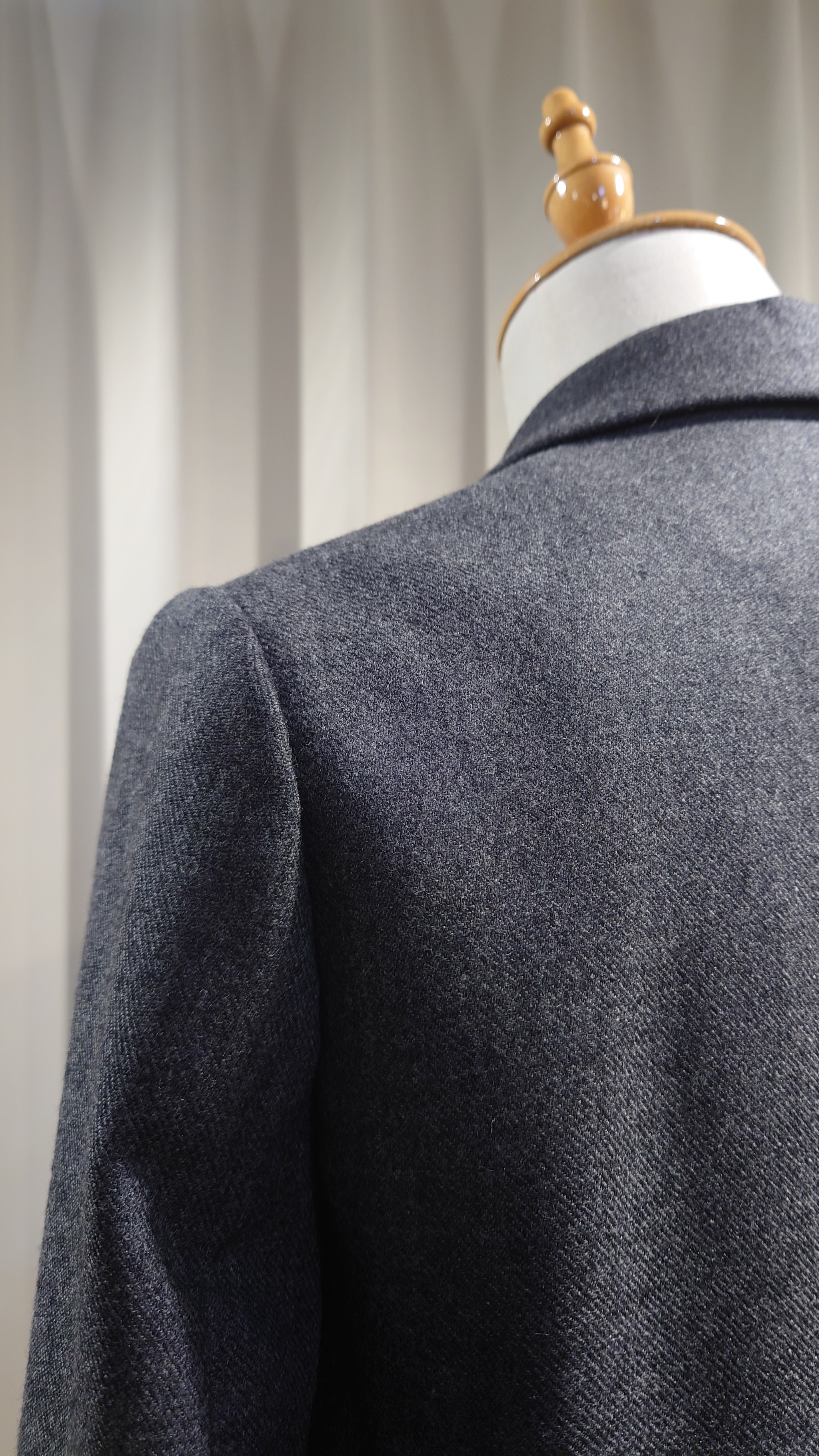 こちらは秋冬の素材です。なぜこのタイミング かと言いますと。この生地があと数着分を残して 絶版ということ。また、今シーズン着れるかという考えよりも ワードローブとして長く 何十年も付き合っていくものと考えておりますので 、今着ることよりもそれを持っているか持っていないかということが重要だと思うことが理由です。 The Garageのお客様はそういう趣向の方が非常に多いということも追い風になっております。そして、ただいま縫製師のコンディションが非常に乗っている 流れで作ると非常に良いものができるという理由で、貴重な絶版サキソニーを使用するのは今と判断させていただきました。
