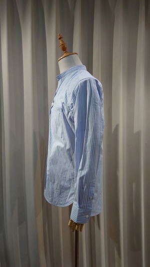超長綿オーガニックコットン100%のタイプライタークロスを使用したバンドカラーシャツ。 天日干しをしたようなドライタッチ仕上げでナチュラルな膨張らみのあるワッシャーヴィンテージ加工を施し洗いざらしで着用出来る風合いです。