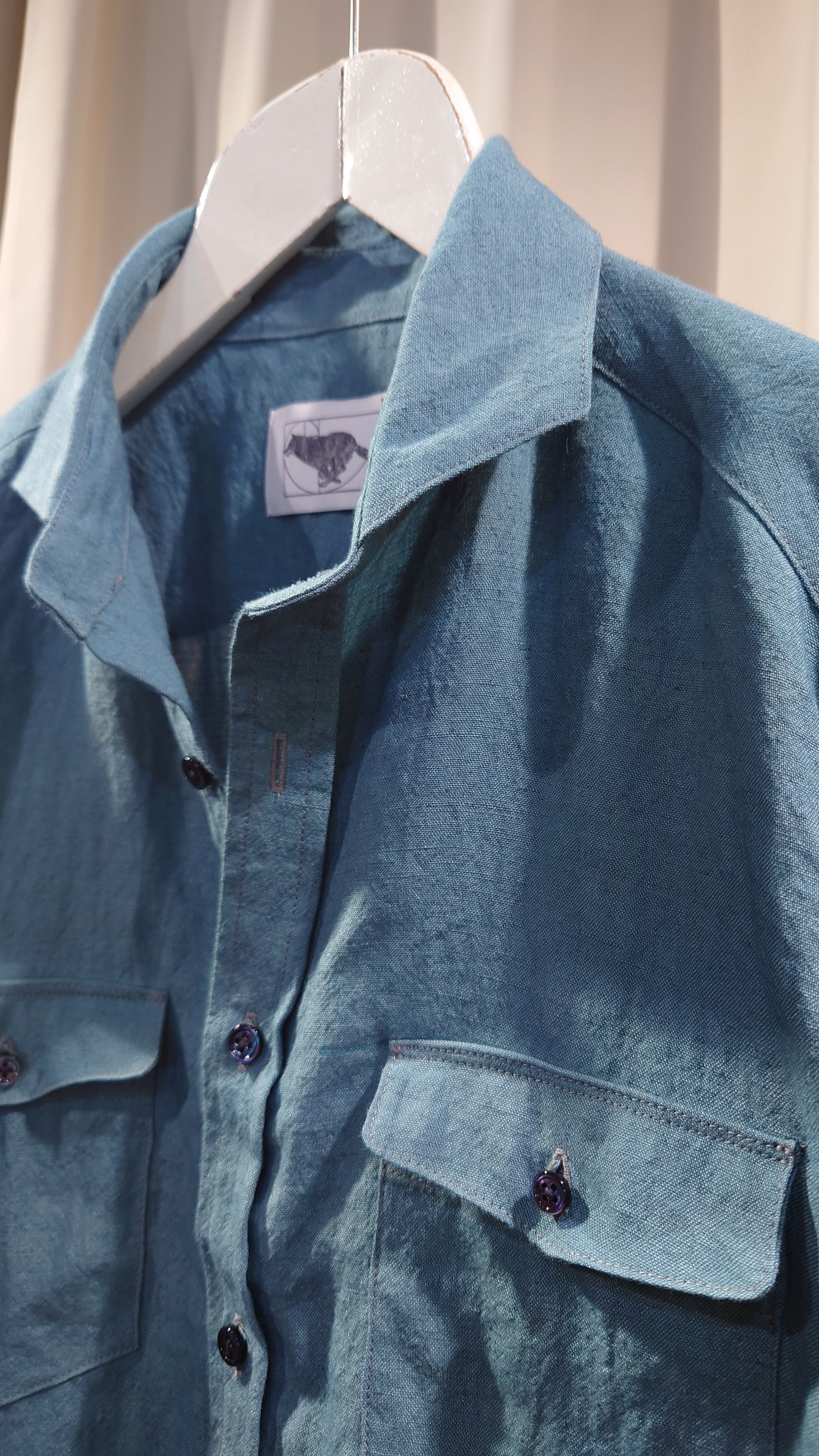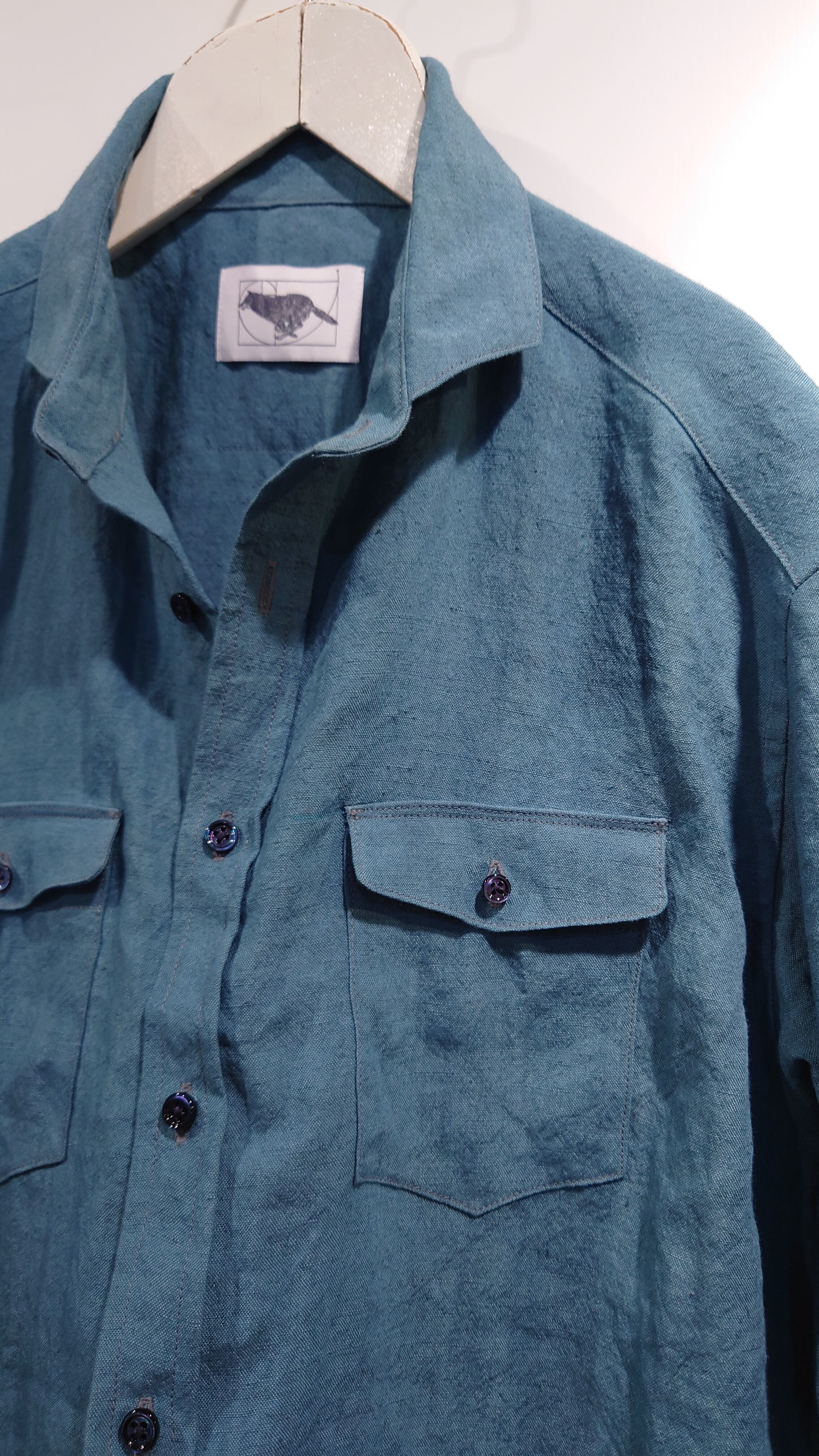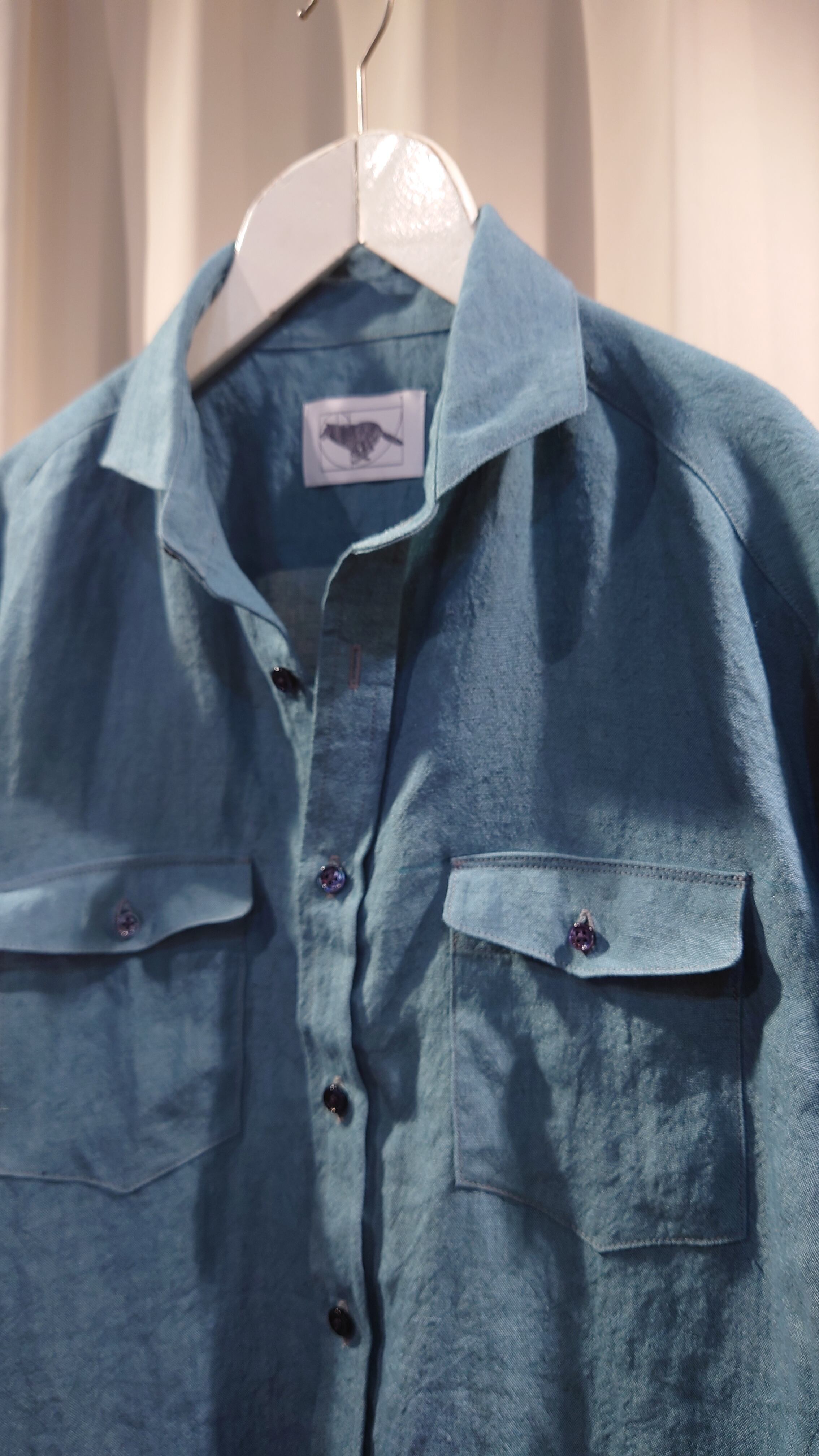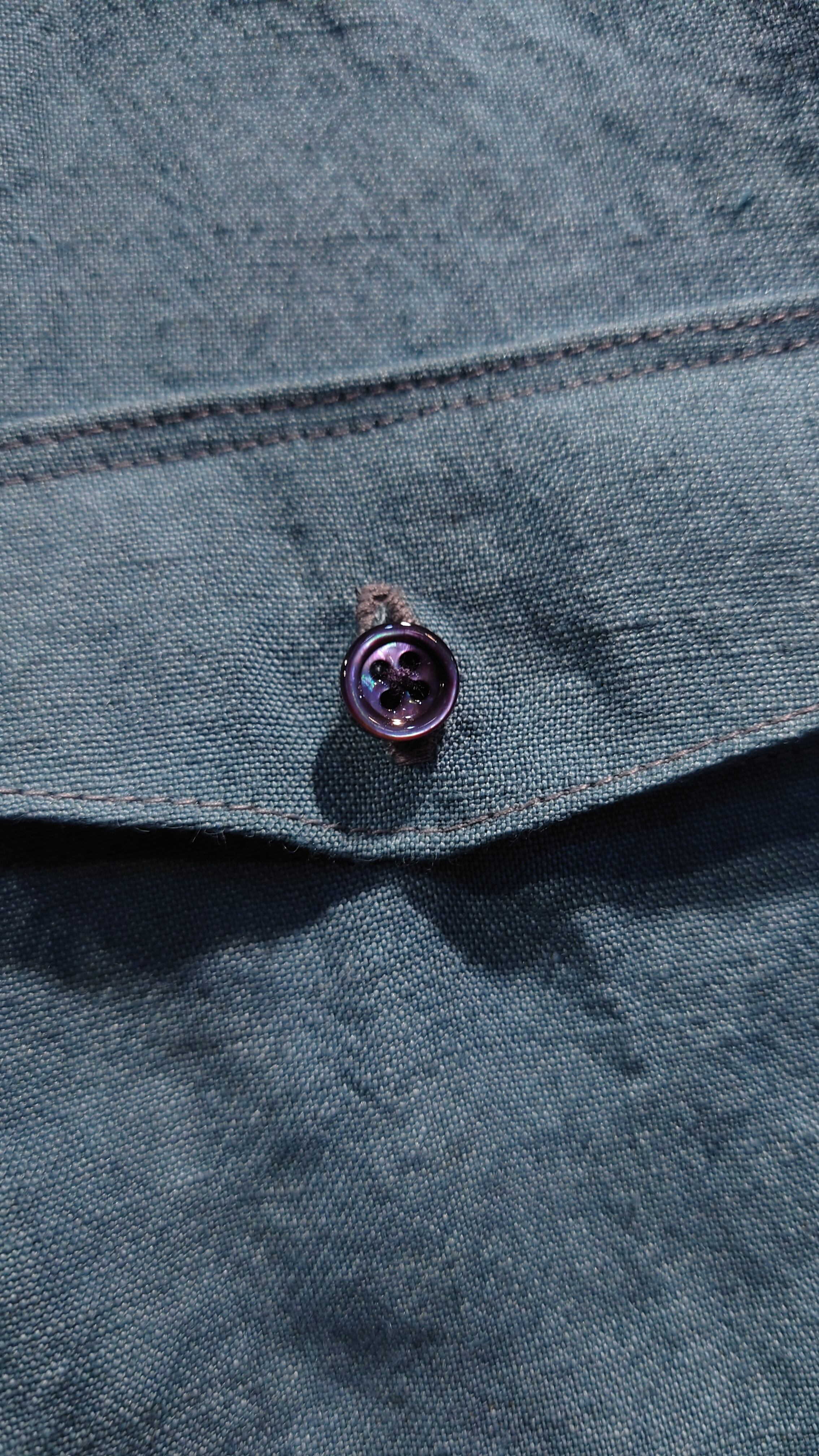 国内(遠州)工場にて旧式のシャトル、職人の目視で機織りされる風合いのあるリネンを使用しています。タテ糸に強度のある40番のラミー糸、ヨコ糸にしなやかな40番手のリネン糸を使用した交織平織り生地です。遠州染によるフェードが掛かった色調のオーバーダイは洗う事により馴染み益々味わい深い色調になります。ステッチとボタンホールにはグレー糸を使っています。