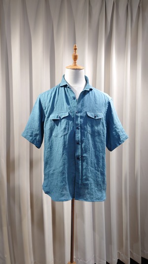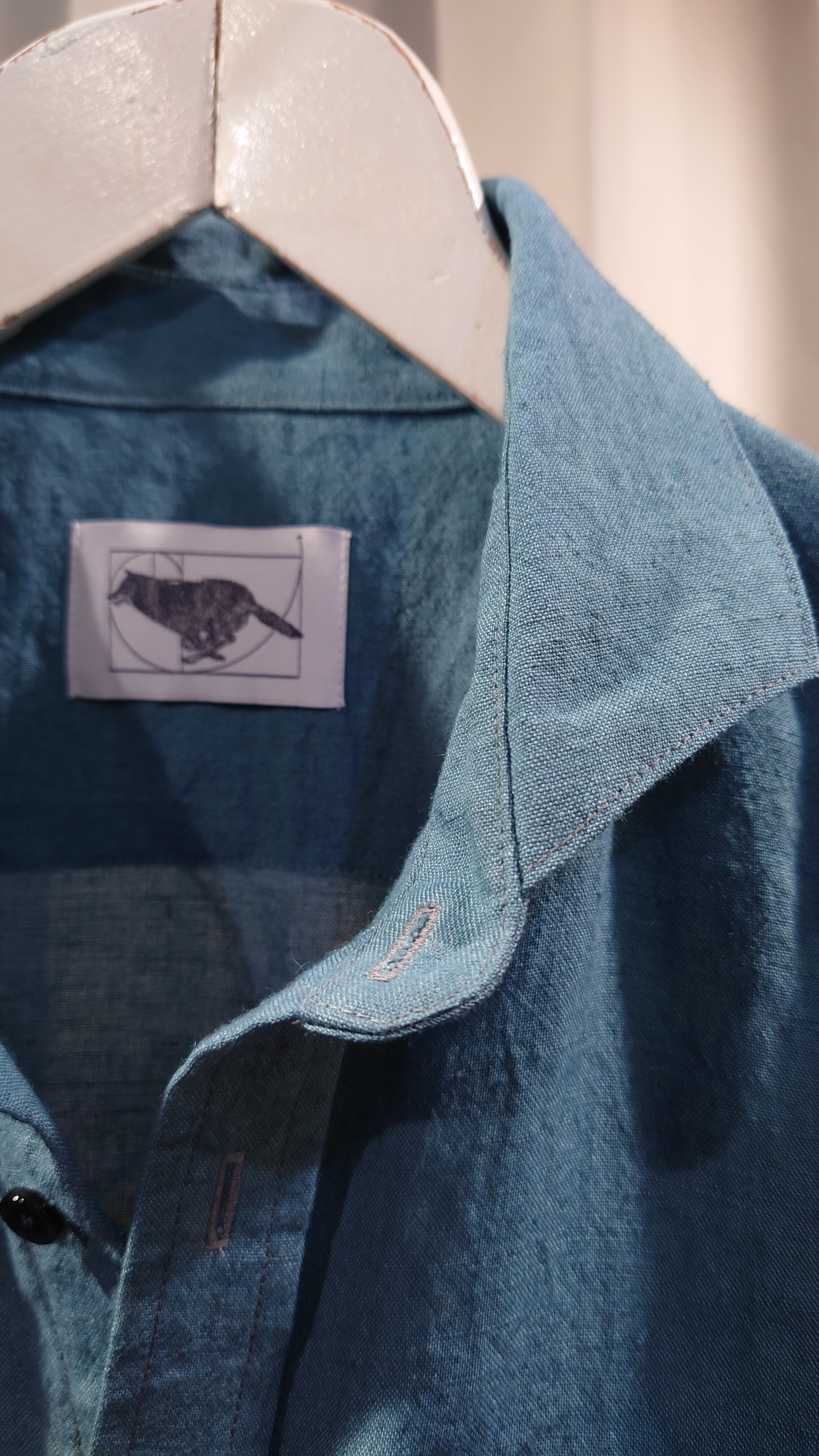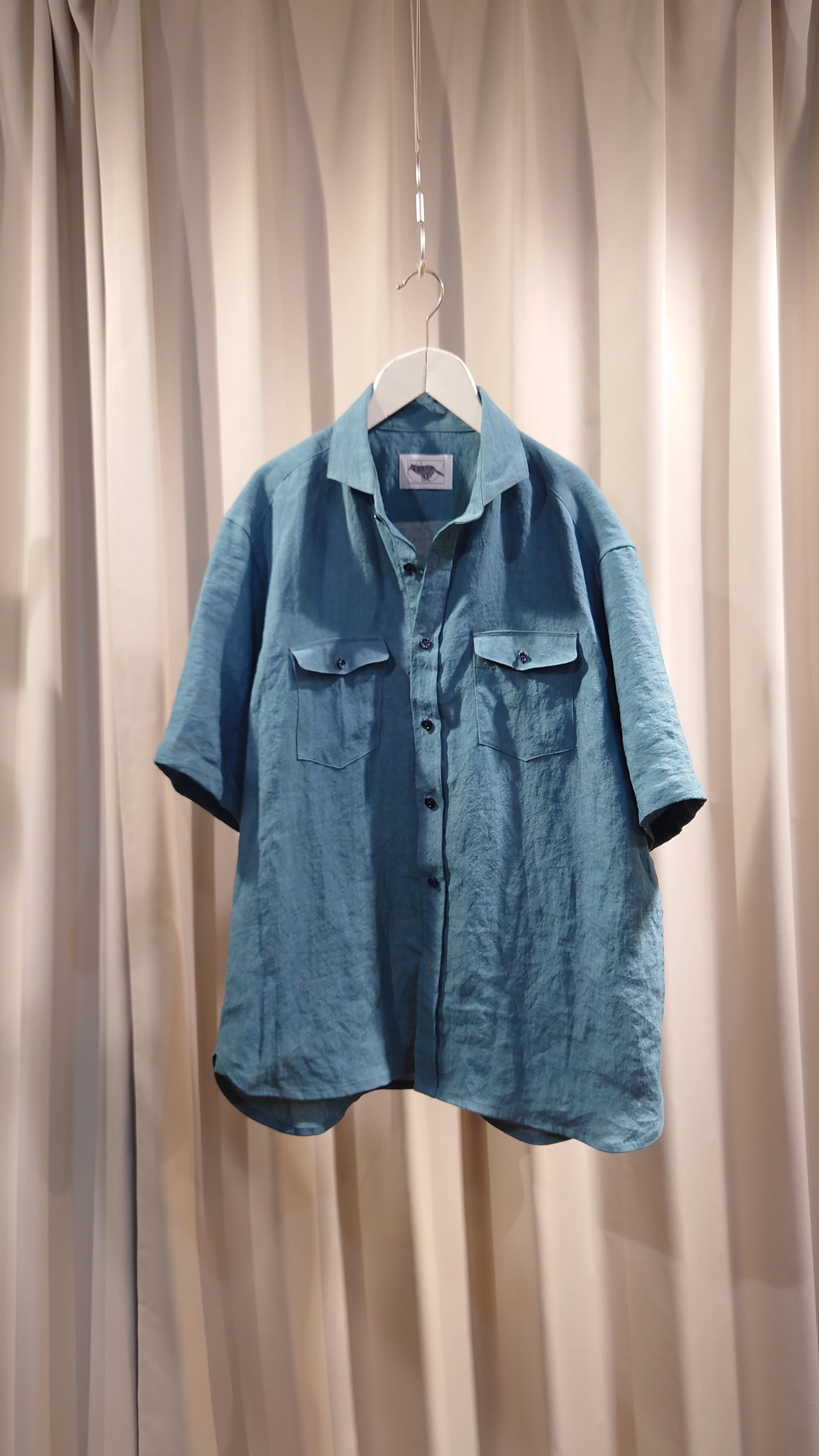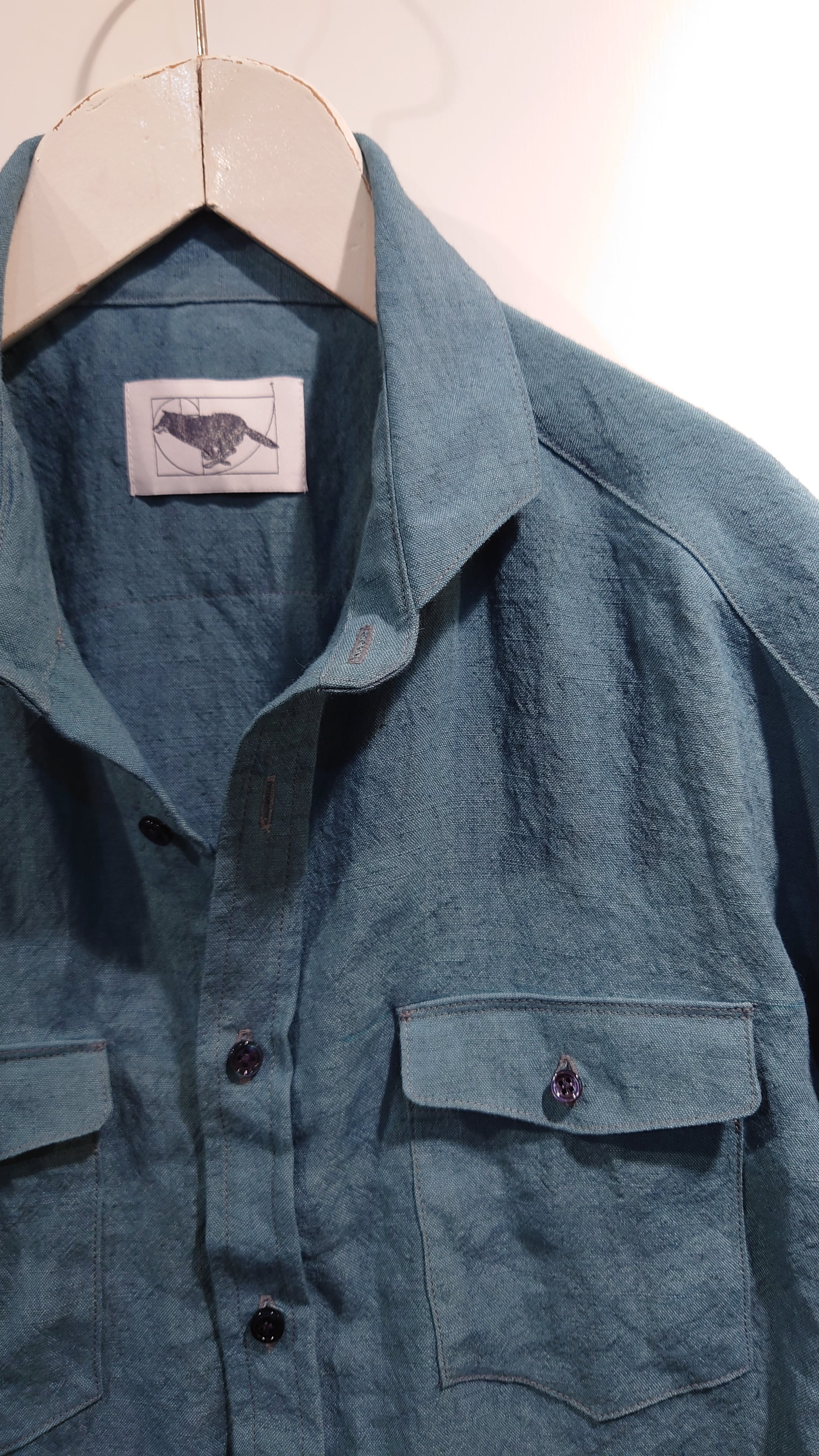 国内(遠州)工場にて旧式のシャトル、職人の目視で機織りされる風合いのあるリネンを使用しています。タテ糸に強度のある40番のラミー糸、ヨコ糸にしなやかな40番手のリネン糸を使用した交織平織り生地です。遠州染によるフェードが掛かった色調のオーバーダイは洗う事により馴染み益々味わい深い色調になります。ステッチとボタンホールにはグレー糸を使っています。