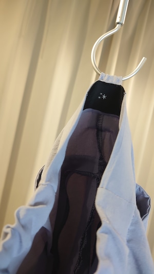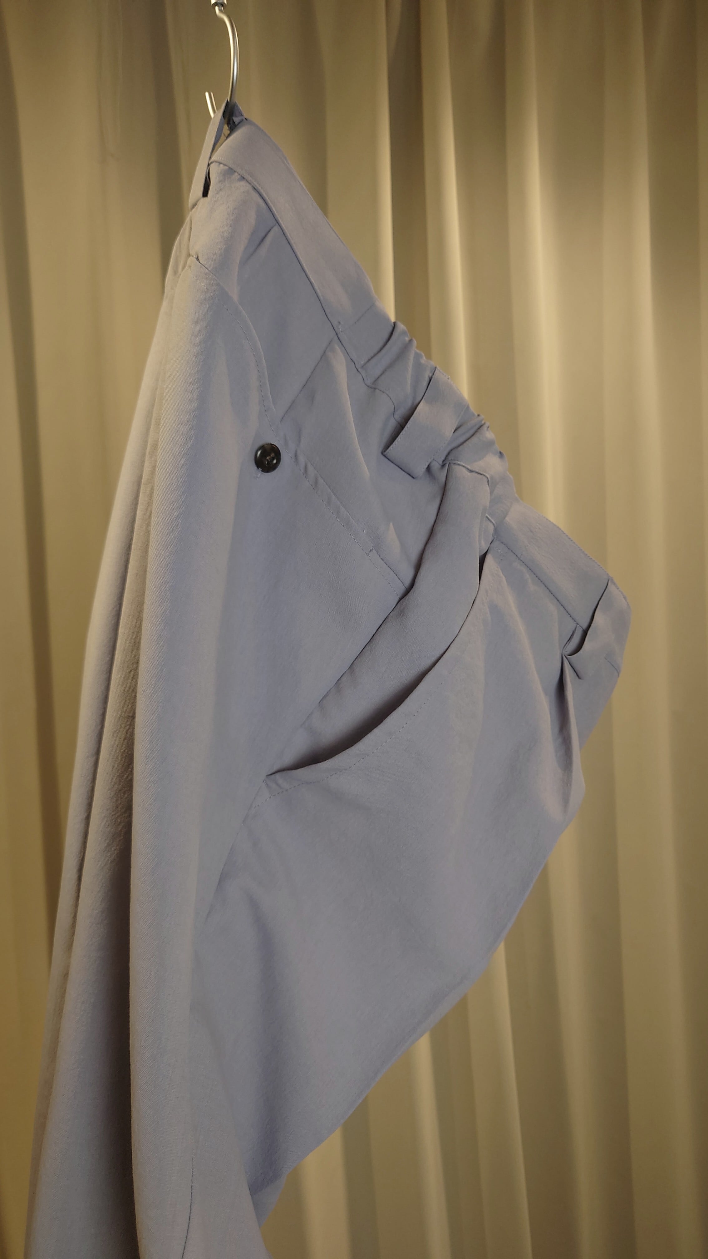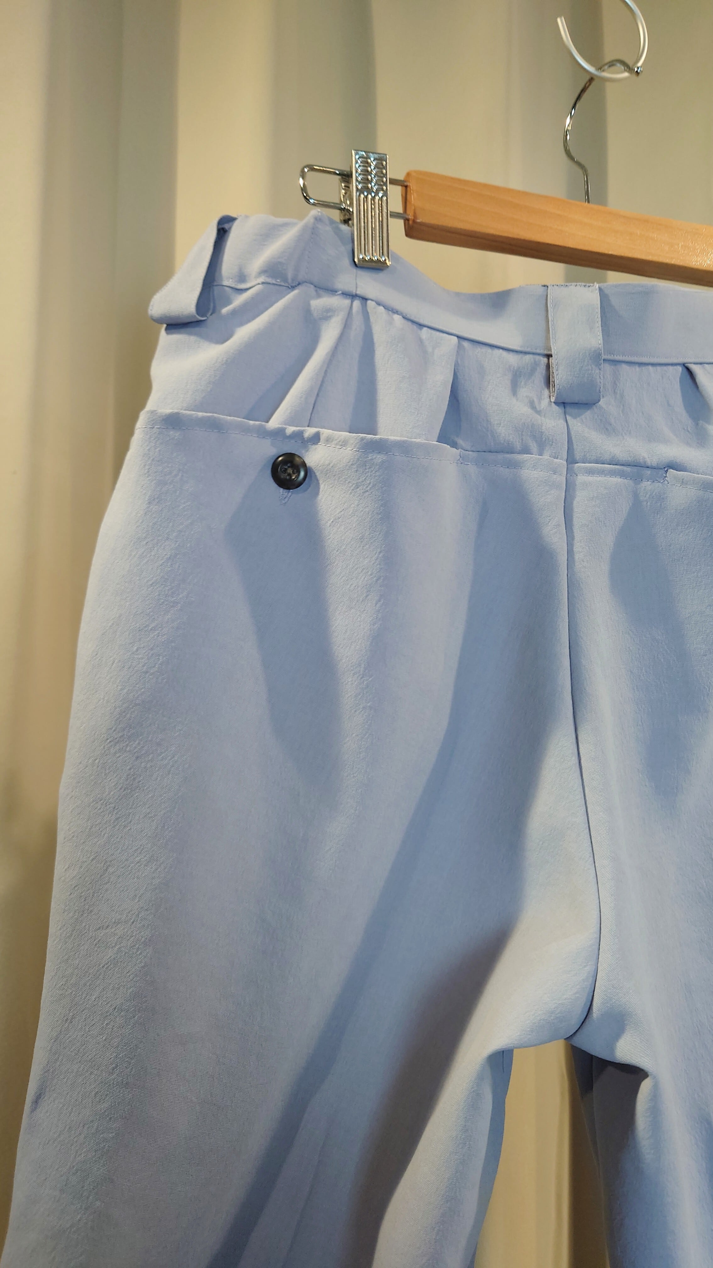 空糸という中央に空気を含む空洞がある構造の糸からなる軽量、断熱の特性があるマットな風合いの高密度生地を使用。撚りをかけずループ結束した立体的な生地は通気性に優れ更に速乾性、耐経年劣化、斜交、退色し難く肌離れの良い生地特性があります。身体の動きに対し張りとドレープ感の出るオールシーズン着用可能のボトムスです。
