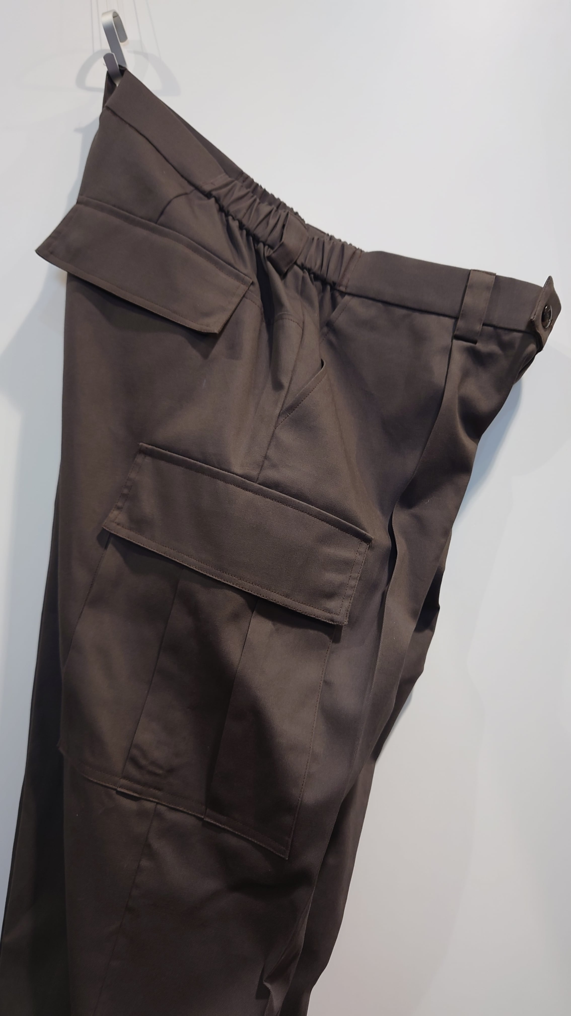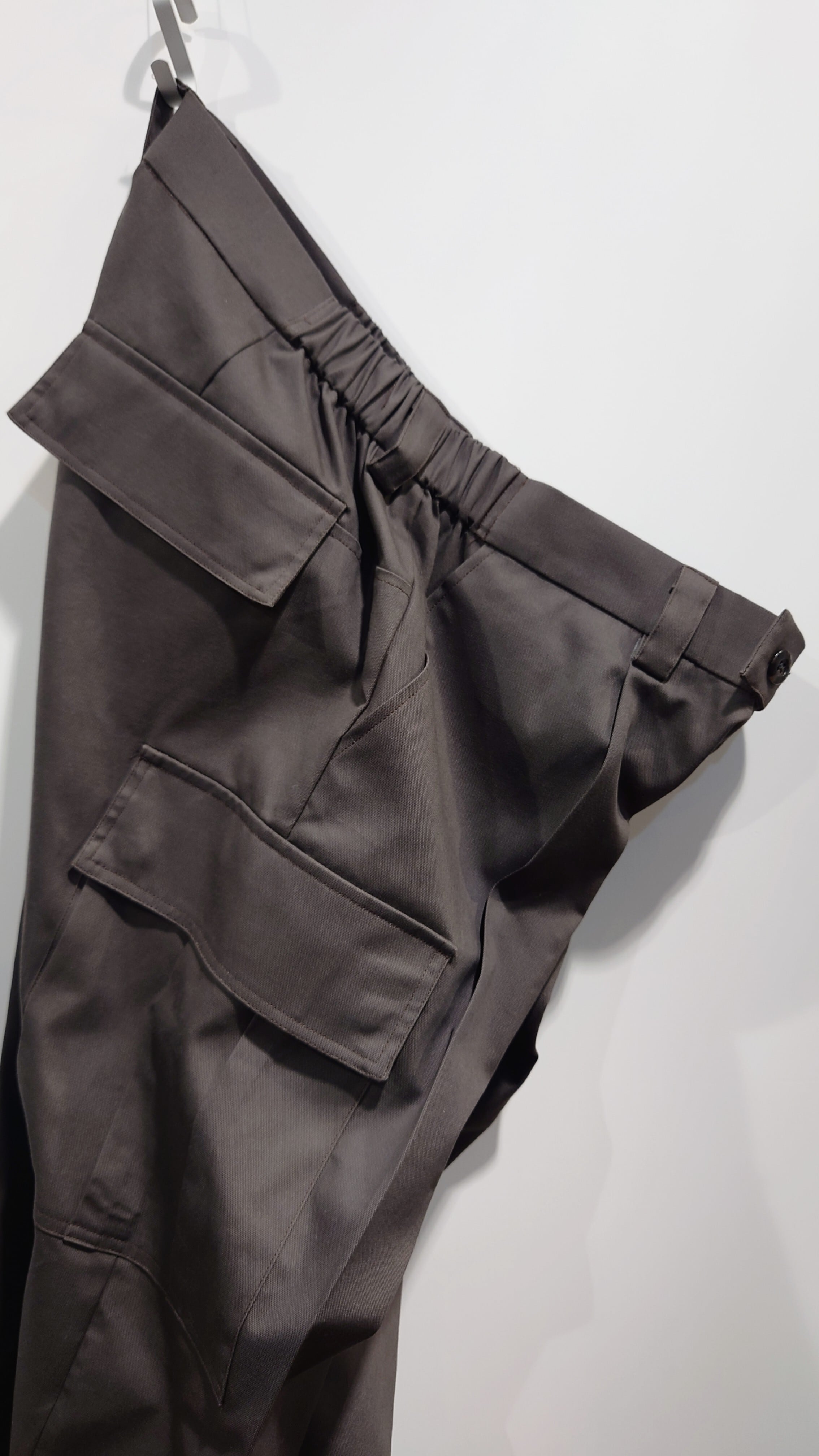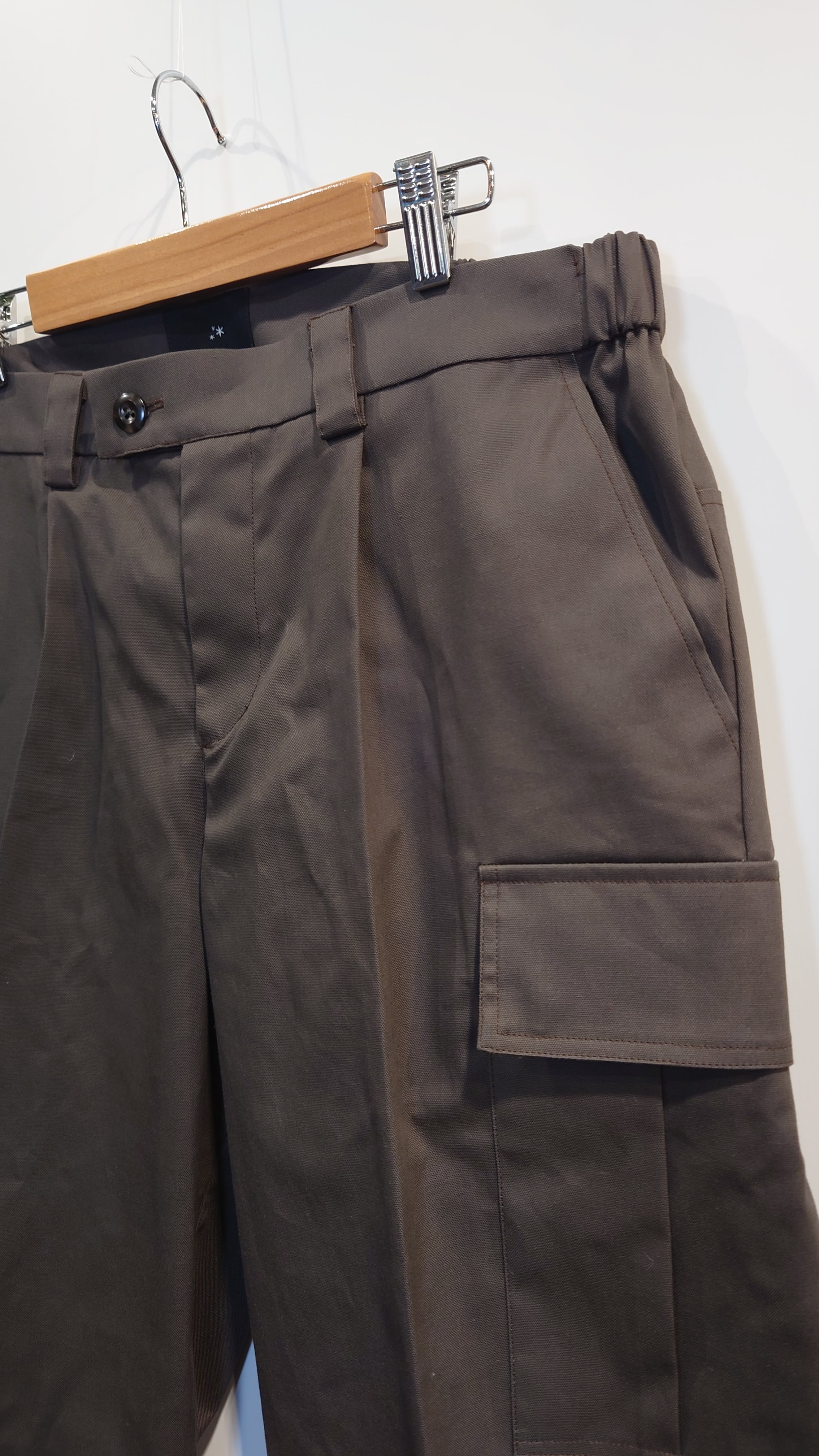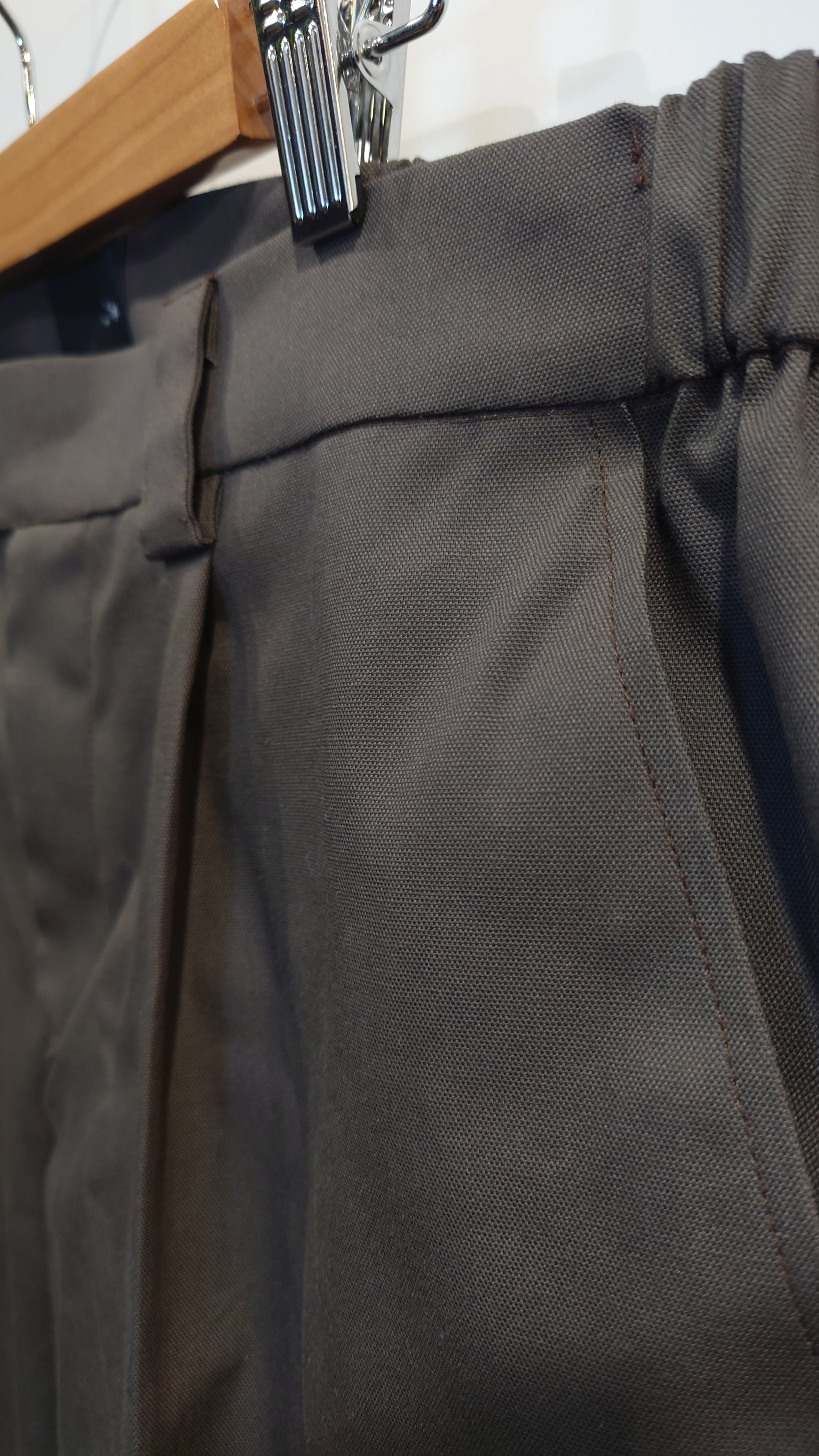 リゾートパンツとしてデザインされたワイドシャーリングトラウザースをベースにしたワンタックのウエストラインから緩やかなテーパードを描く立体フォルムです。