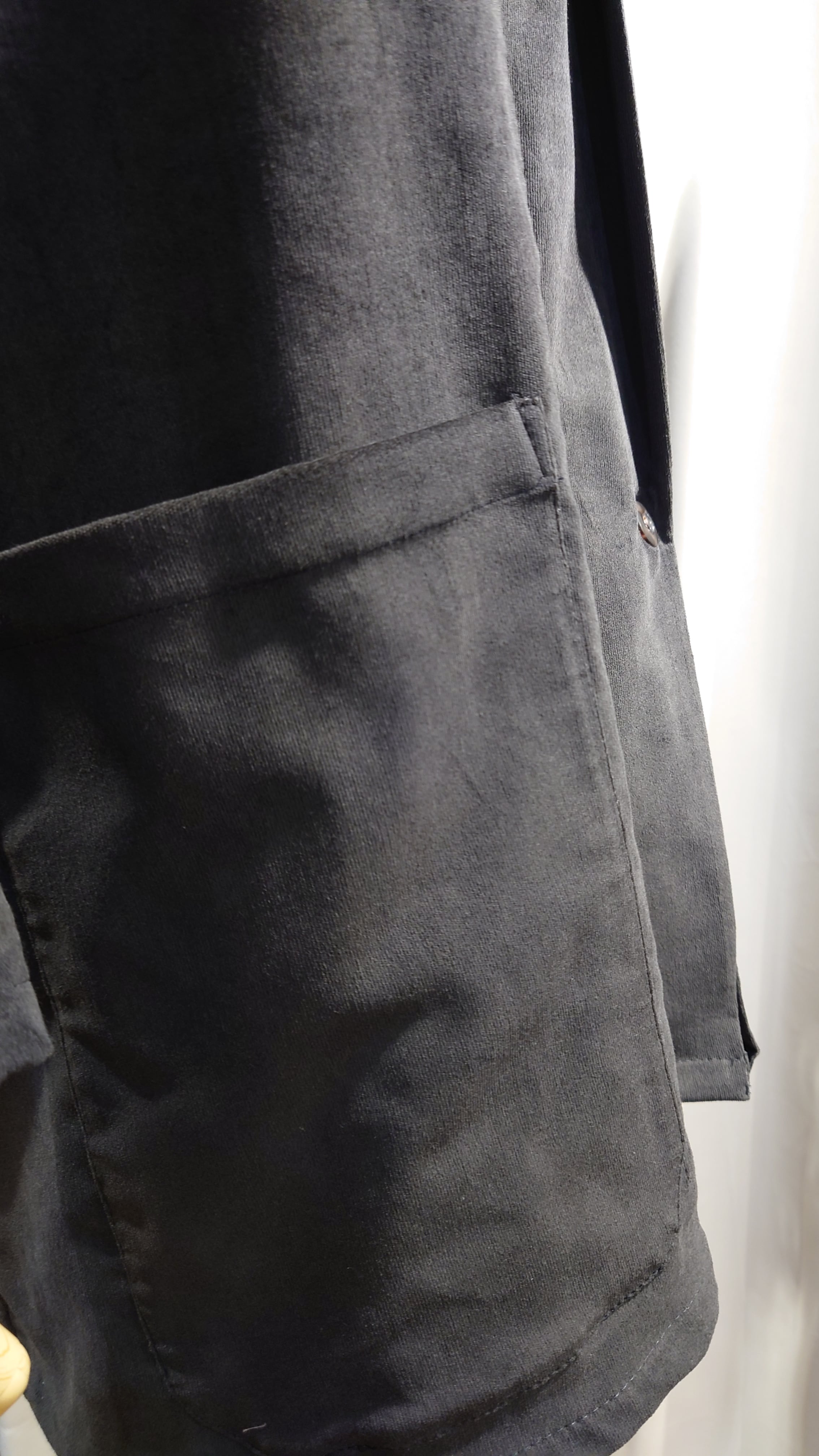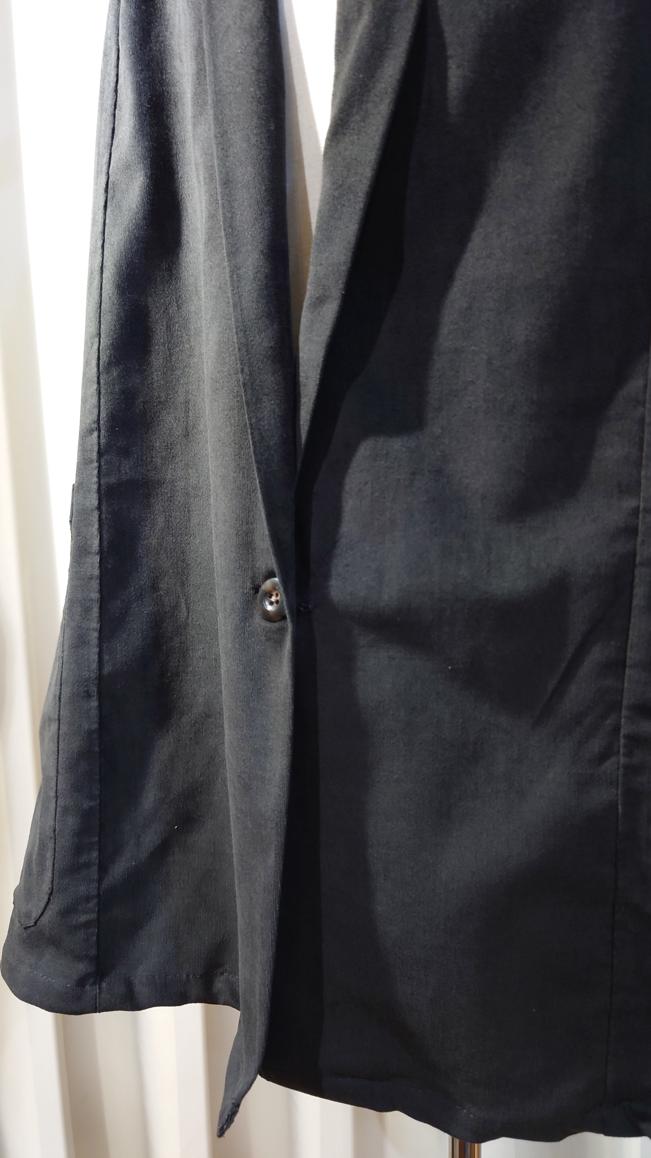 テーラードジャケットを基本設計としたフォルムで、ショールカラーデザイン。一重の作り、1つボタン、テーラ―ドジャケットの2枚袖の仕様になっています。コート並みに面積を広く取った見返しにより安定したフォルムに仕上がっています。