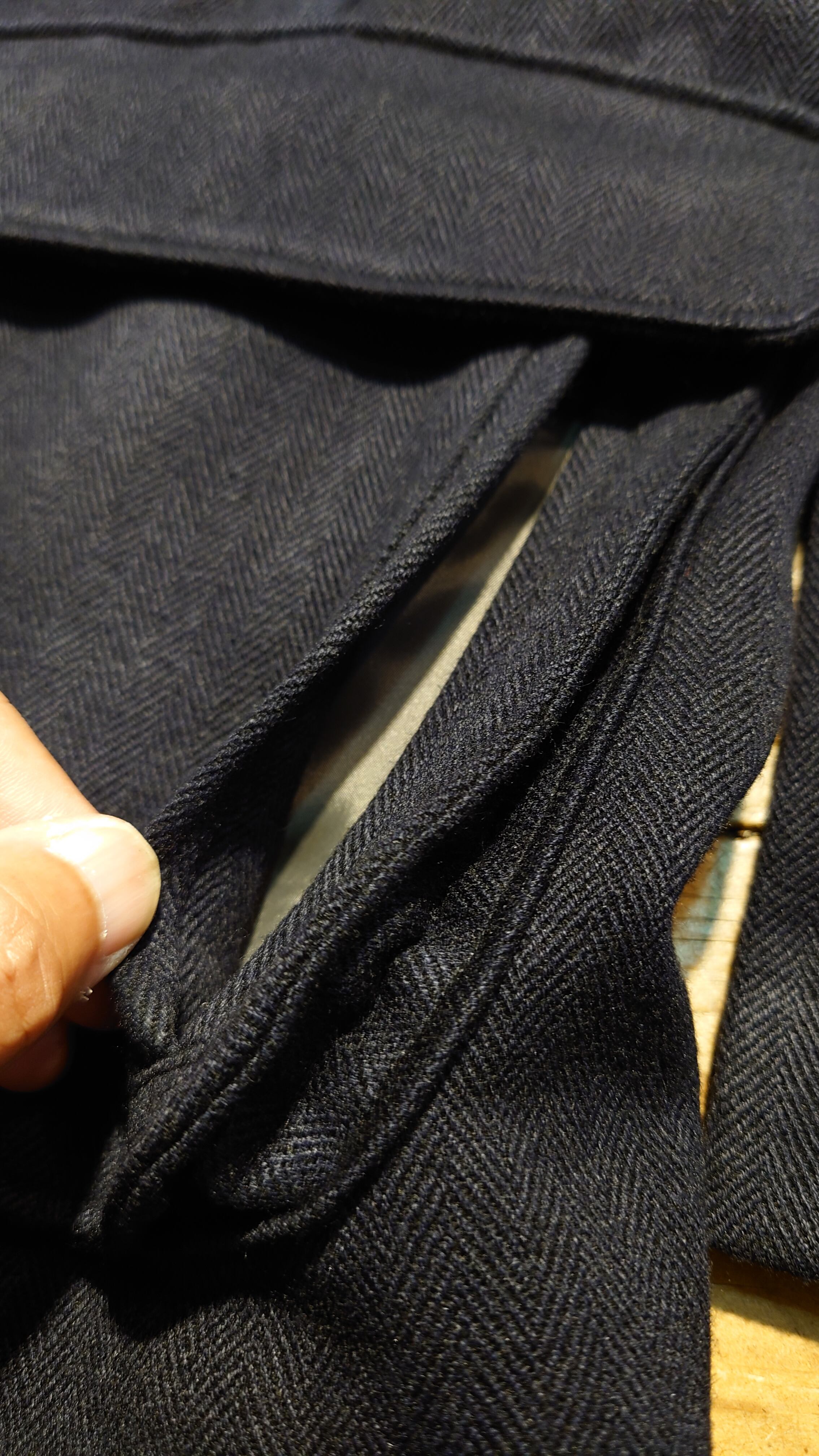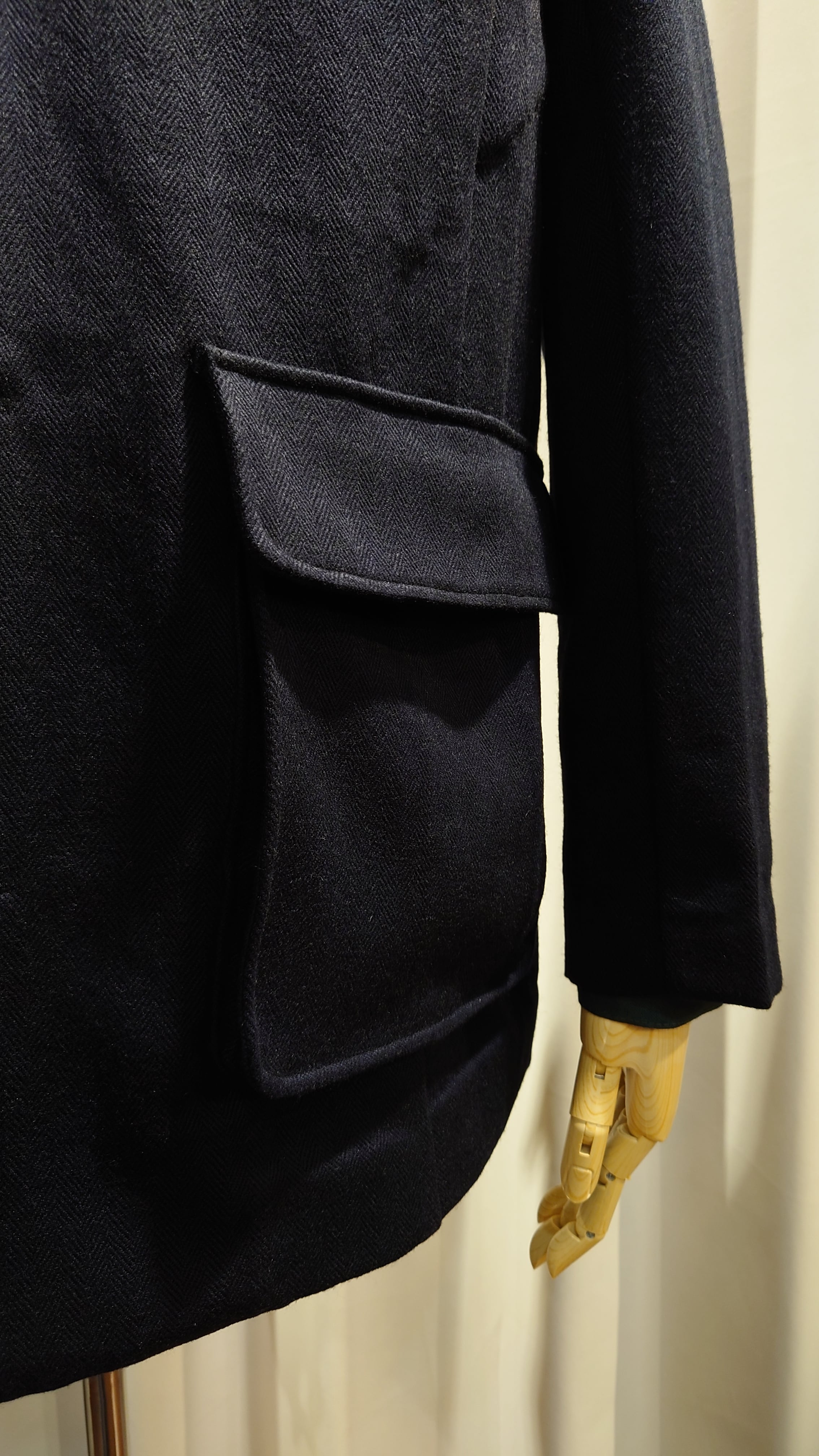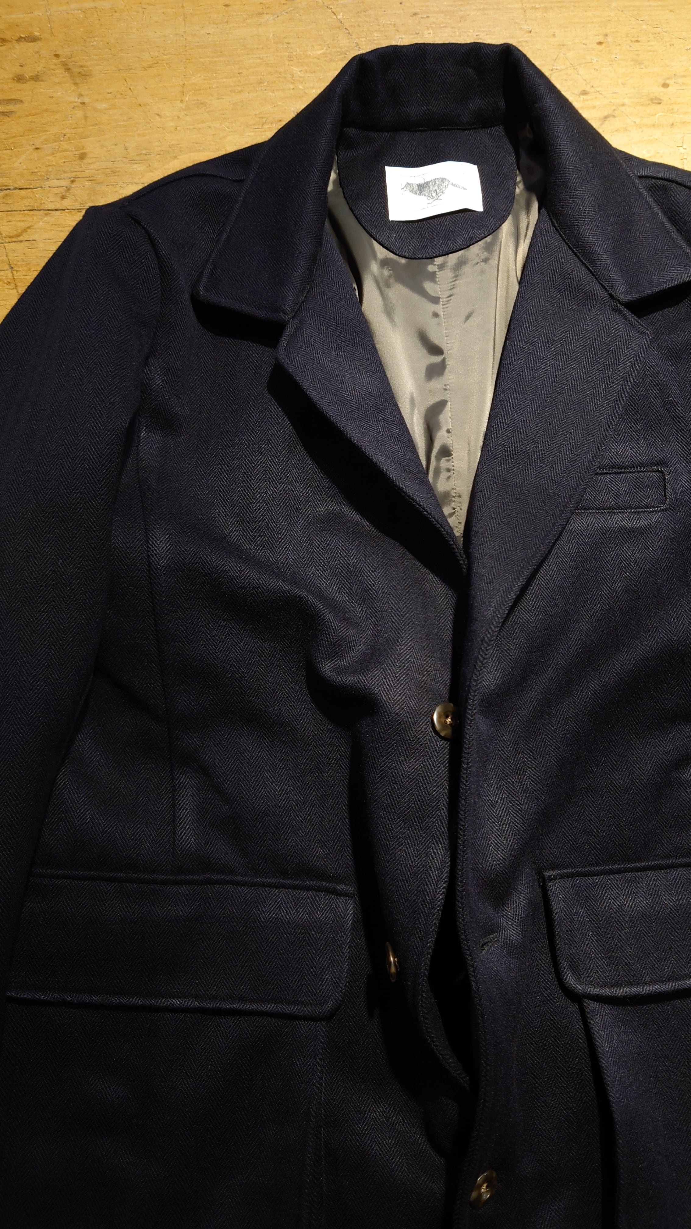 ブラックに近いダークネイビーカラーの厚手で度詰半光沢のコットンウールヘリンボンツイルを使用しています。