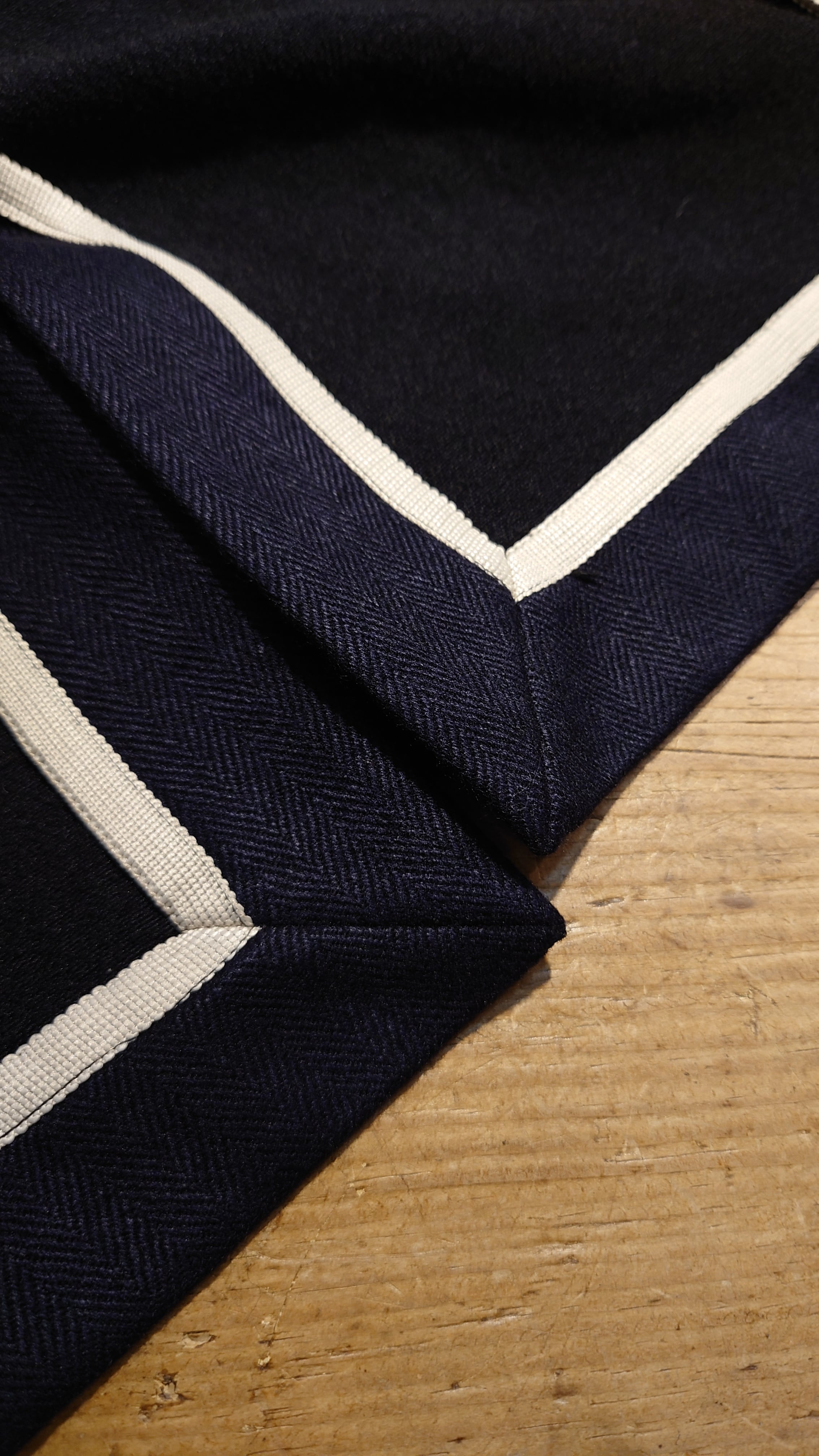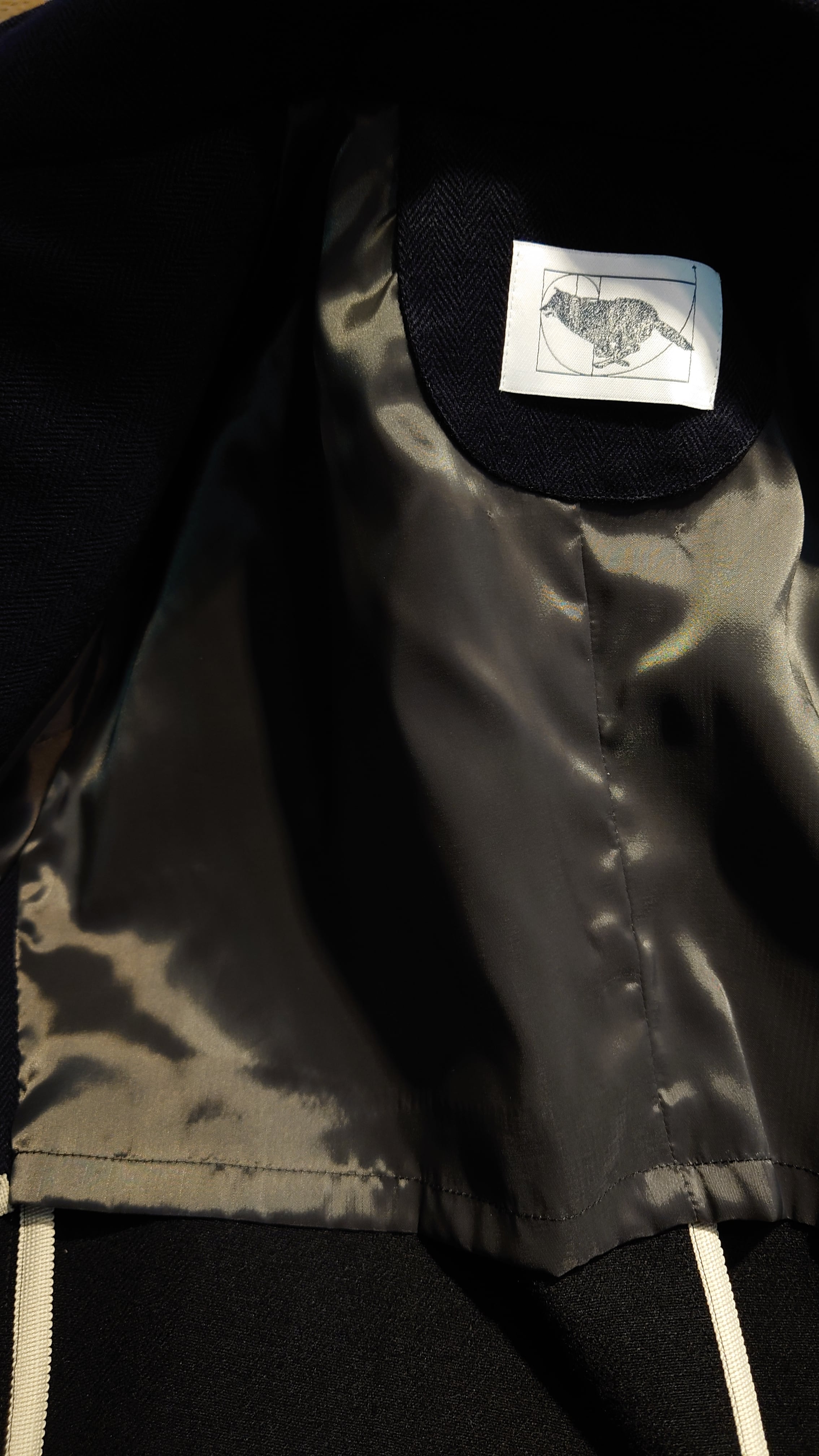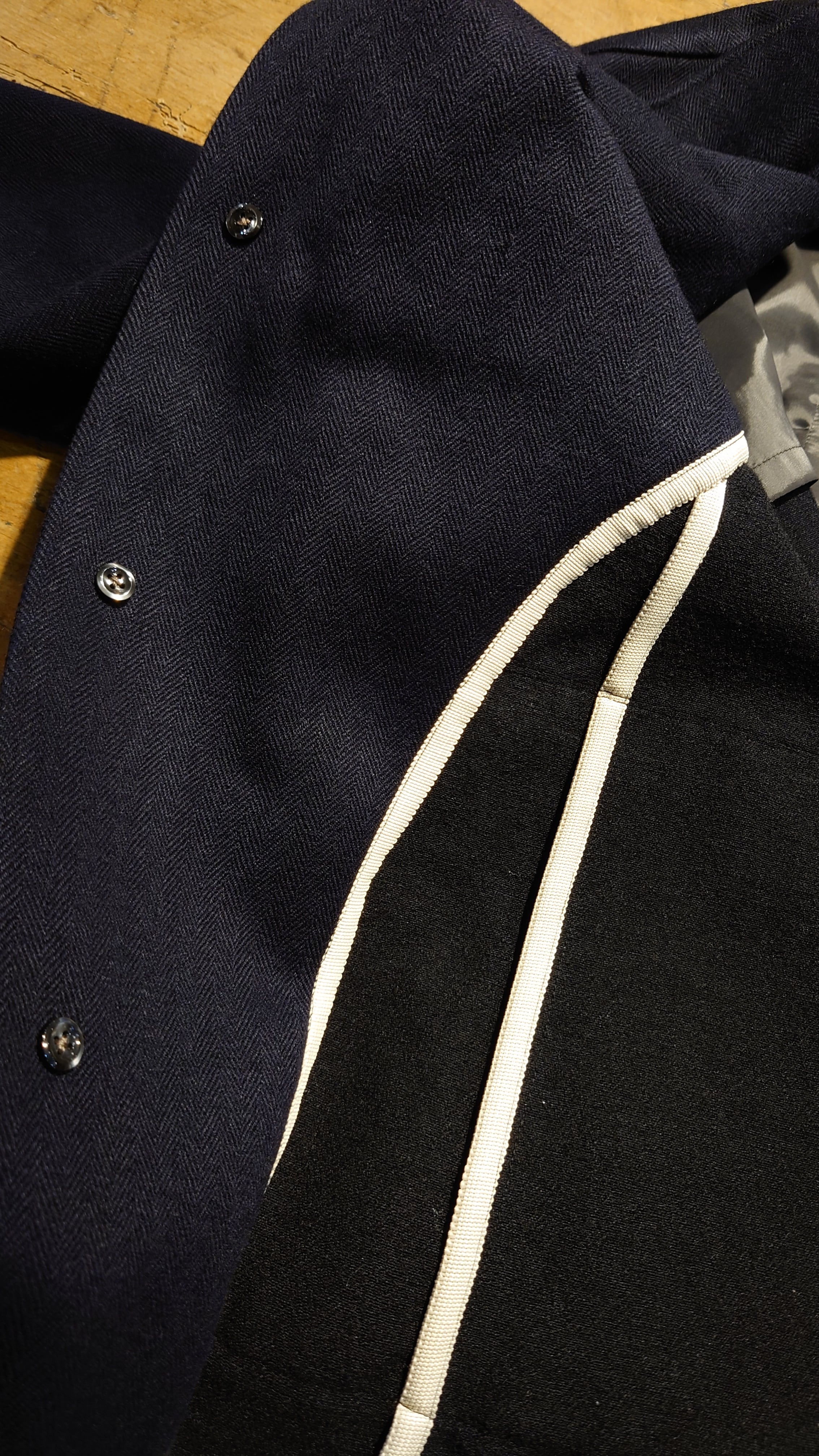 ブラックに近いダークネイビーカラーの厚手で度詰半光沢のコットンウールヘリンボンツイルを使用しています。