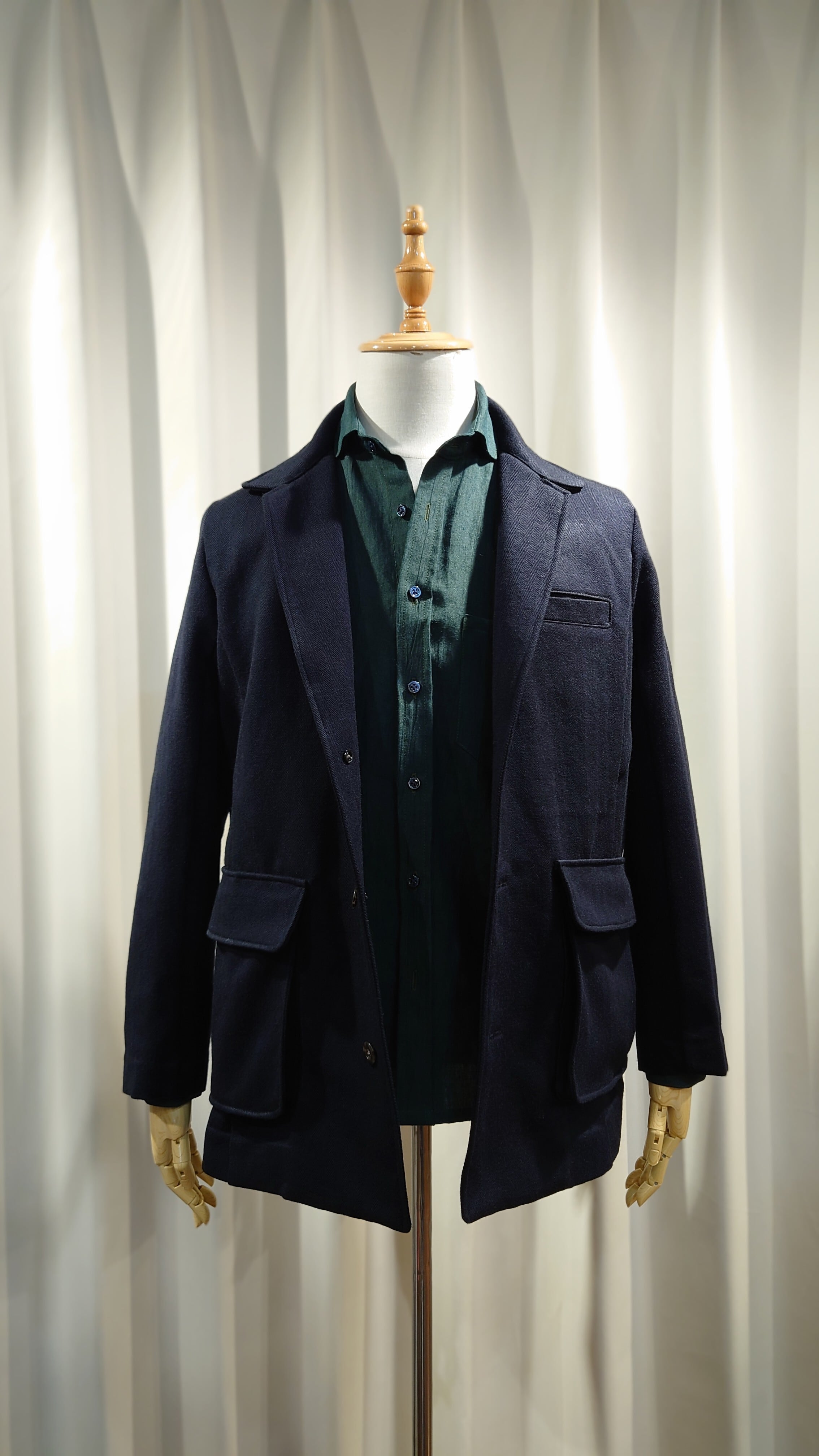 特徴的なボディーのパッチポケットはマチのある立体的なデザイン。物入スペースと両玉縁のハンドウォームポケットのある仕様です。