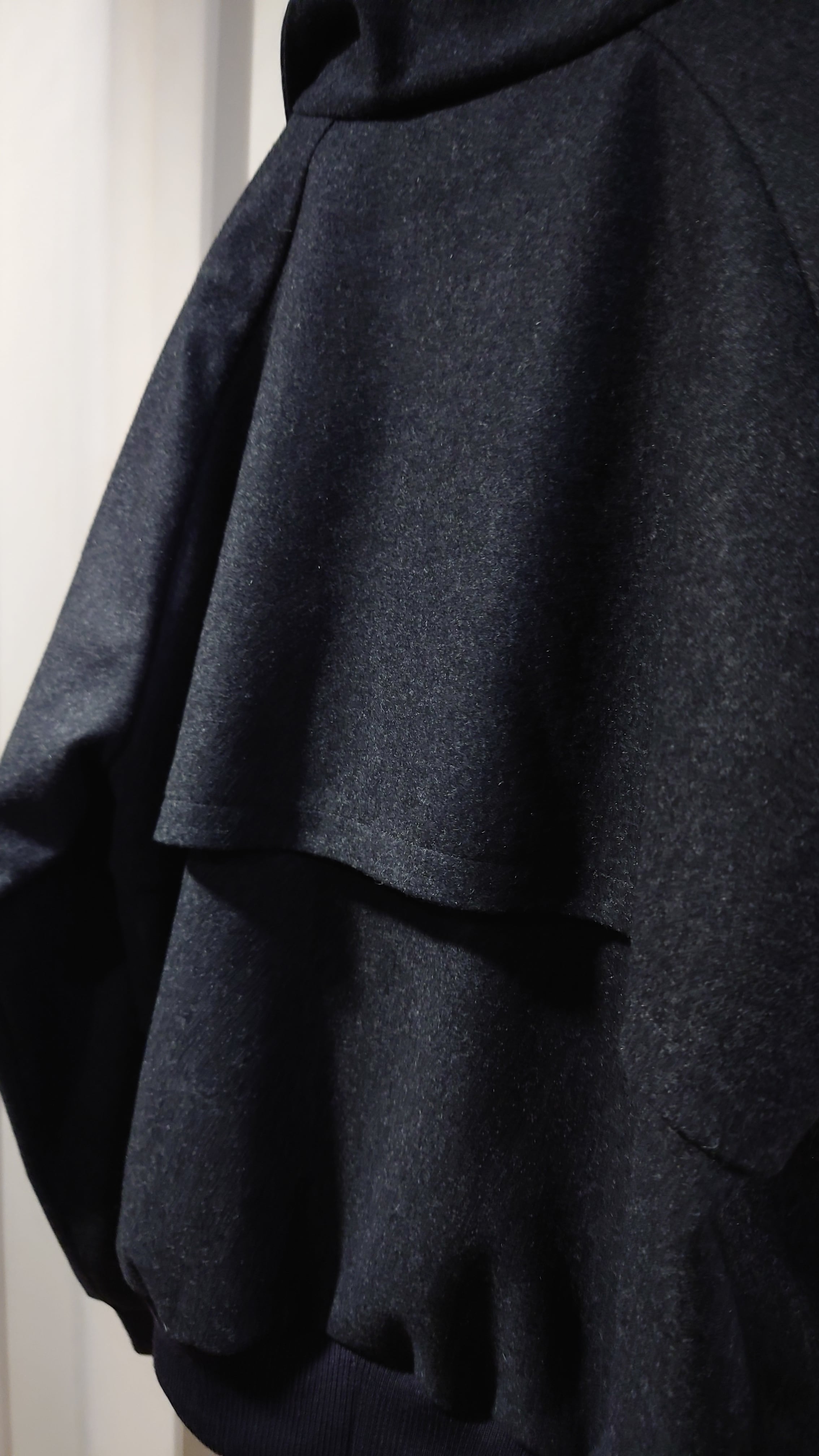 全体にゆったりしたムードのあるフォルム。それに対するショートな着丈、ラグランの幾何学切り替え、トレンチコートのようなバックヨークなどフォルム、ディテールに現代的な解釈を取り入れた意匠があります。