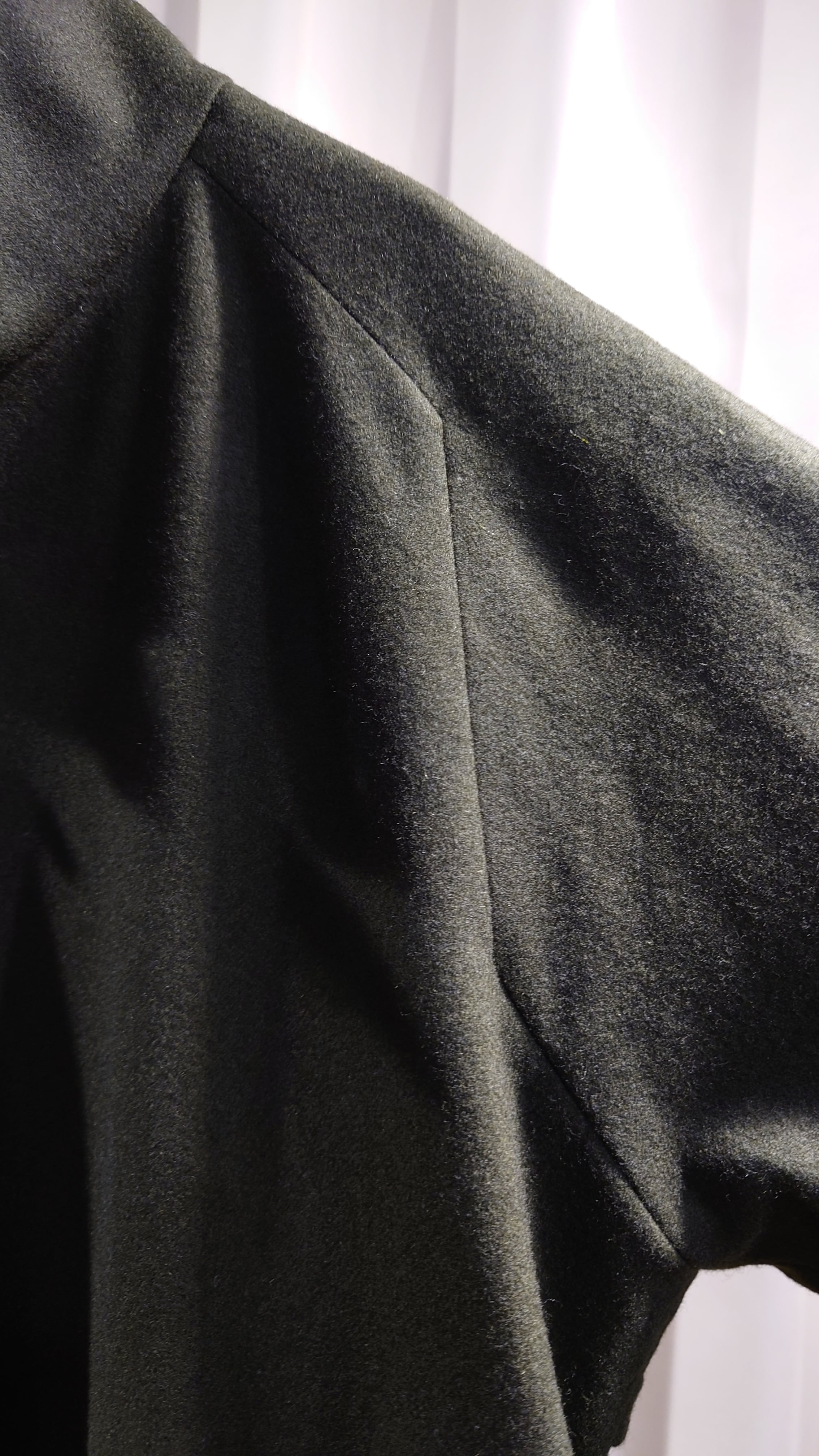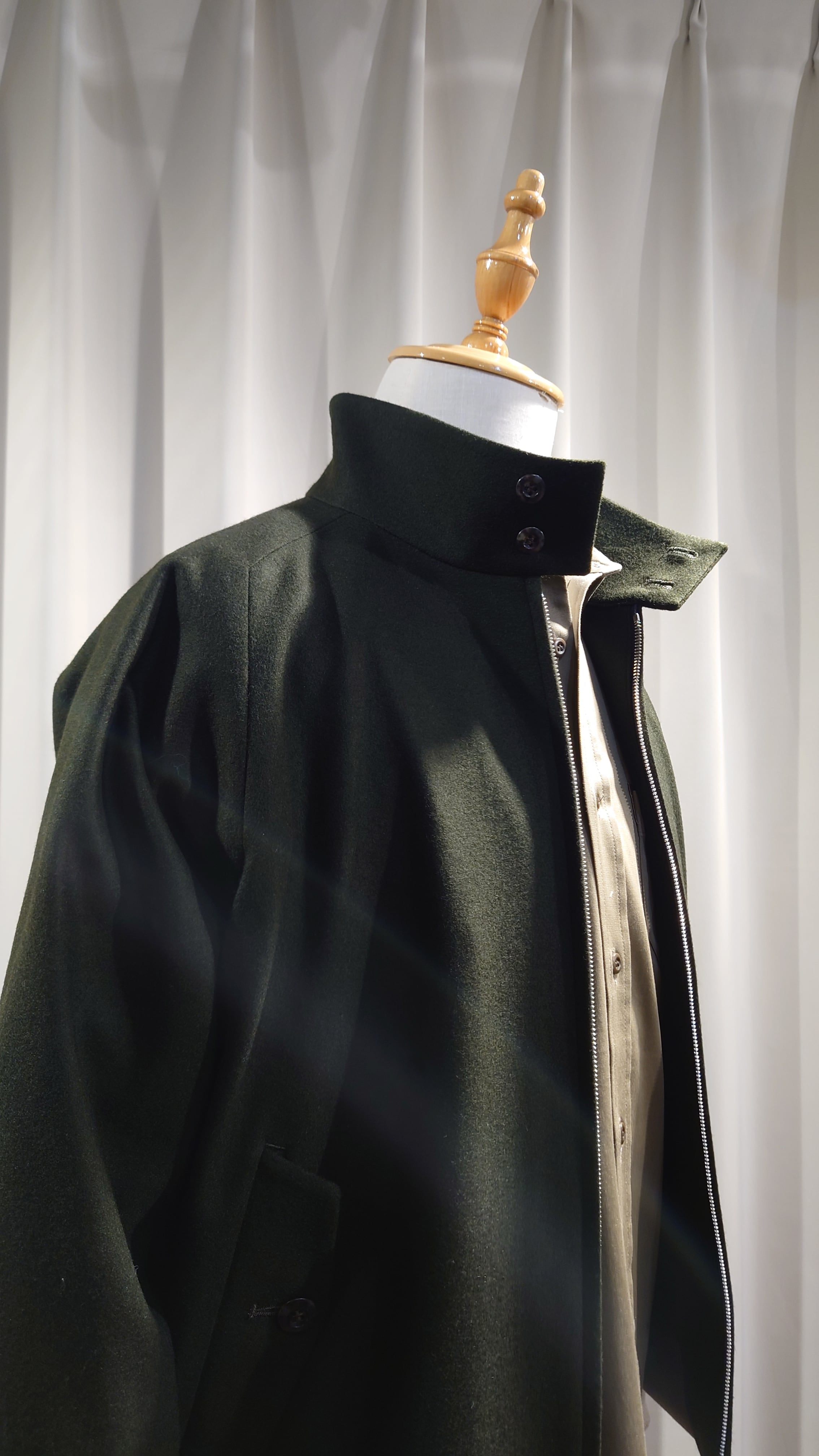 全体にゆったりしたムードのあるフォルム。それに対するショートな着丈、ラグランの幾何学切り替え、トレンチコートのようなバックヨークなどフォルム、ディテールに現代的な解釈を取り入れた意匠があります。