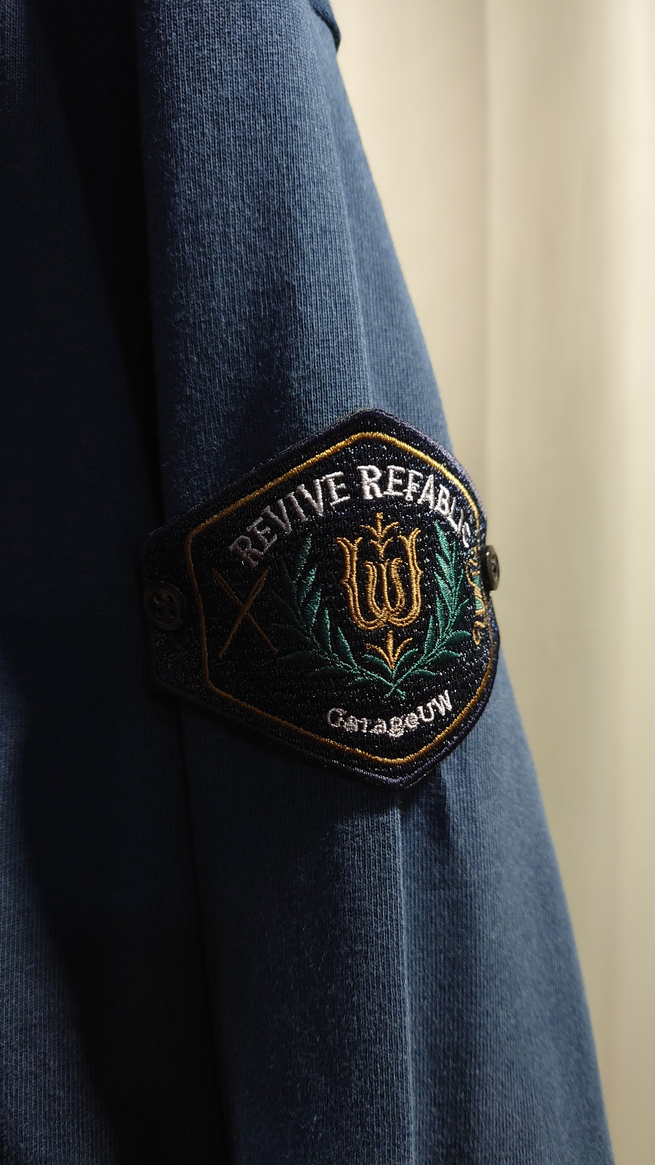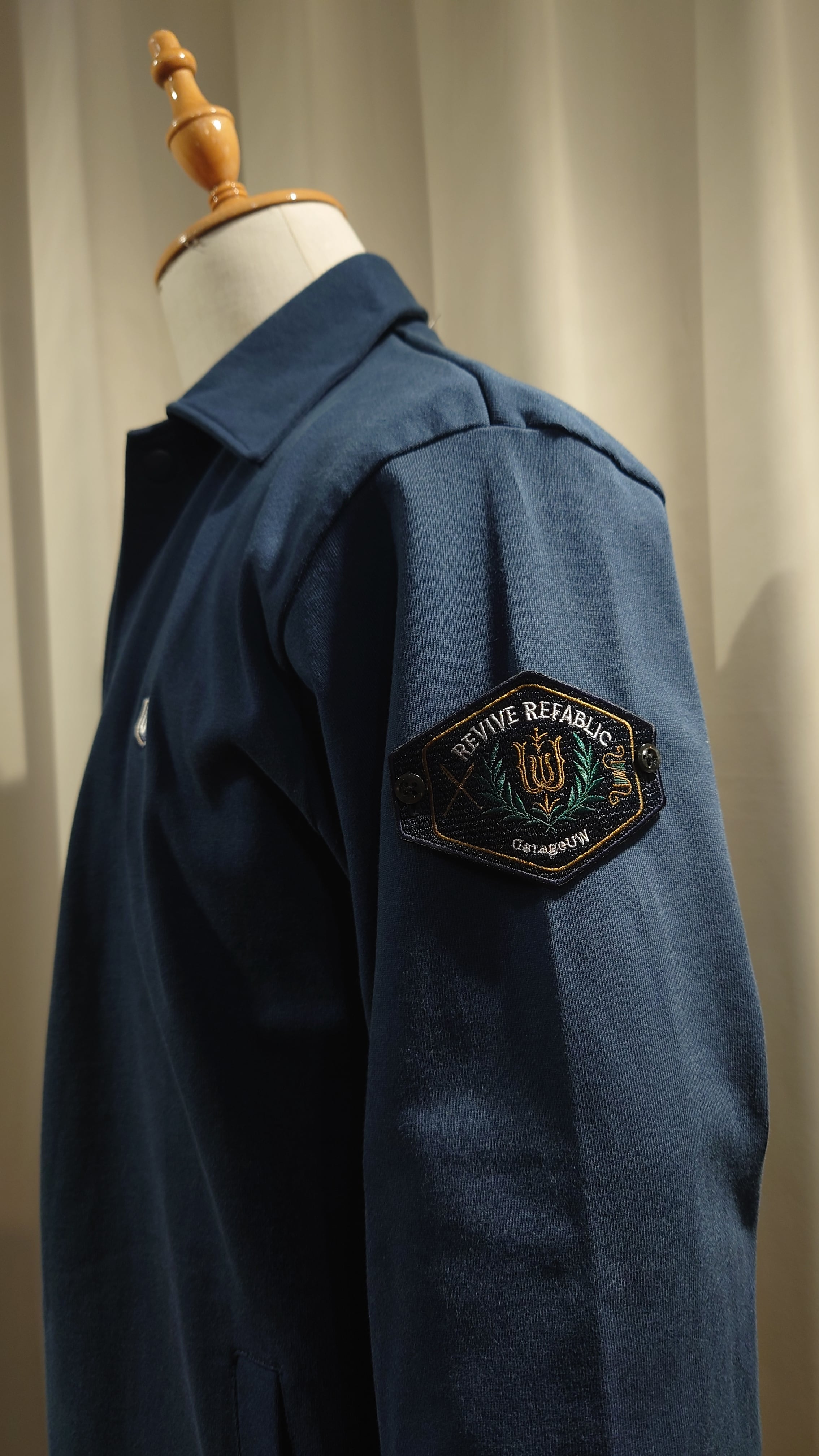 ワッペン腕章、ワンポイント刺繍が特徴のドライブオーバージャケット。ゆとりのあるフォルムでオーバーシャツとカバーオールの中間で羽織りのデイリーさを考えています。ヘビーウエイトな厚みの度詰天竺生地を使用しインナーにもアウターにも置き換わるユーティリティなジャケットです。