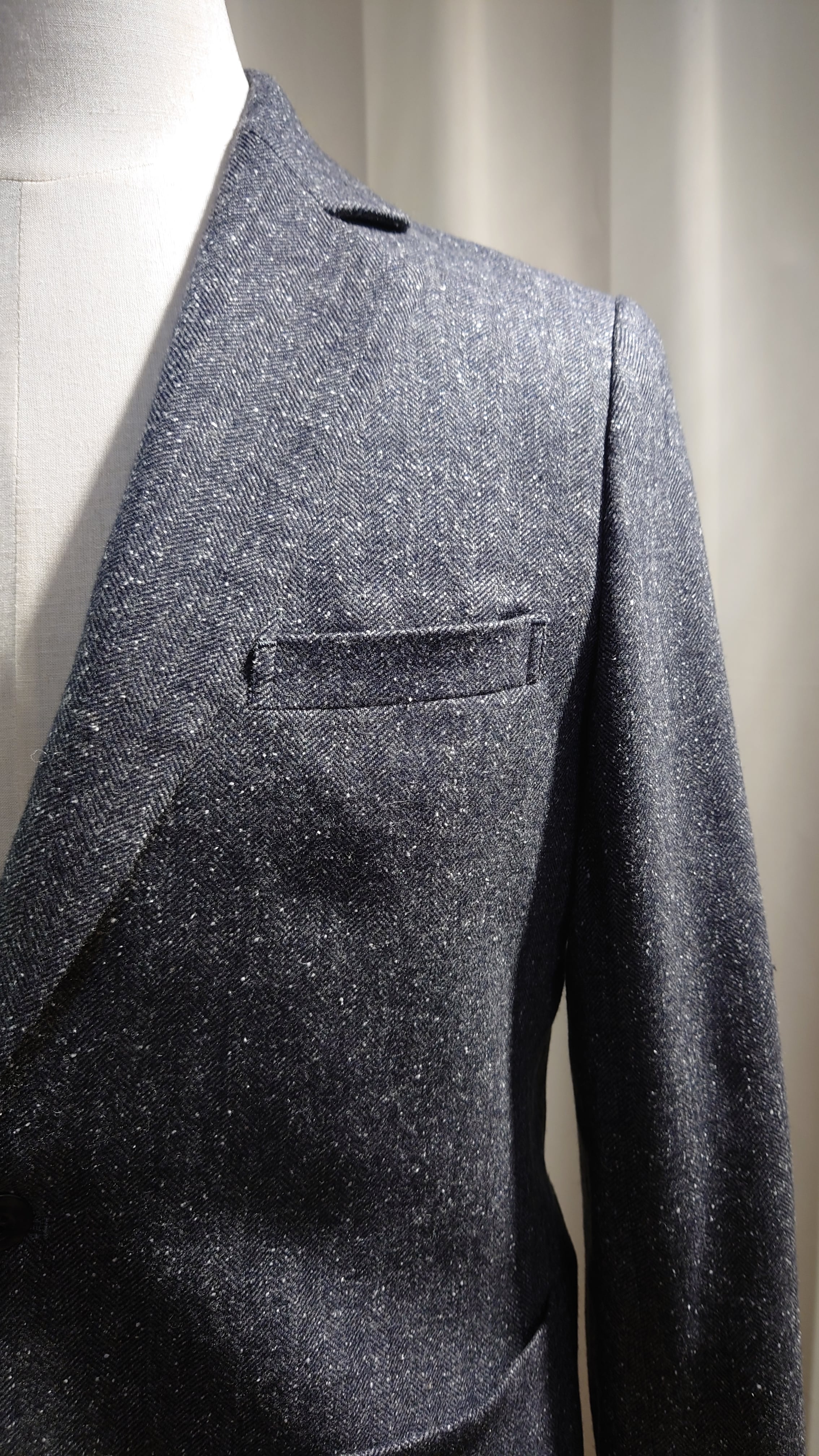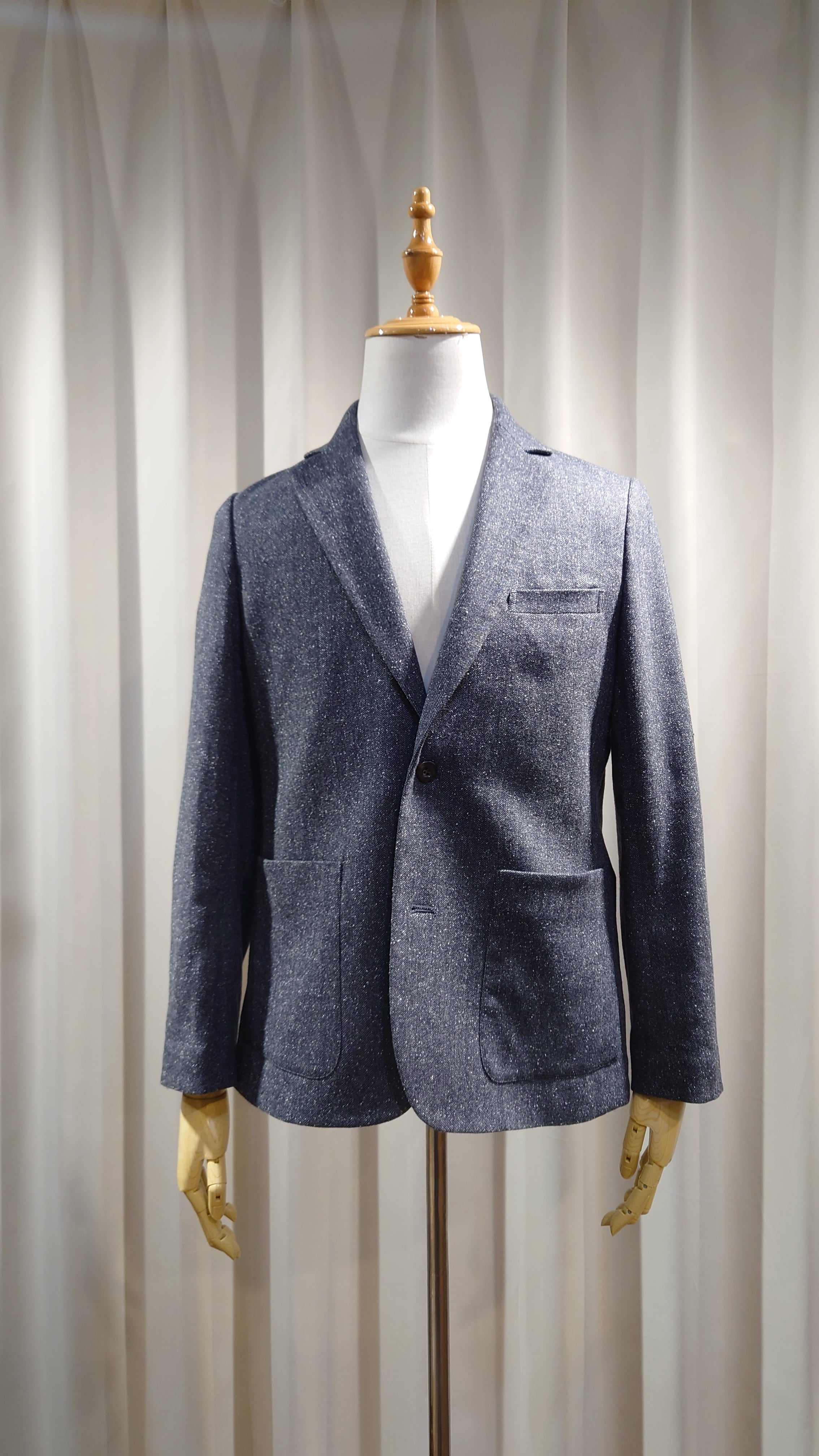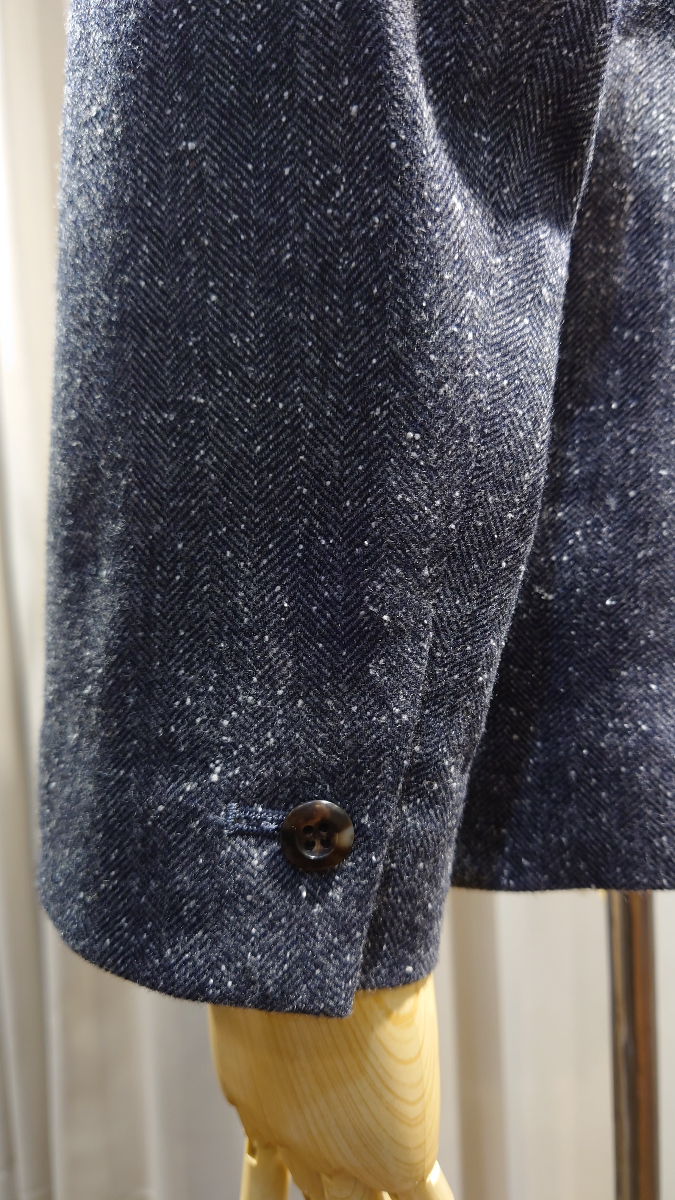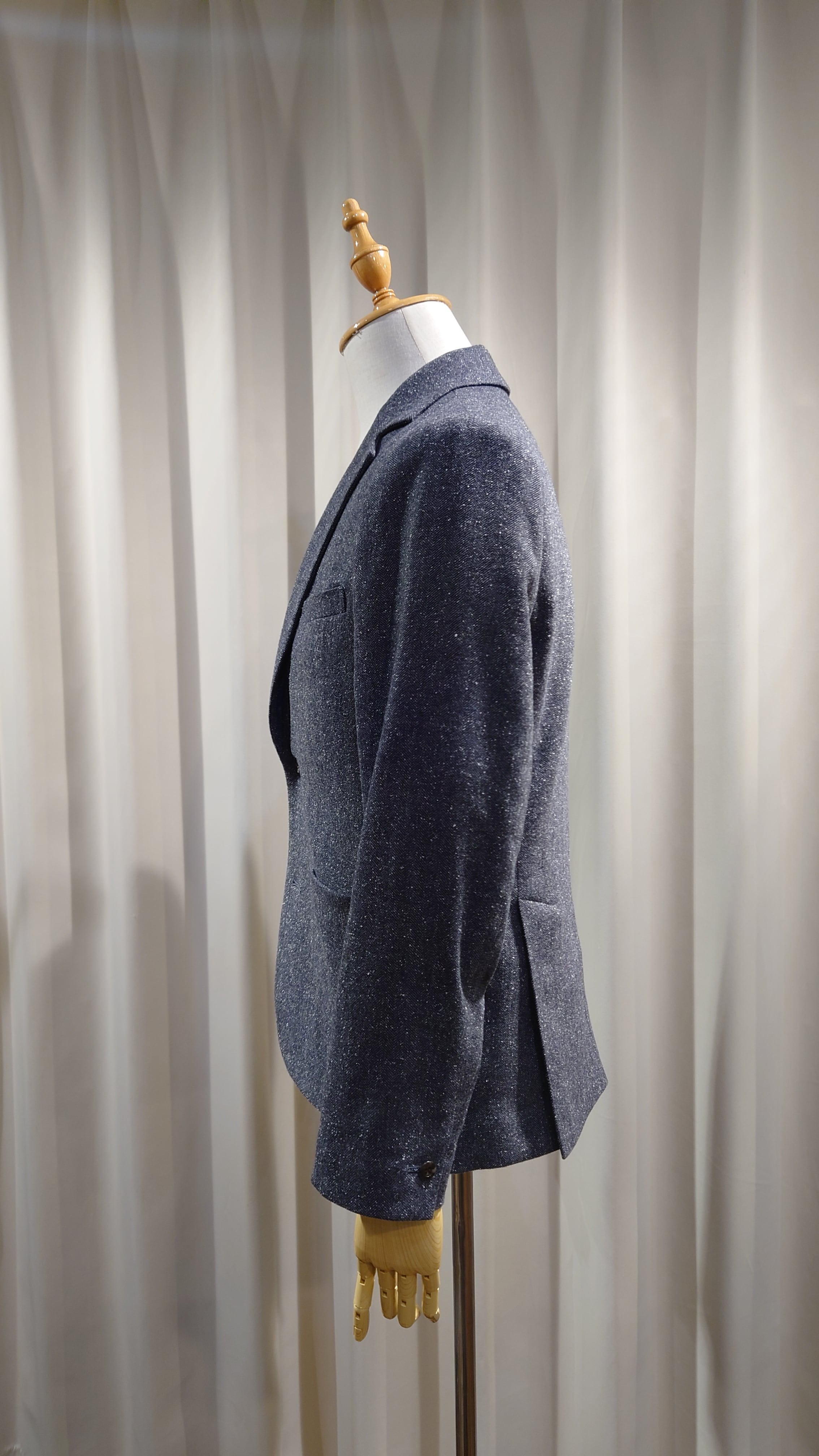 スプリングツイード生地を使用した新規デザインのジャケット。通常の冬用ツイードに比べとても軽くふんわりとしたタッチの生地です。フレンチスタイルの2B、サイドベンツ、フルライニング、ライニングはキュプラを使用しオールシーズンの仕様になります。