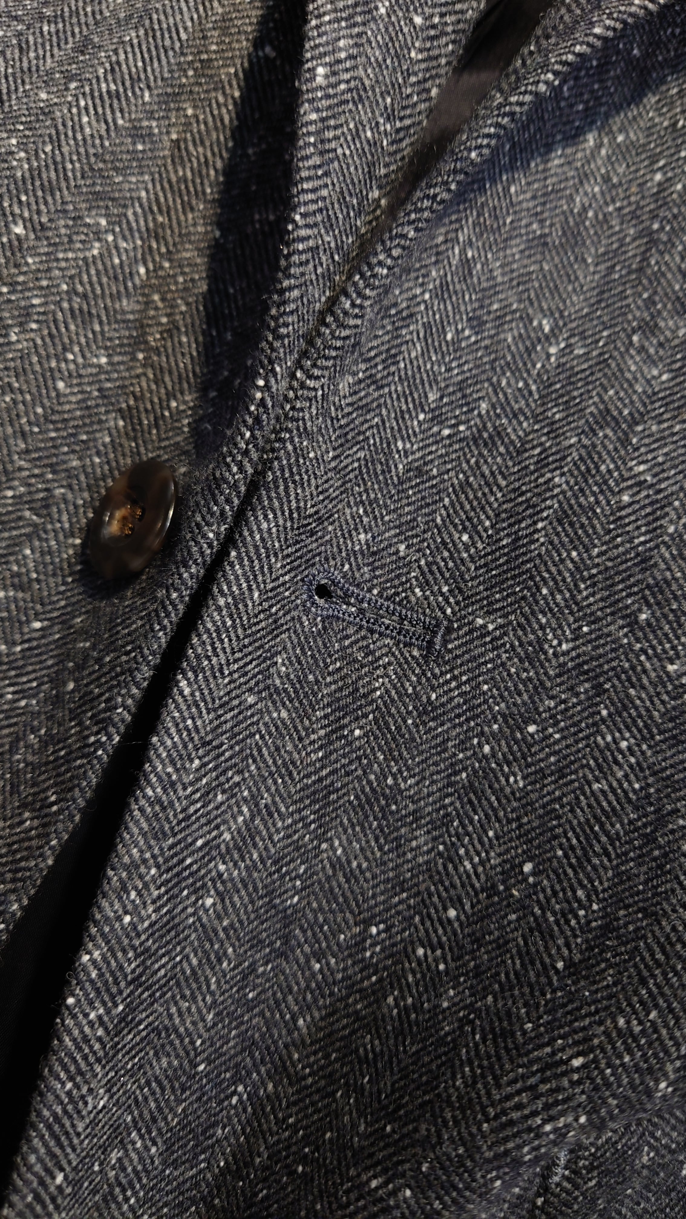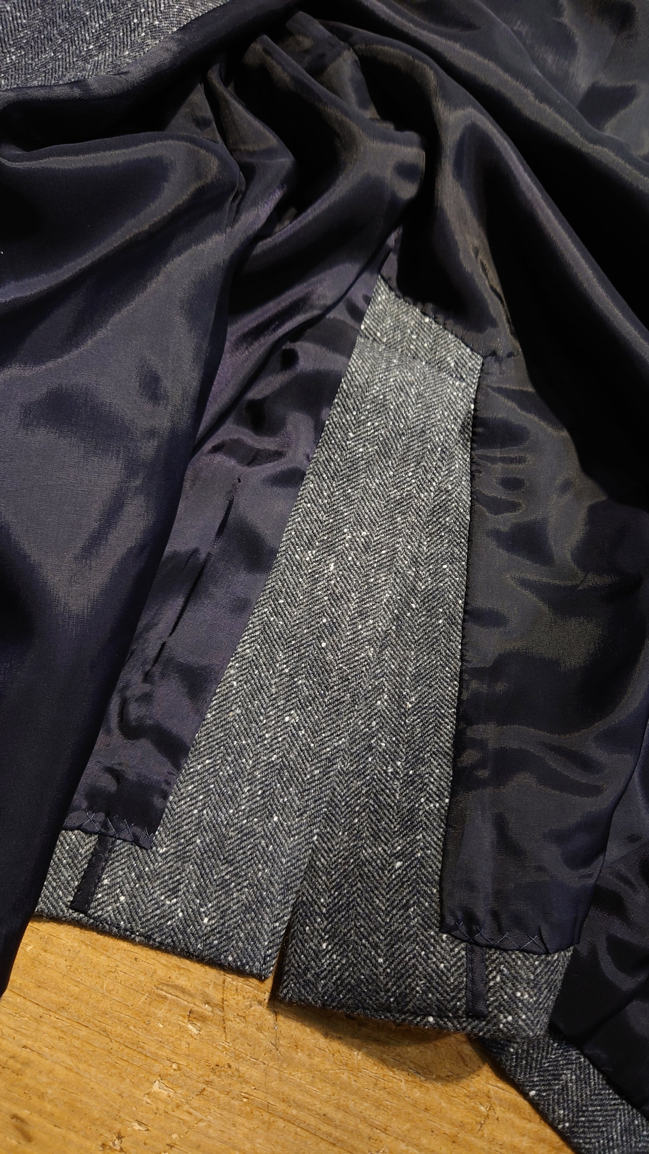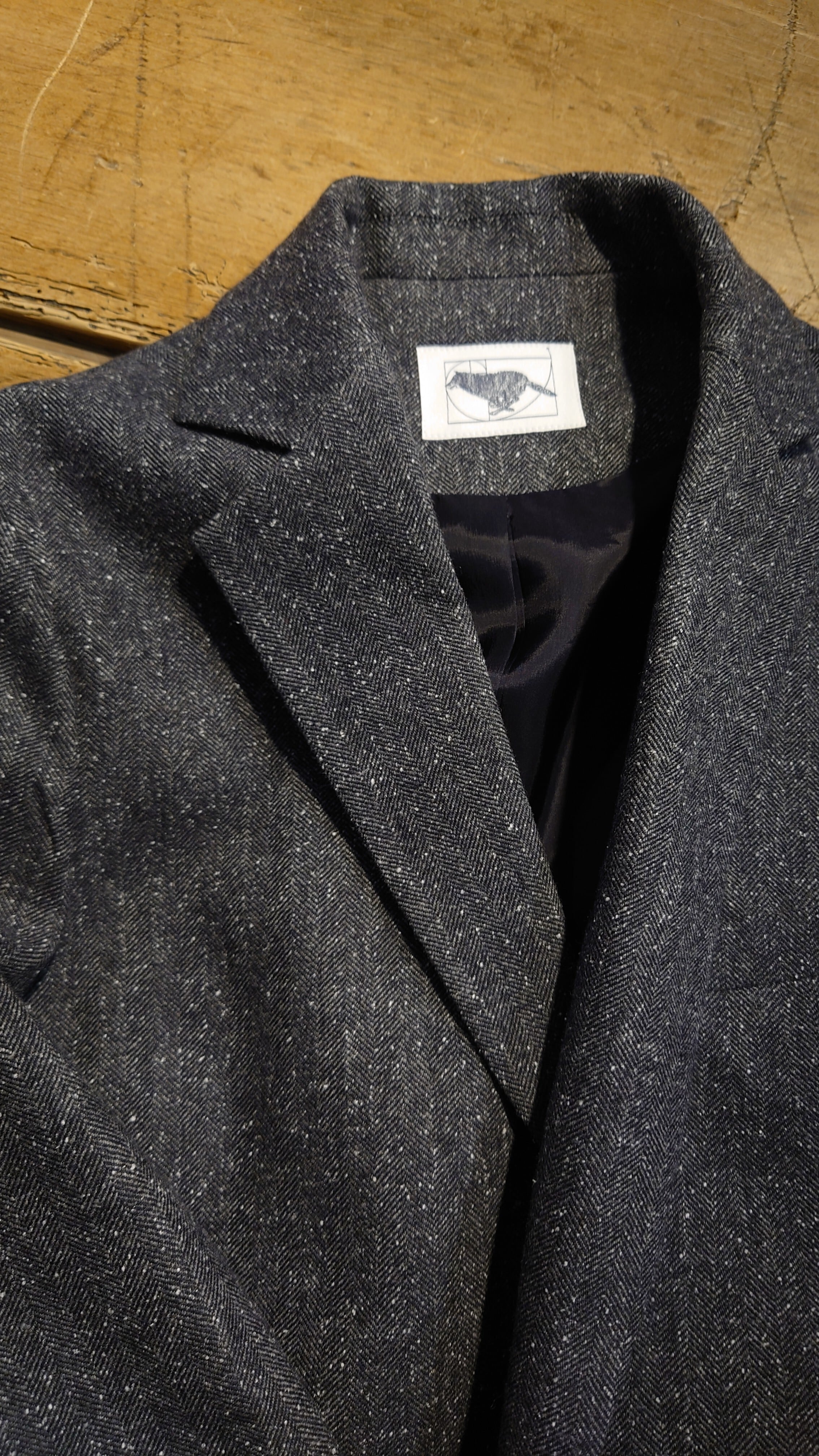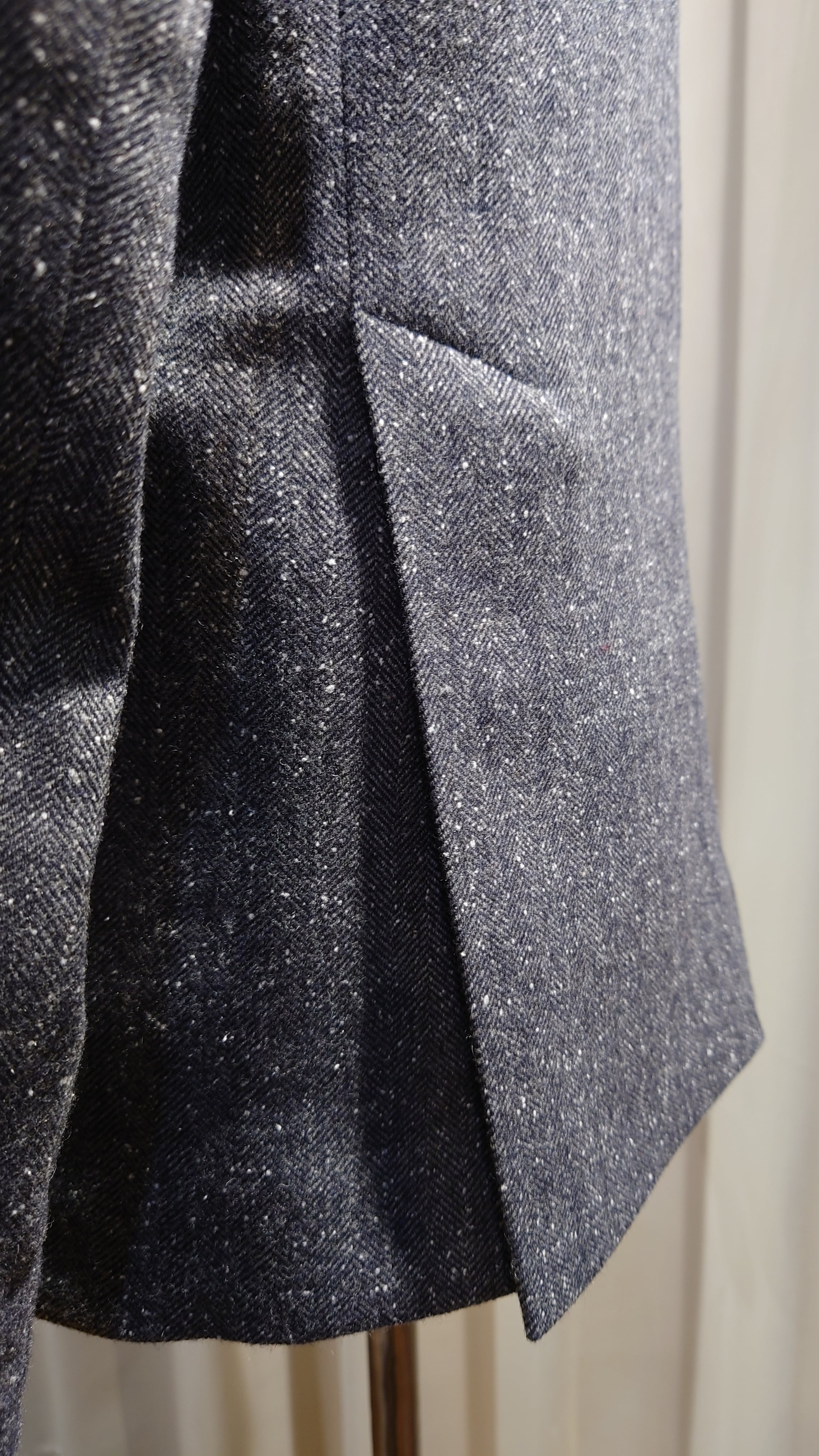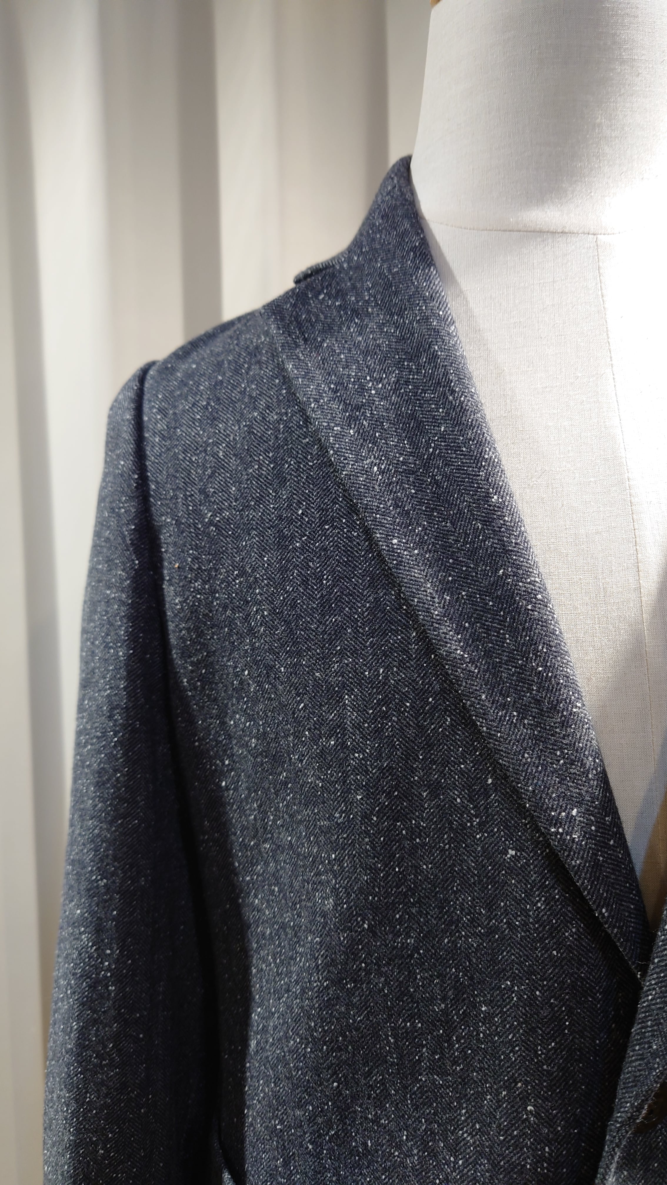 スプリングツイード生地を使用した新規デザインのジャケット。通常の冬用ツイードに比べとても軽くふんわりとしたタッチの生地です。フレンチスタイルの2B、サイドベンツ、フルライニング、ライニングはキュプラを使用しオールシーズンの仕様になります。