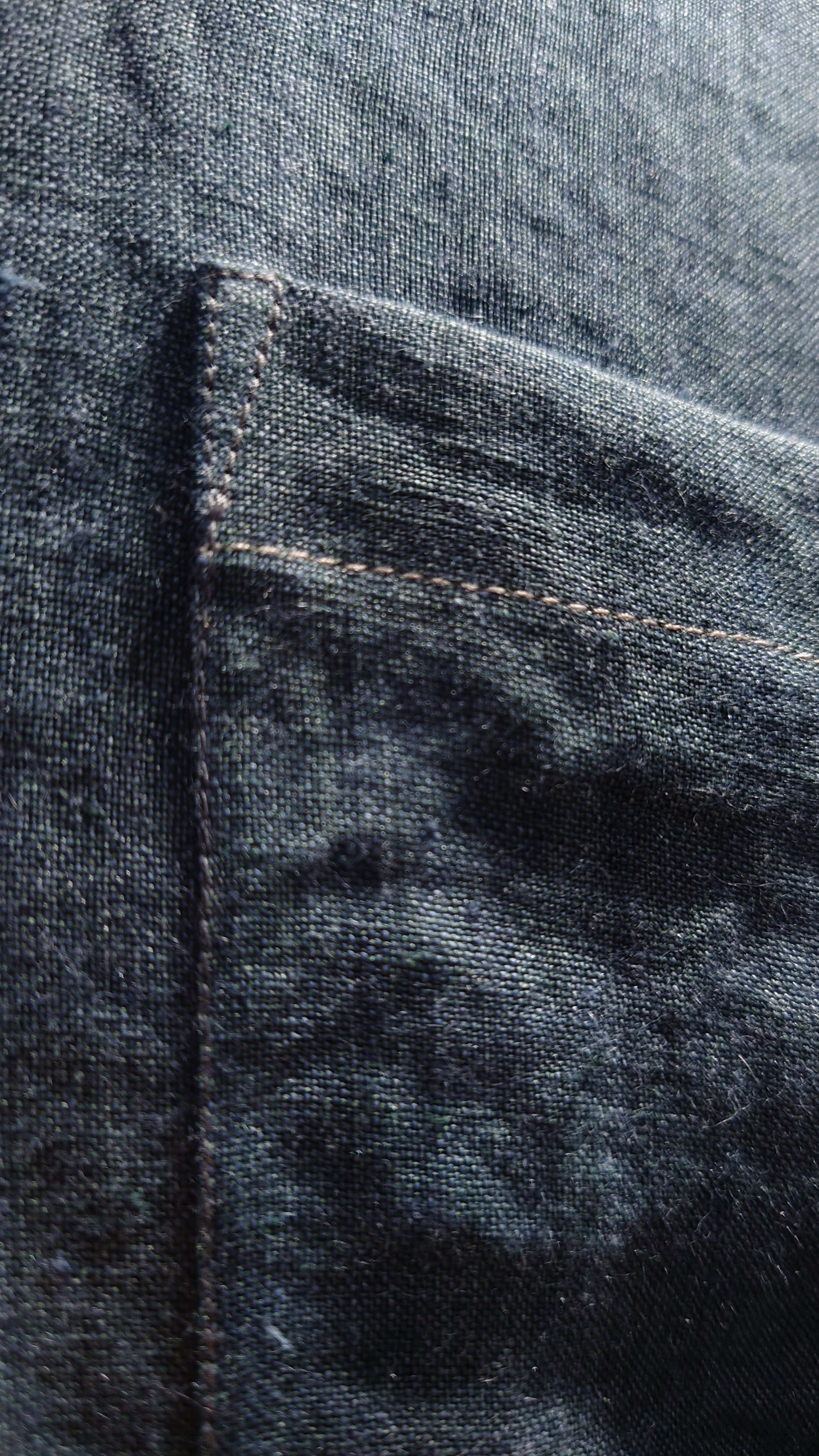 手作業で生地を裁断(一枚断ち)全行程を一人で縫い上げる(丸縫い)工芸的なプロセスで作られている一着です。量産や効率化を主体に精確な製品を仕上げる工業製品とは異なり、希少性やデザイン性を優先し手間や非効率なディテールを以て生産しています。