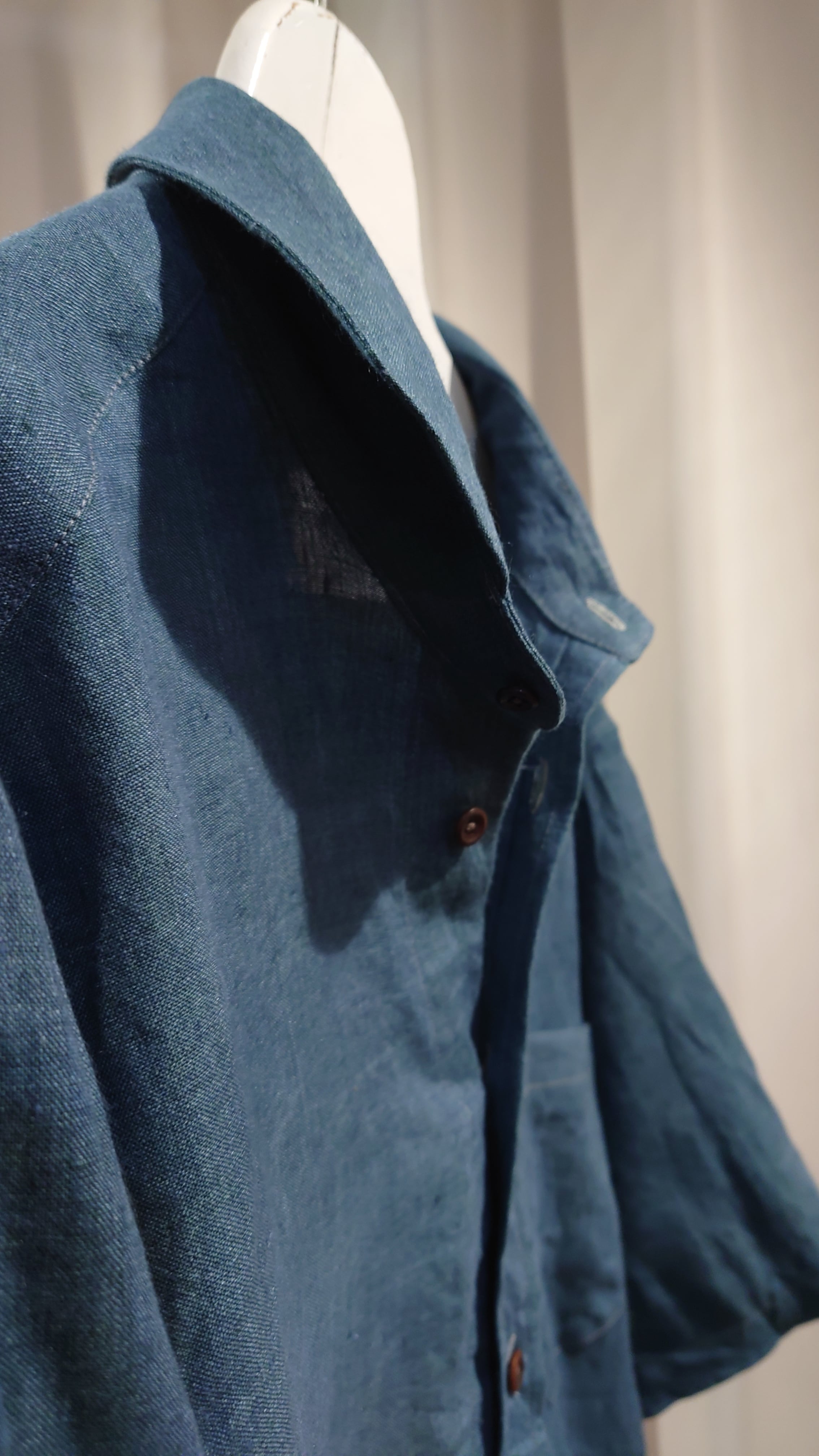 片岡毛織デットストックリネン生地を使用したカッタウエイ型シャツです。ノンシャランを表現すべく芯地の使い方に技巧を凝らしました。手染めの深い皺とグレーグリーンの味わい深い発色。麻の上質な風合いと厚手の張りがもたらす独特な存在感のあるシャツを仕立てました。