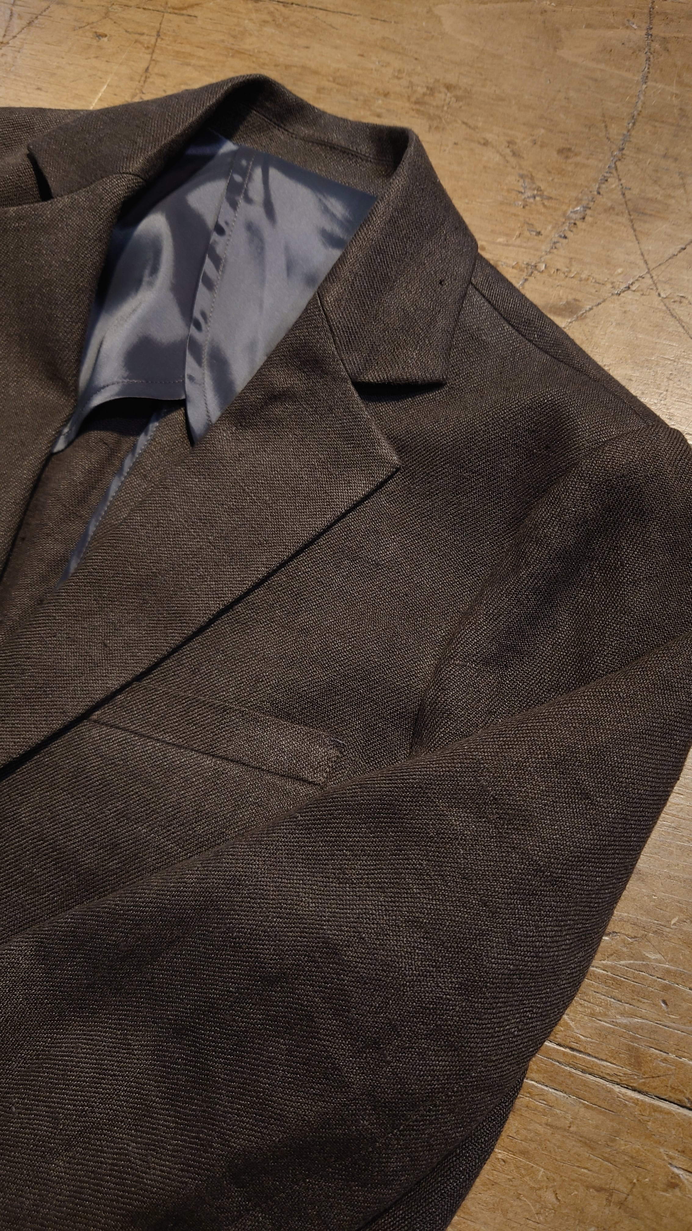 片岡毛織のデットストックラミーリネンを仕様した新規デザインのジャケット。ヴィンテージ感のあるネップ麻生地の風合い。フレンチスタイルの2B、サイドベンツ、背抜き、ライニングとパイピングはキュプラを使用しオールシーズンの仕様になります。