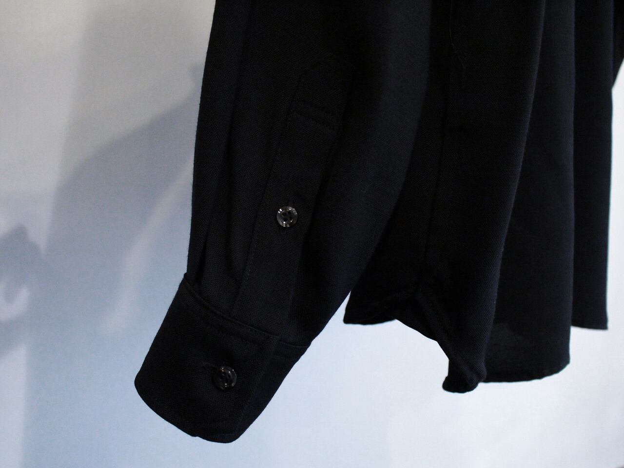 ウール混ポリエステルタック生地を使用したアウターシャツです。カッタウエイ型襟デザインとニットジャージの生地感に特徴があります。 布帛(シャツ生地)と違いドレープ(落ち感)のある生地特性で、季節の変わり目にカーディガン感覚で羽織るのに丁度良いシャツアイテムです。 ひとつひとつ手刺繍で釦付けをしています。