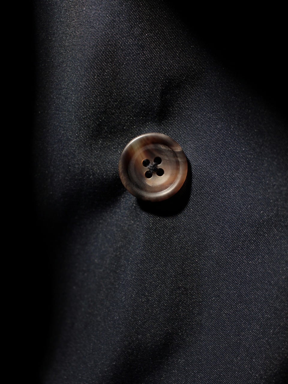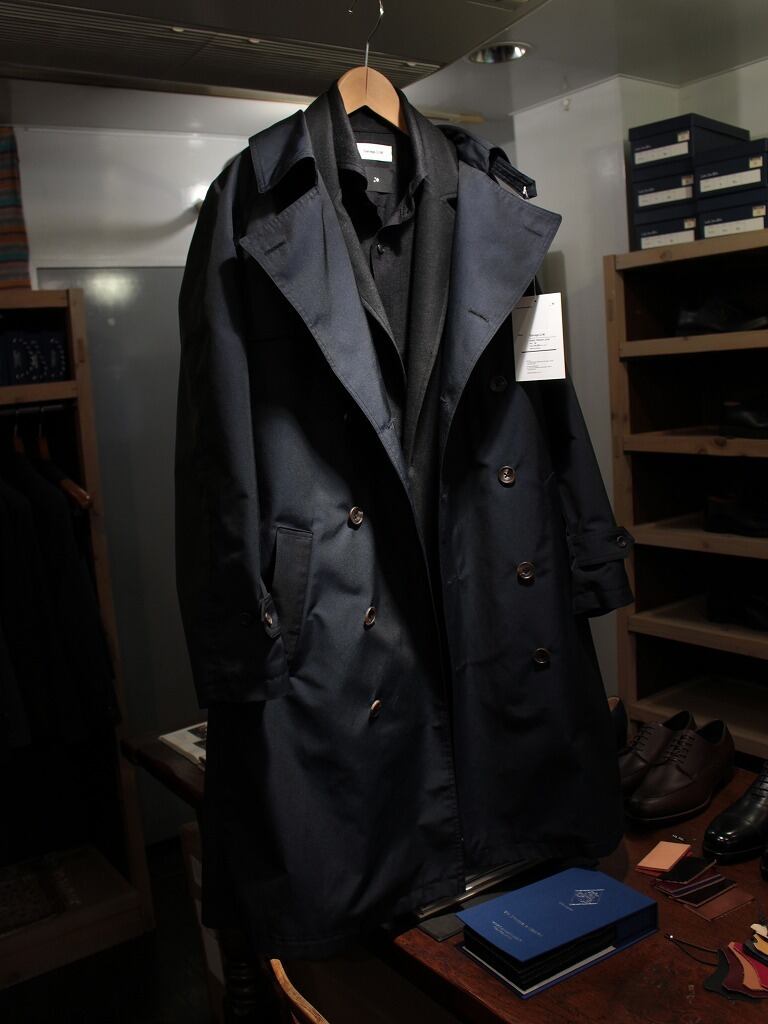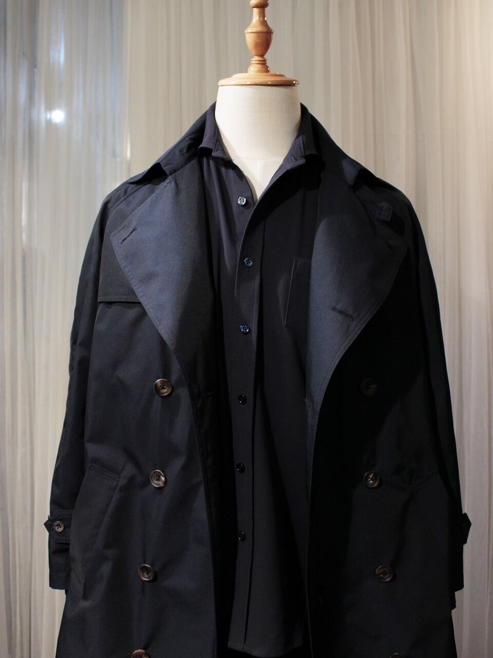 光の当たる角度で色調がネイビーからカーボンブラックに変化する上質感ある175g/㎡の7双高密度ギャバジン。その色調変化を最大限活かしたいと考え、ひざ下丈の空気感のあるシルエットのベルトレス仕様にデザインしています。
