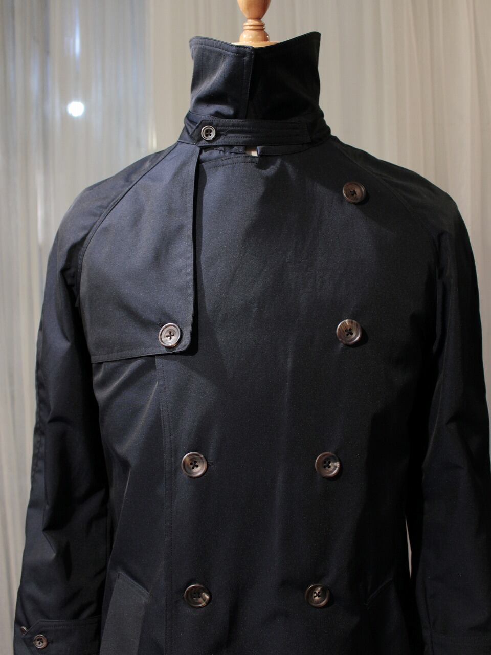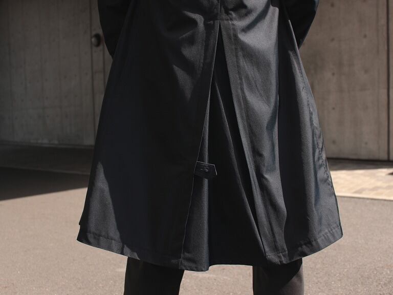 ウエストベルトが無い事を補うディテールがバックのロングプリーツベント。動きに合わせて揺らめくバックの長いベントと変化する色調はGABA TRENCH COAT の大きな特徴です。