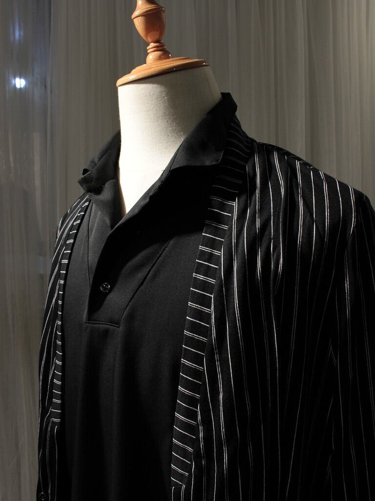 テーラードジャケットを基本設計としたフォルムで、ラペルの名残を匂わすノーカラーデザイン、テーラ―ドジャケットの2枚袖の仕様になっています。