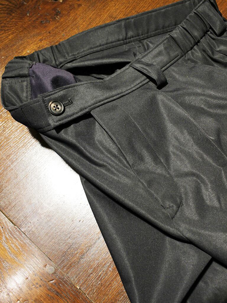 高密度ポリエステルウェザーストレッチ(通年着用可)を使用したシャーリングトラウザース。鈍い半光沢の特徴のある生地感です。
