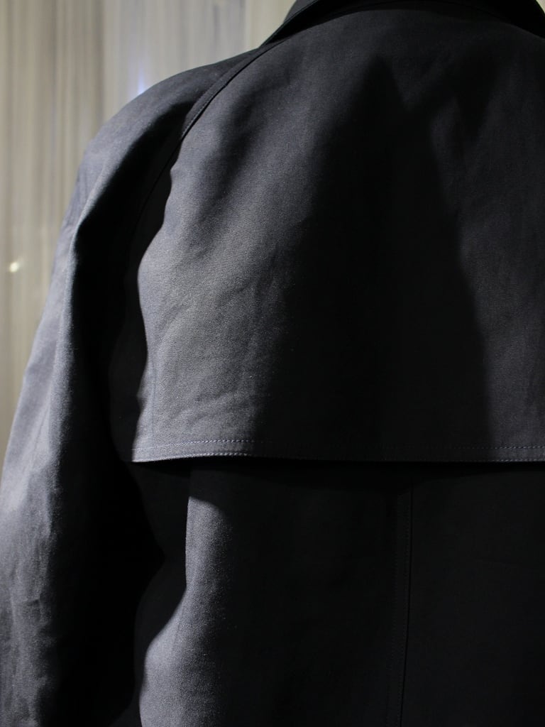 エポーレットやウエストベルトを廃し、ゆとりや立体感のあるフォルム、バックヨーク、ラグランスリーブ、台襟の仕様などルーツに着目したディテールなどを+-した現代的表現のトレンチコートです。