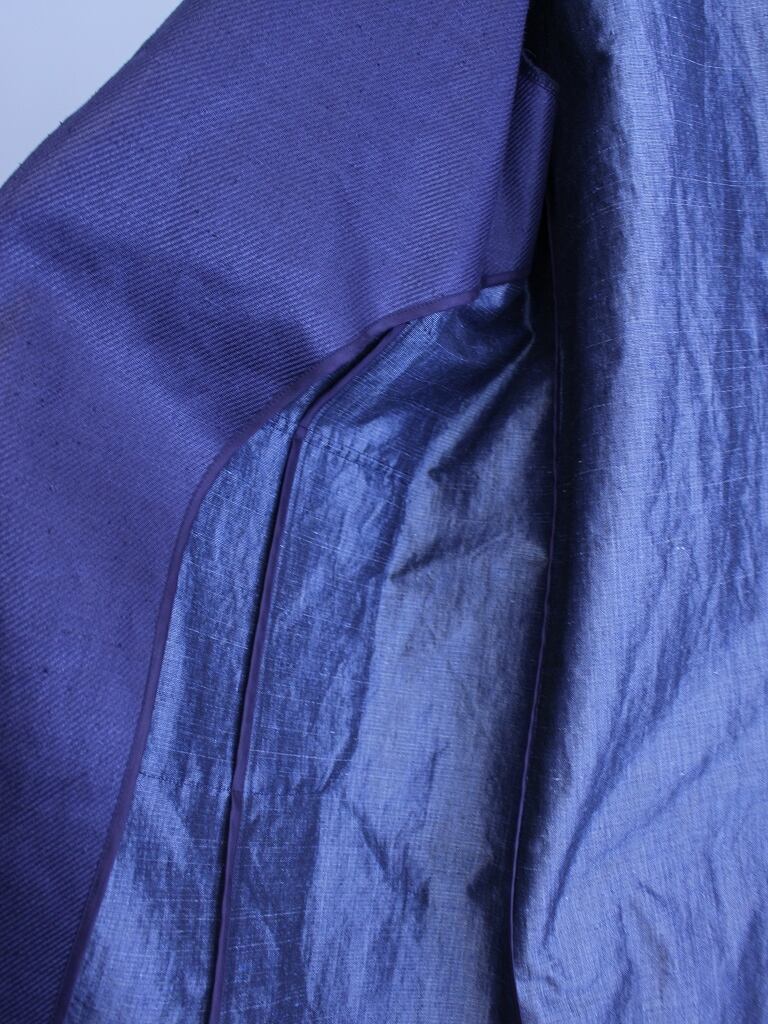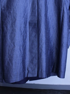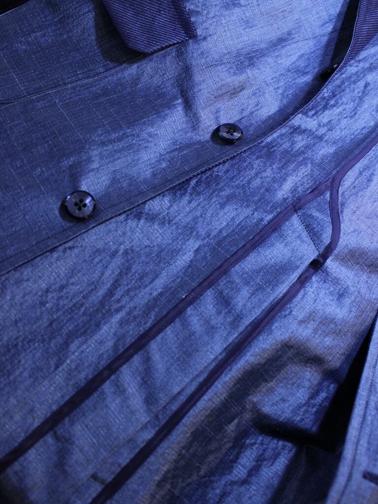 レーヨン・ナイロン組成で、リネン(ラミー)のようなタッチ。磨いて出るような鈍い光沢を発する既視感の無い独特な生地です。