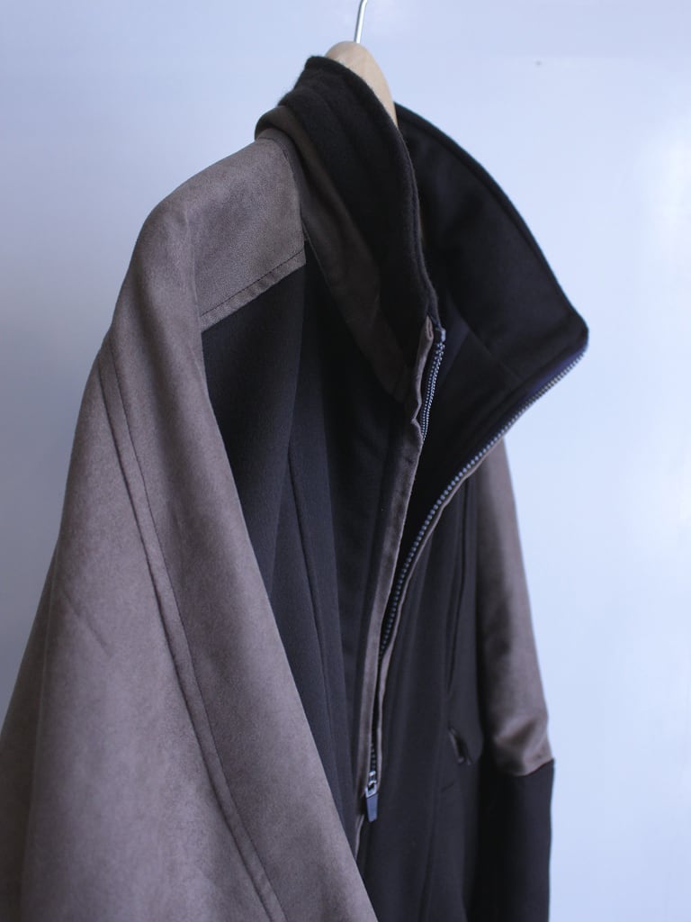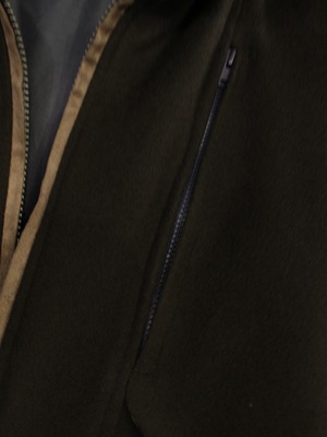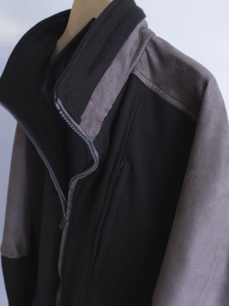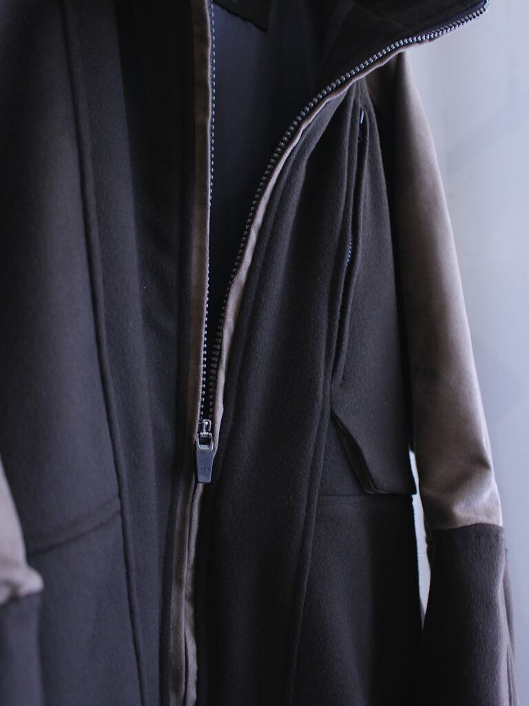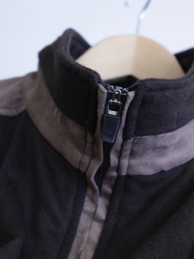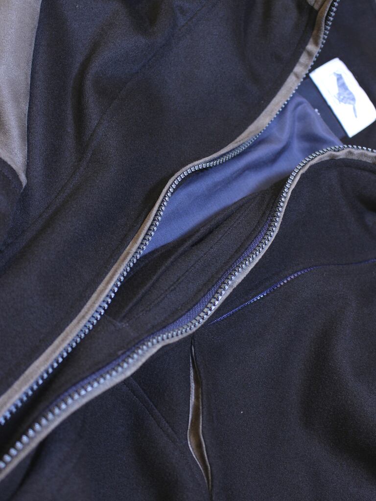 ファスナーはビスロンメタルコーティング版を使用しており、金属のような質感と樹脂の滑らかなタッチです。胸ポケットのみブルーグレーの差し色になっています。(ファスナーの縁は両玉縁仕様になっており通常ファスナーエレメントは隠れるようになっています)※46サイズのみ胸ファスナーがコンシールファスナーになります。