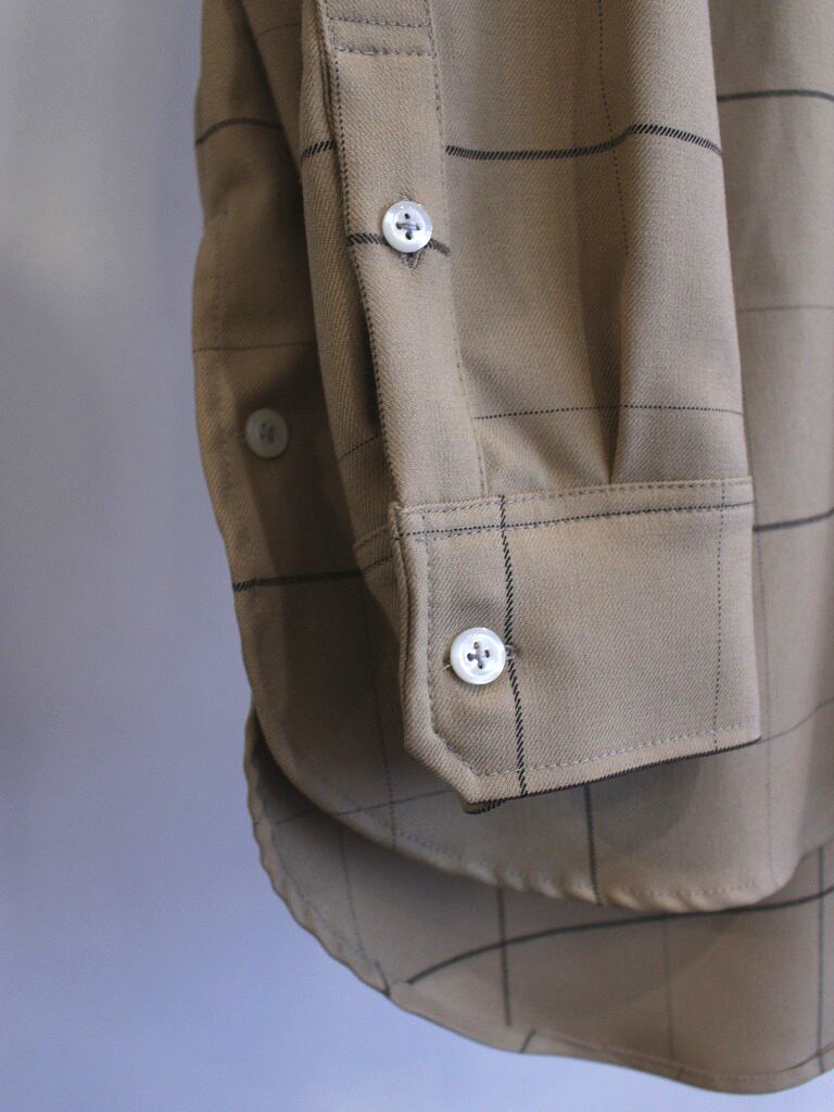 やや重量とドレープのある生地とワイドフォルムに造り、シャツのデザインながらアウターのような存在感があります。
