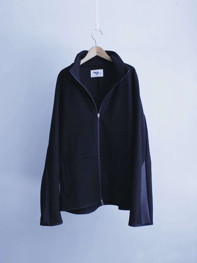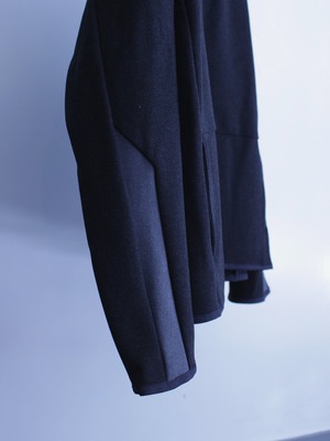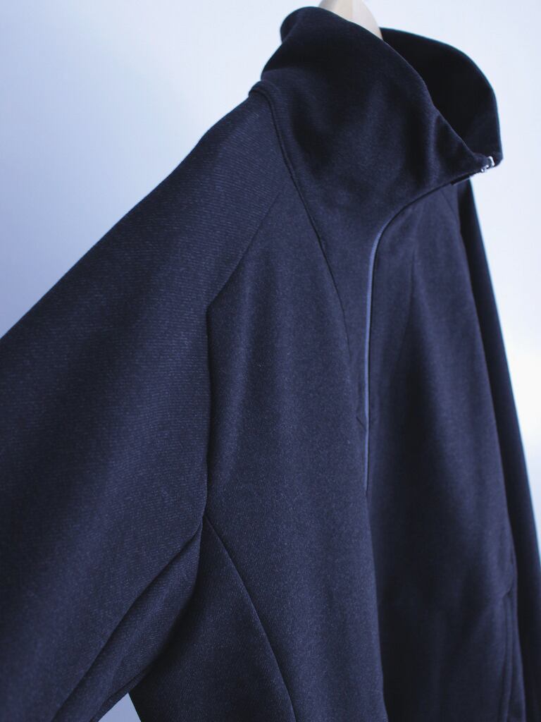 直線的なデザインと曲線的なパターンニングで構成された立体的な設計のハイネックスタンドフルジップ。流線形に圧迫感を排除した切り替えネックデザイン。ブレードラインの入るアームは高い質感の切り替え仕様になります。裾や袖口はニットトリムの仕様でリブやカフスなど幅広いインナーとの相性を考慮しているディテールです。