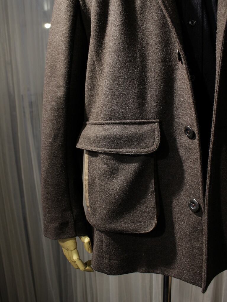ボディーのパッチポケットはマチのある立体的なデザイン。物入スペースと両玉縁のハンドウォームポケットのある仕様です。