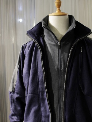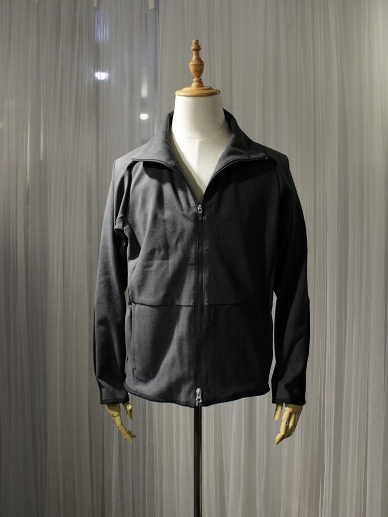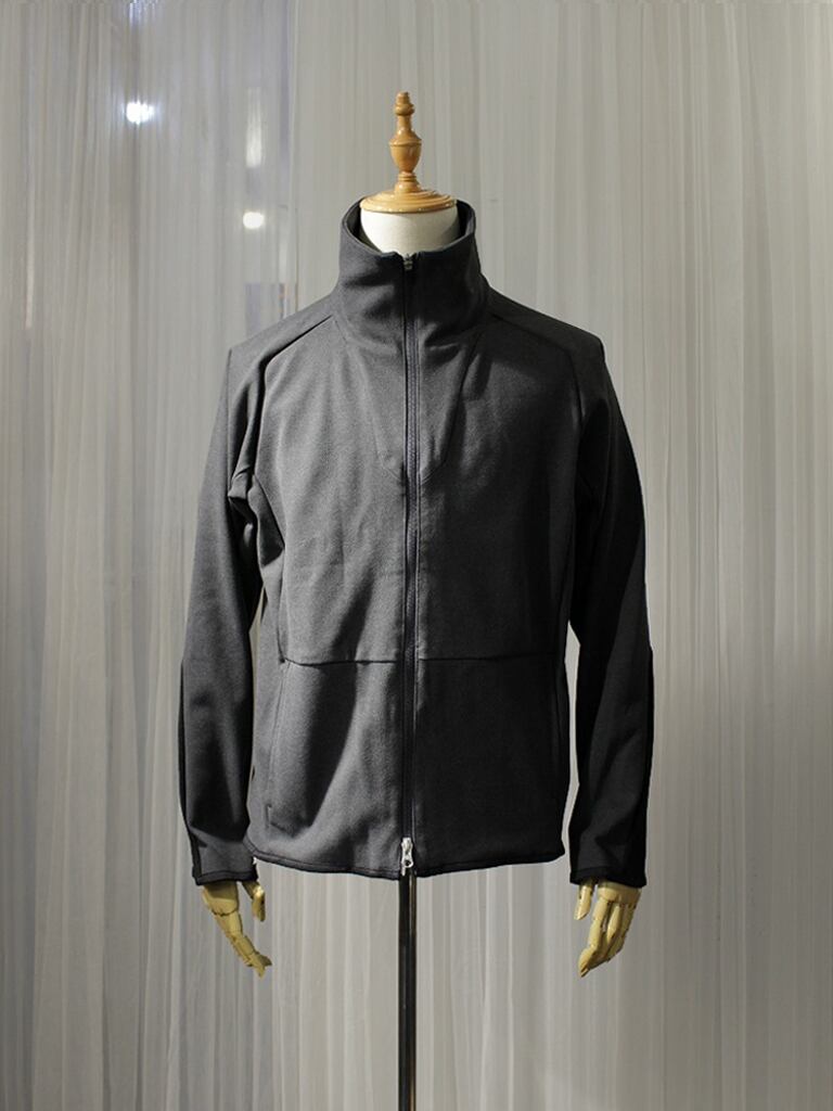 直線的なデザインと曲線的なパターンニングで構成された立体的な設計のハイネックフルジップ。幾何学なラインのラグラン袖切り替えが特徴です。流線形に圧迫感を排除した切り替えネックデザイン。ブレードラインの入るアームは高い質感の切り替え仕様になります。裾や袖口はニットトリムの仕様でリブやカフスなど幅広いインナーとの相性を考慮しているディテールです。