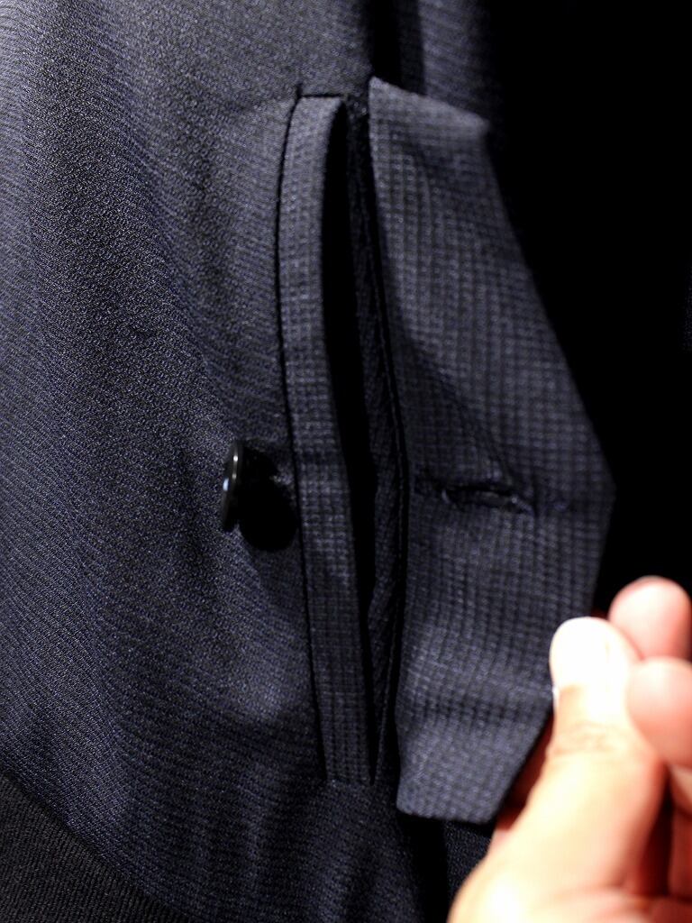 梳毛の動きによる風合いを活かす全体にゆったりしたムードのあるフォルム。それに対するショートな着丈、ラグランの幾何学切り替え、トレンチコートのようなバックヨークなどフォルム、ディテールに現代的な解釈を取り入れた意匠があります。