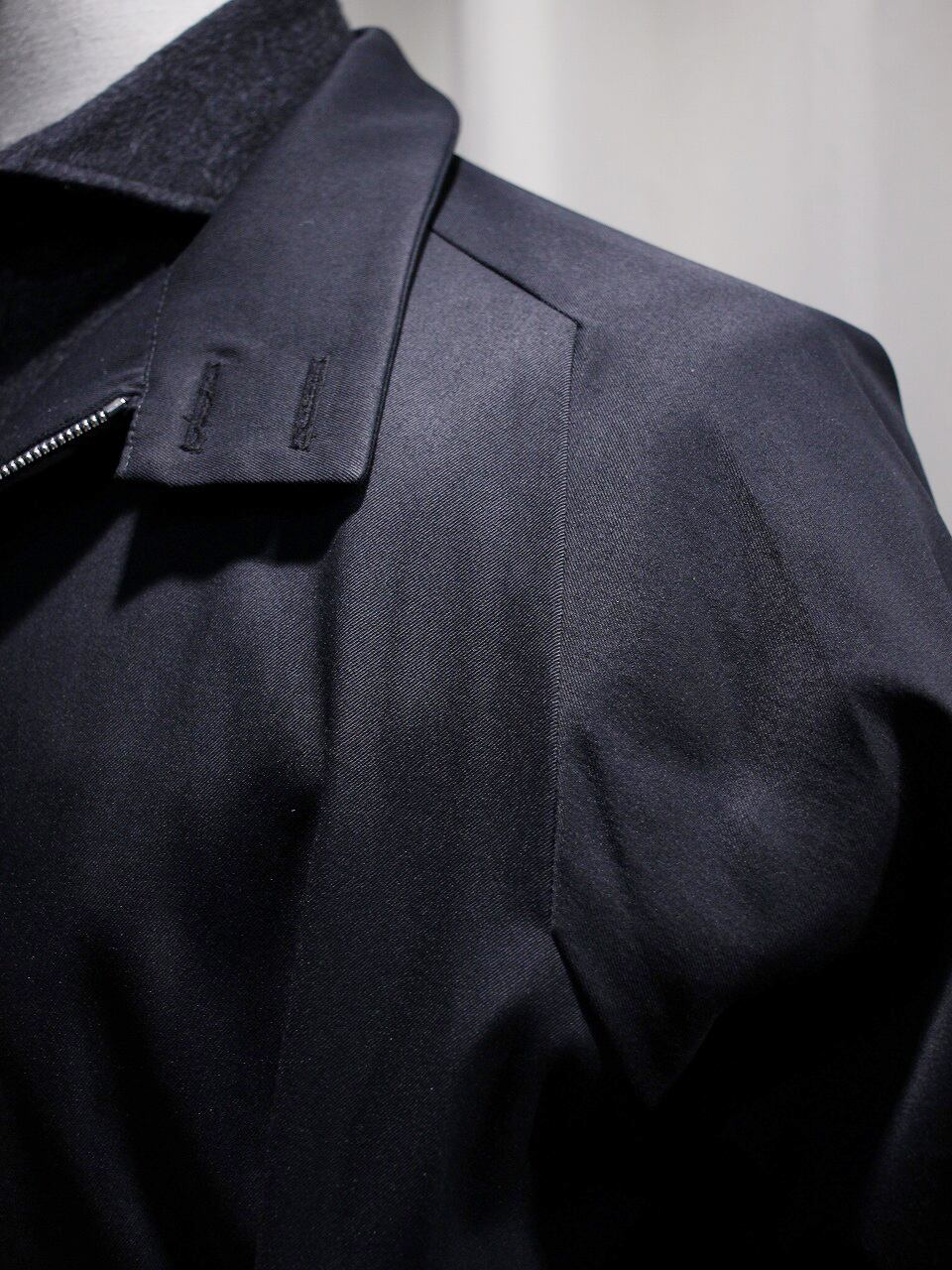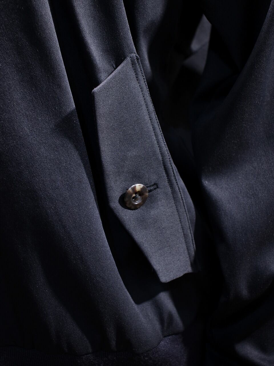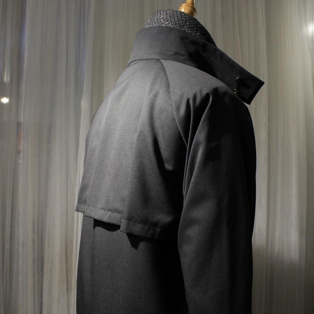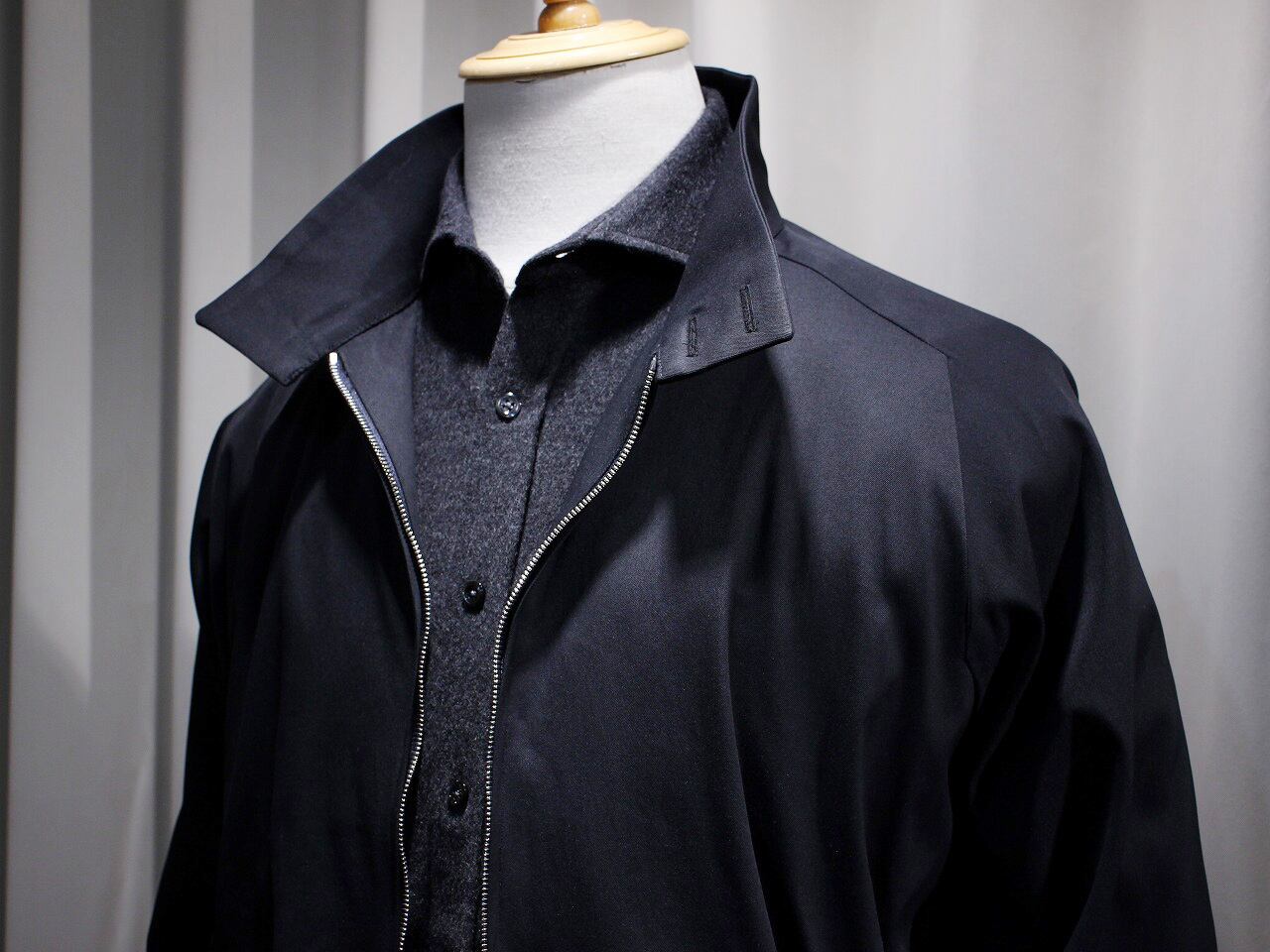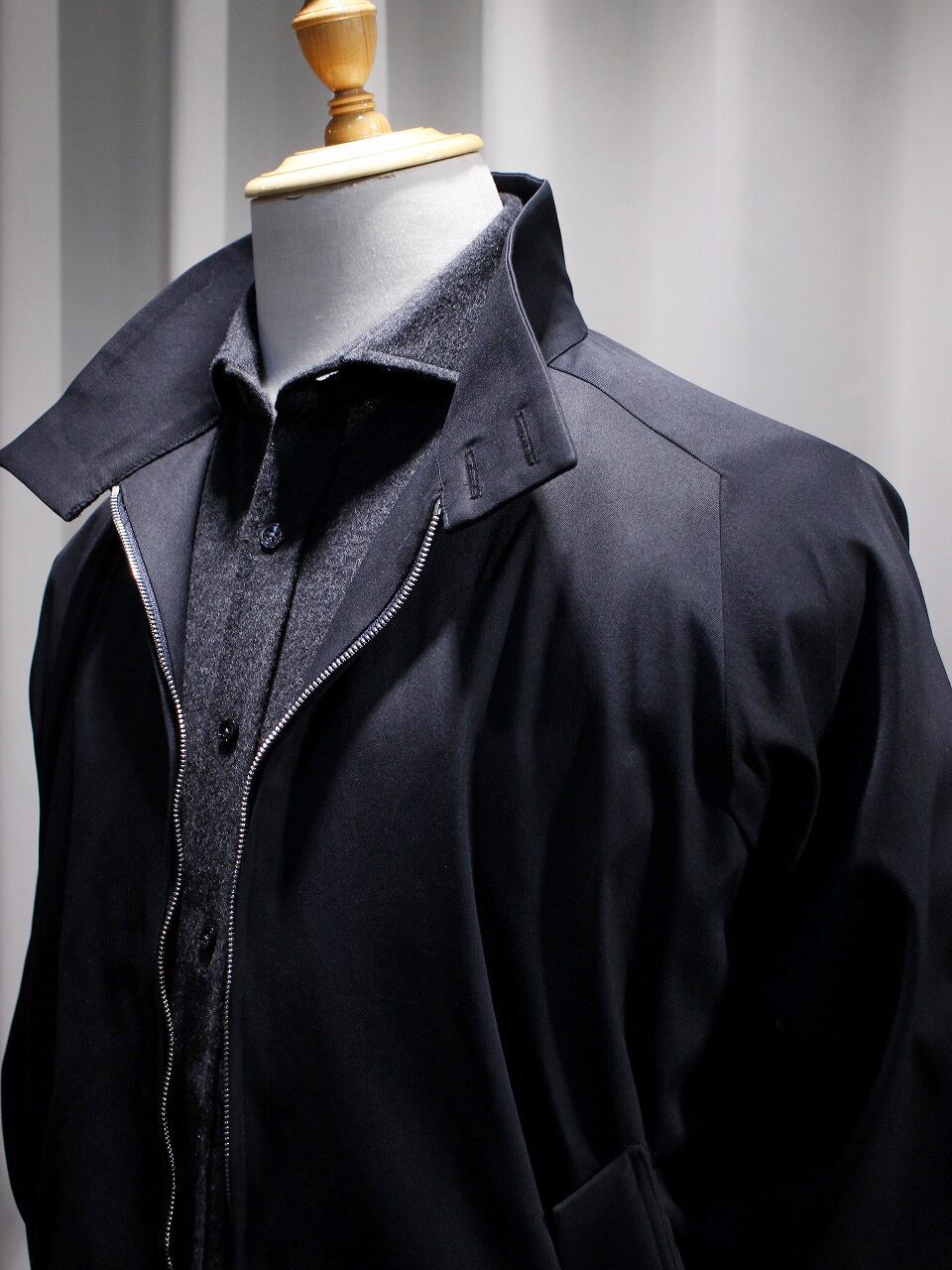 全体にゆったりしたムードのあるフォルム。それに対するショートな着丈、ラグランの幾何学切り替え、トレンチコートのようなバックヨークなどフォルム、ディテールに現代的な解釈を取り入れた意匠があります。