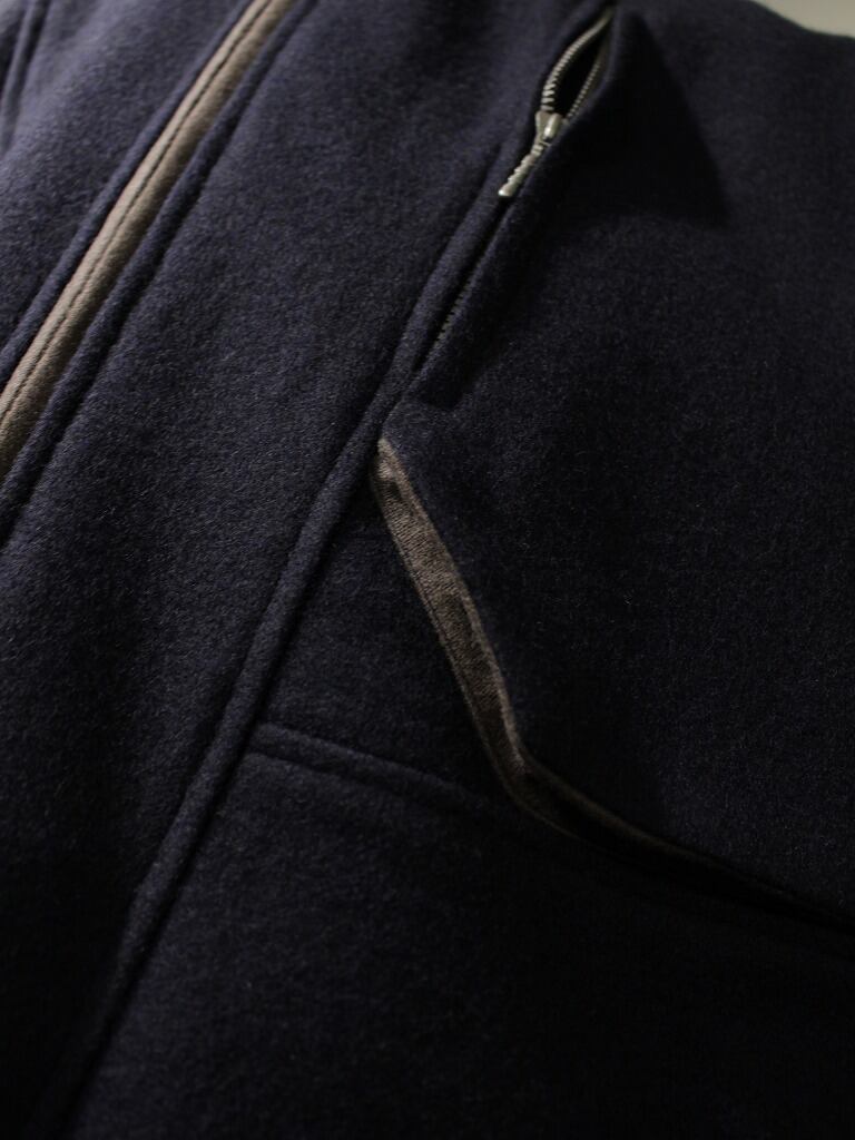 ネイビー部分は日本製ウールモッサを使用。切り替え方部分にはイタリア製ウールモッサを使用しています。