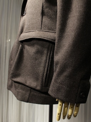 ボディーのパッチポケットはマチのある立体的なデザイン。物入スペースと両玉縁のハンドウォームポケットのある仕様です。胸ポケットはジャケット仕様の箱ポケット。センターベントはコートの仕様です。