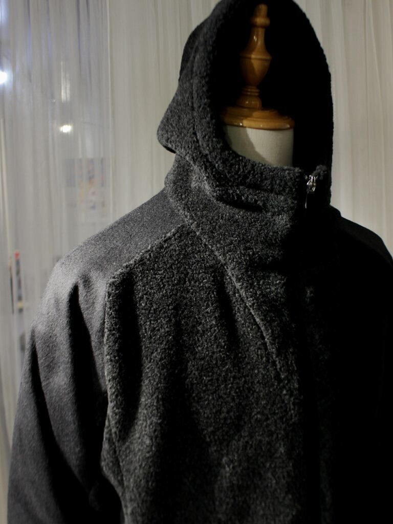 ラグラン袖とフード裏の切り替えに使用した生地は358g/mのウールビーバー。