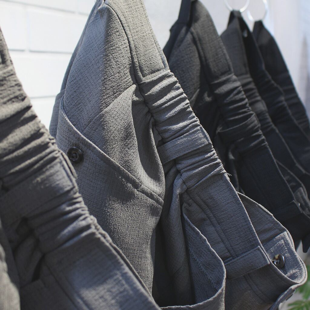 通気孔のある特殊技術製造生地Dotair®Stretchを使用しています。カーキグレーは同生地を使用したカッタウエイシャツとのセットアップが可能です。