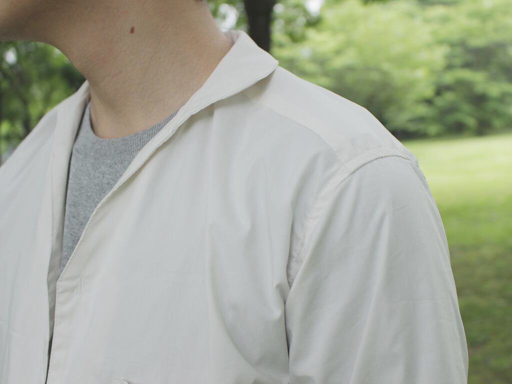 フレンチフロントにより見返しのある構造のまま、V型にカットした2重構造のネックにカッタウエイ型の襟を付けたスキッパーのようなデザイン。