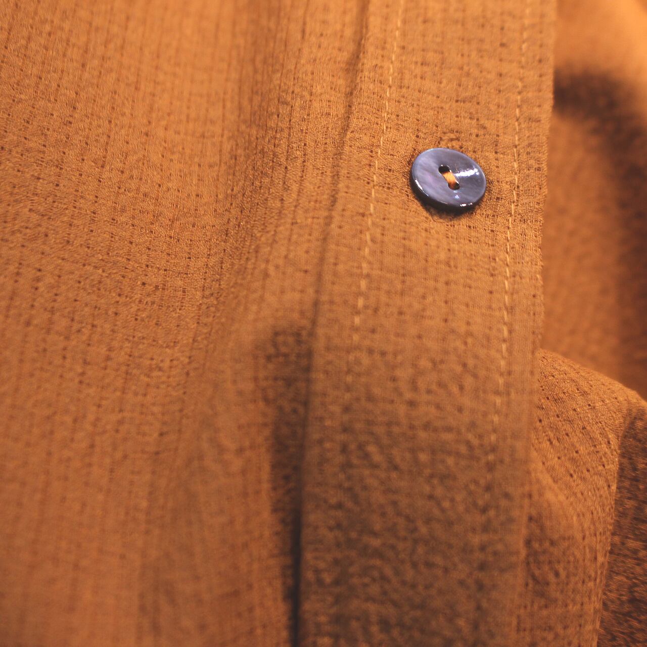 天然シェルインディゴ染め加工の2つ穴釦を採用し、製品の質を向上させるひと手間として手付けで釦付けをしています。