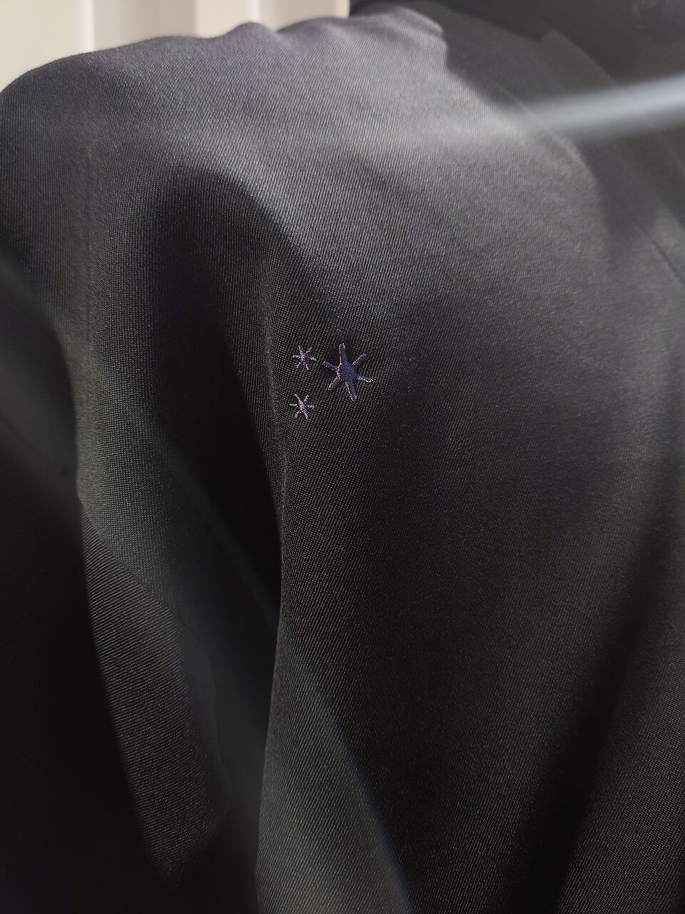 リラックスしたドロップショルダーのプルオーバーポケットシャツ。シルエットの空間を活かしドレープの効いたシャンブレーツイルを使用しています。サラッとした着心地、イージーケアです。ネムリシャツ穴 3釦仕様。トレスステッラの刺繍。