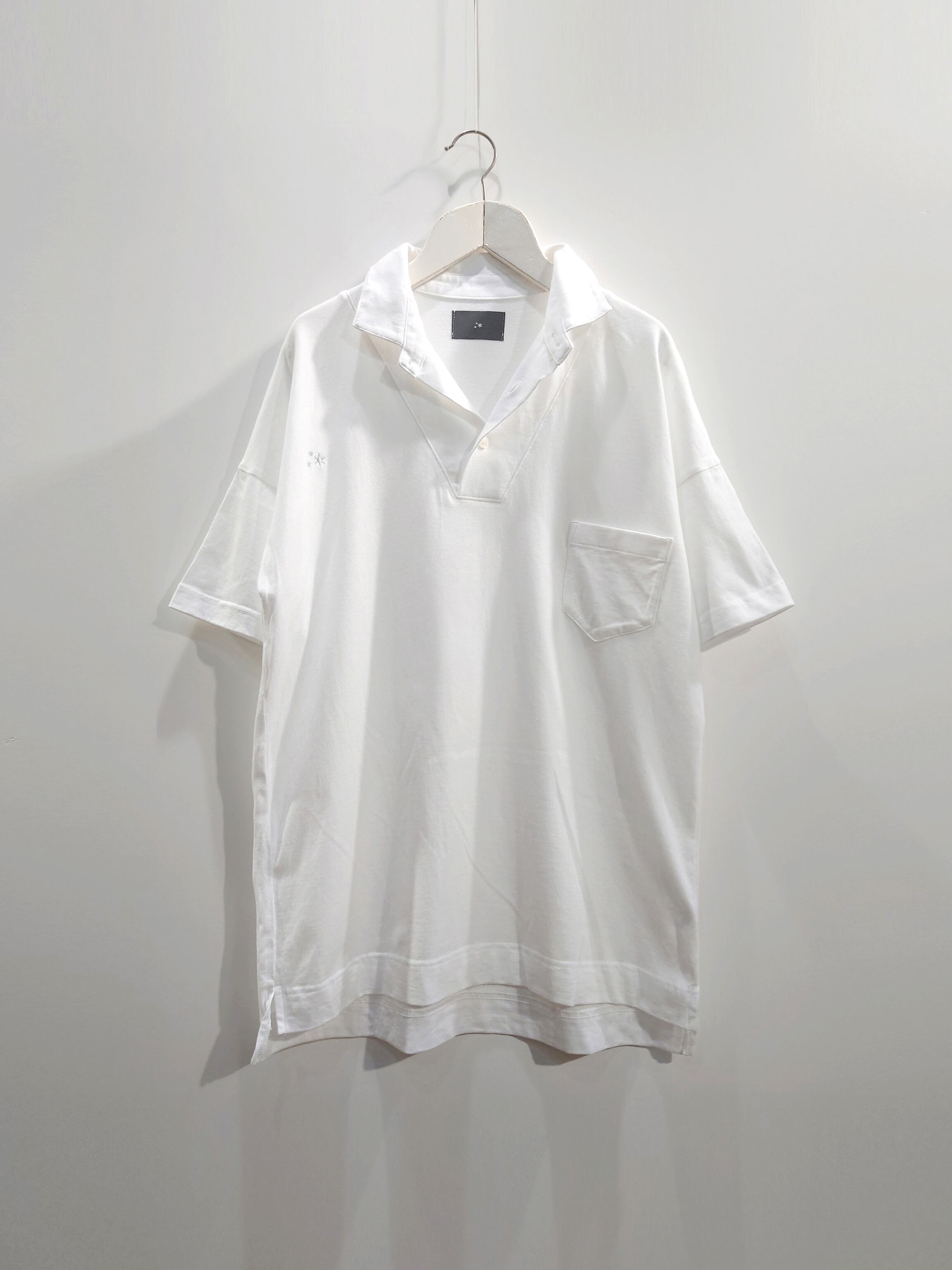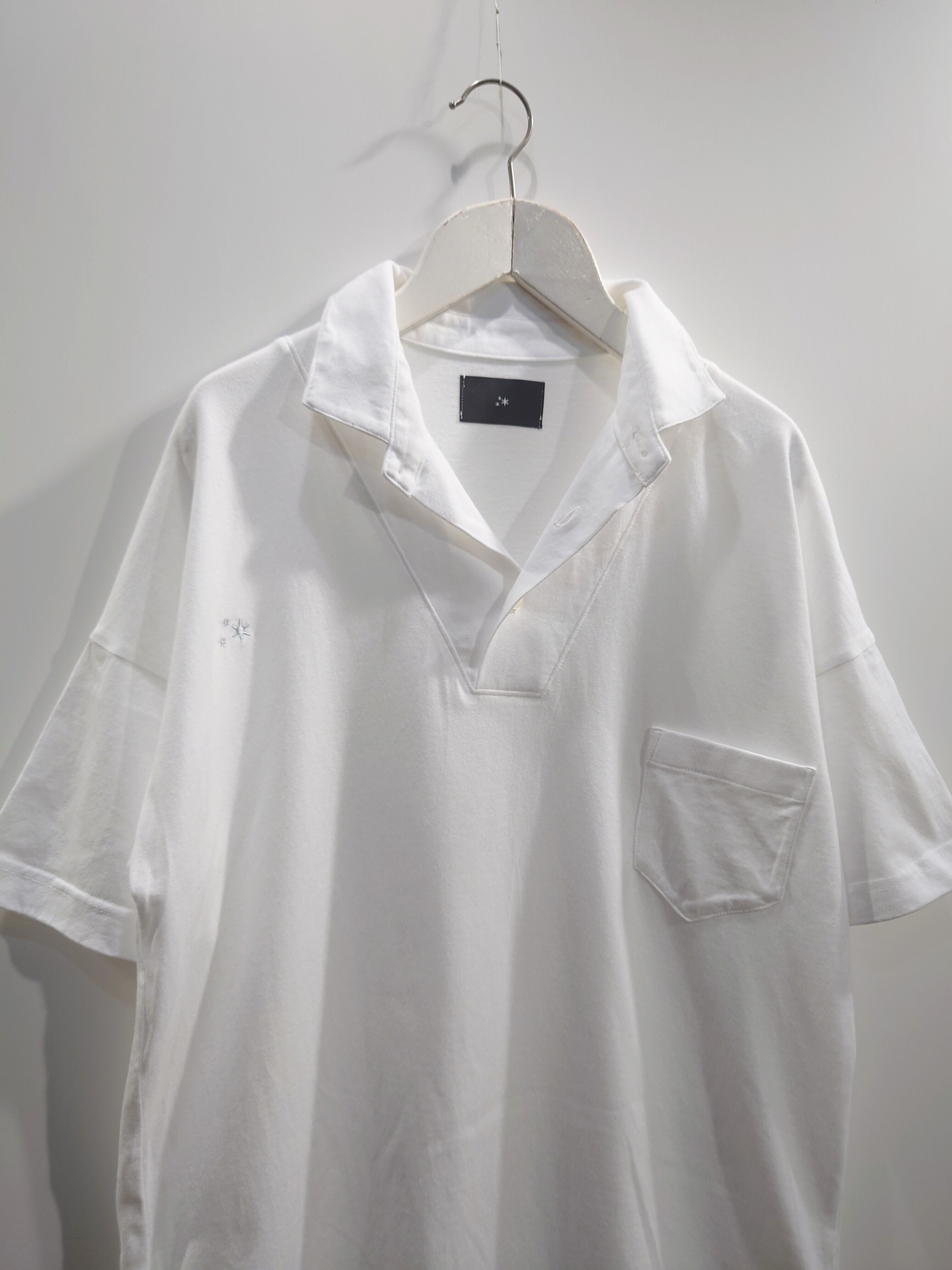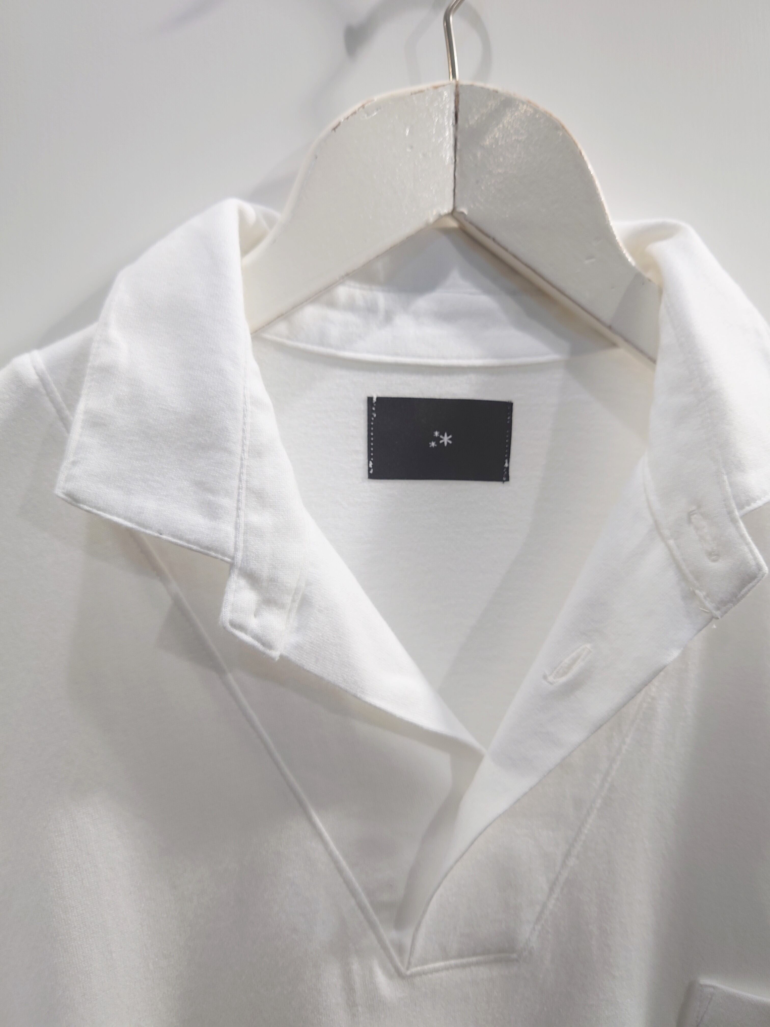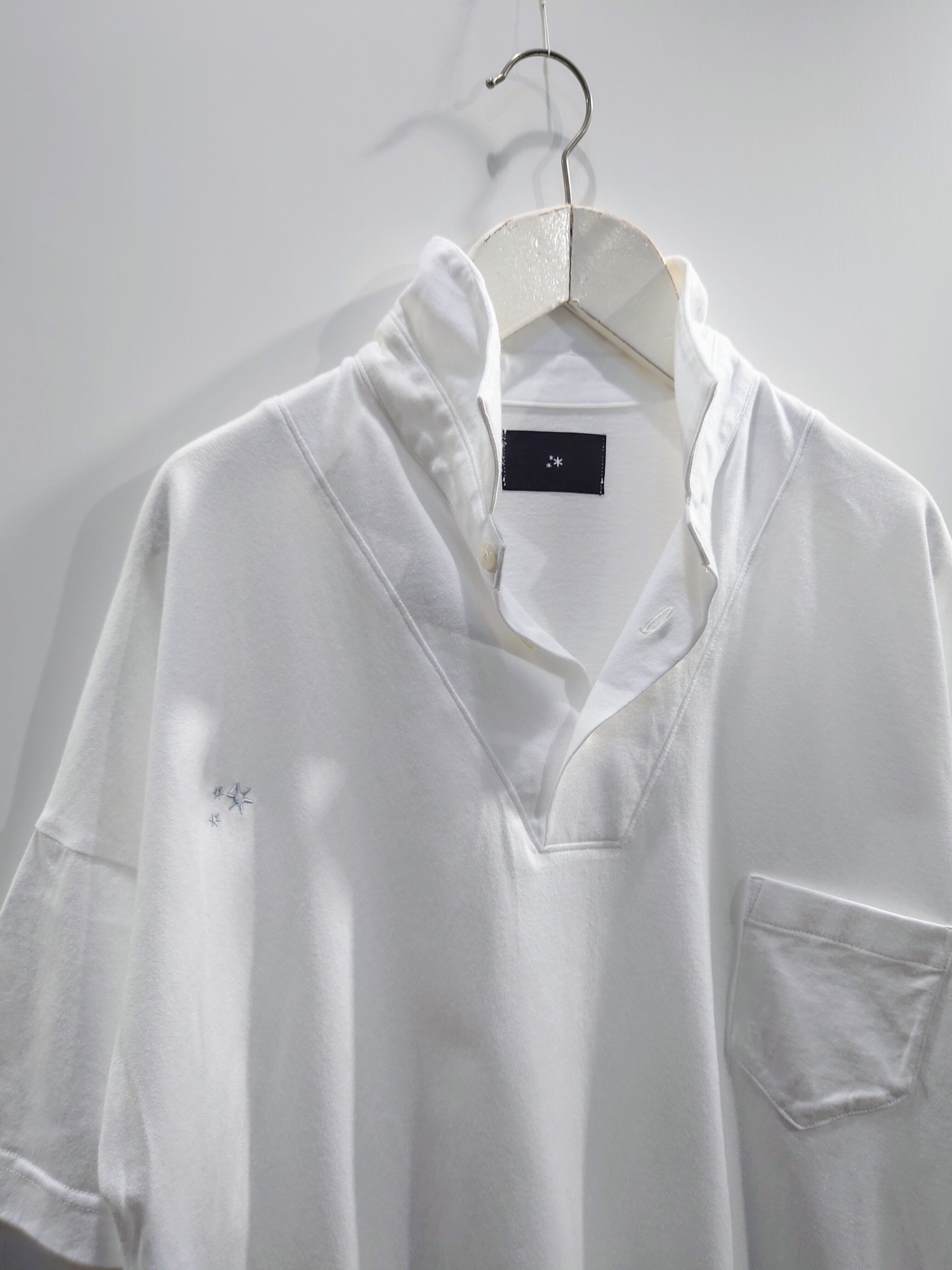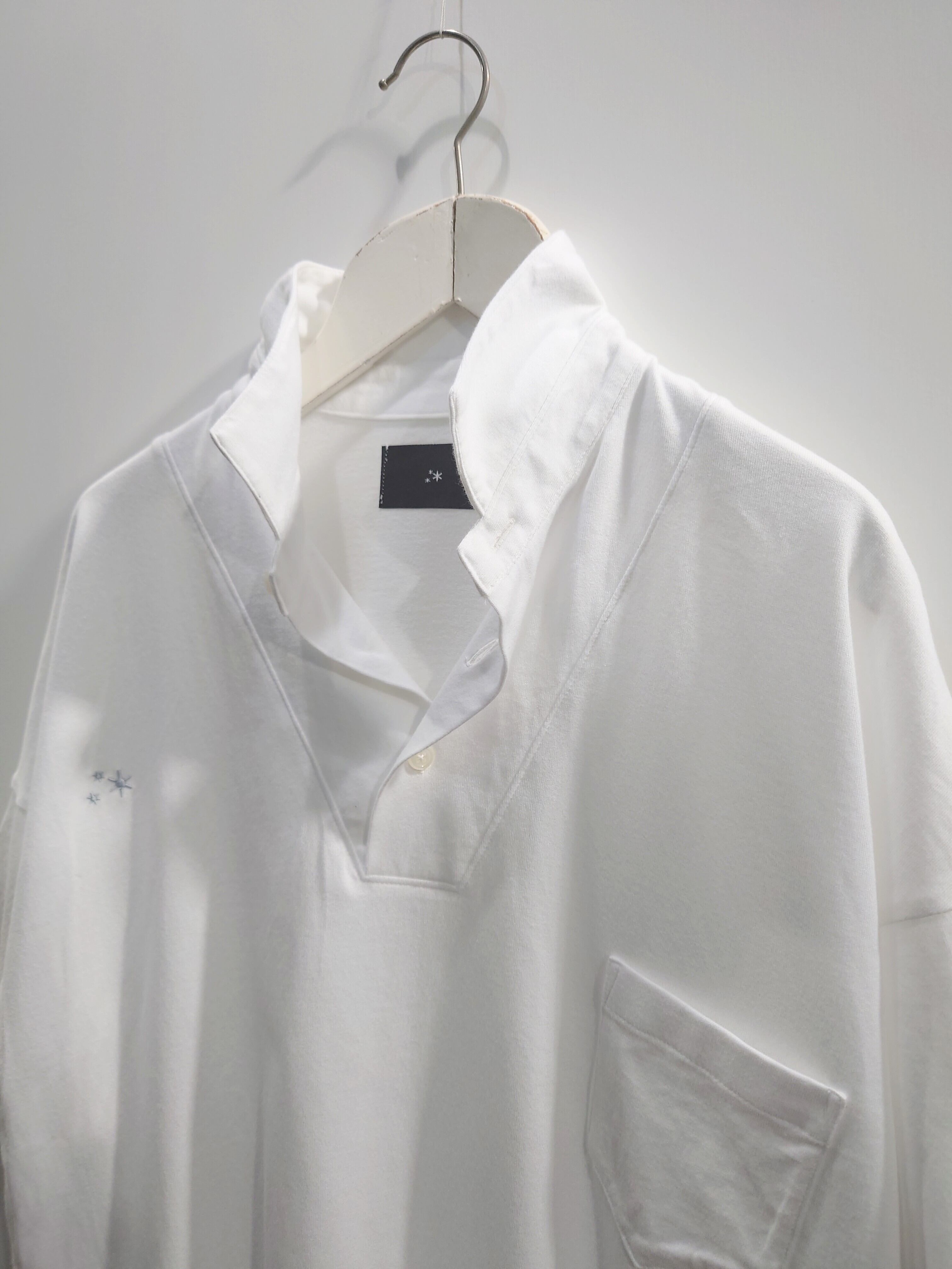 リラックスしたドロップショルダーのプルオーバーポケットシャツ。ソフト天竺を使用しています。シンプルながらプルオーバーシャツ、ポロシャツ、スキッパー、のどれでもない立ち位置のウェアです。3釦仕様。トレスステッラの刺繍。