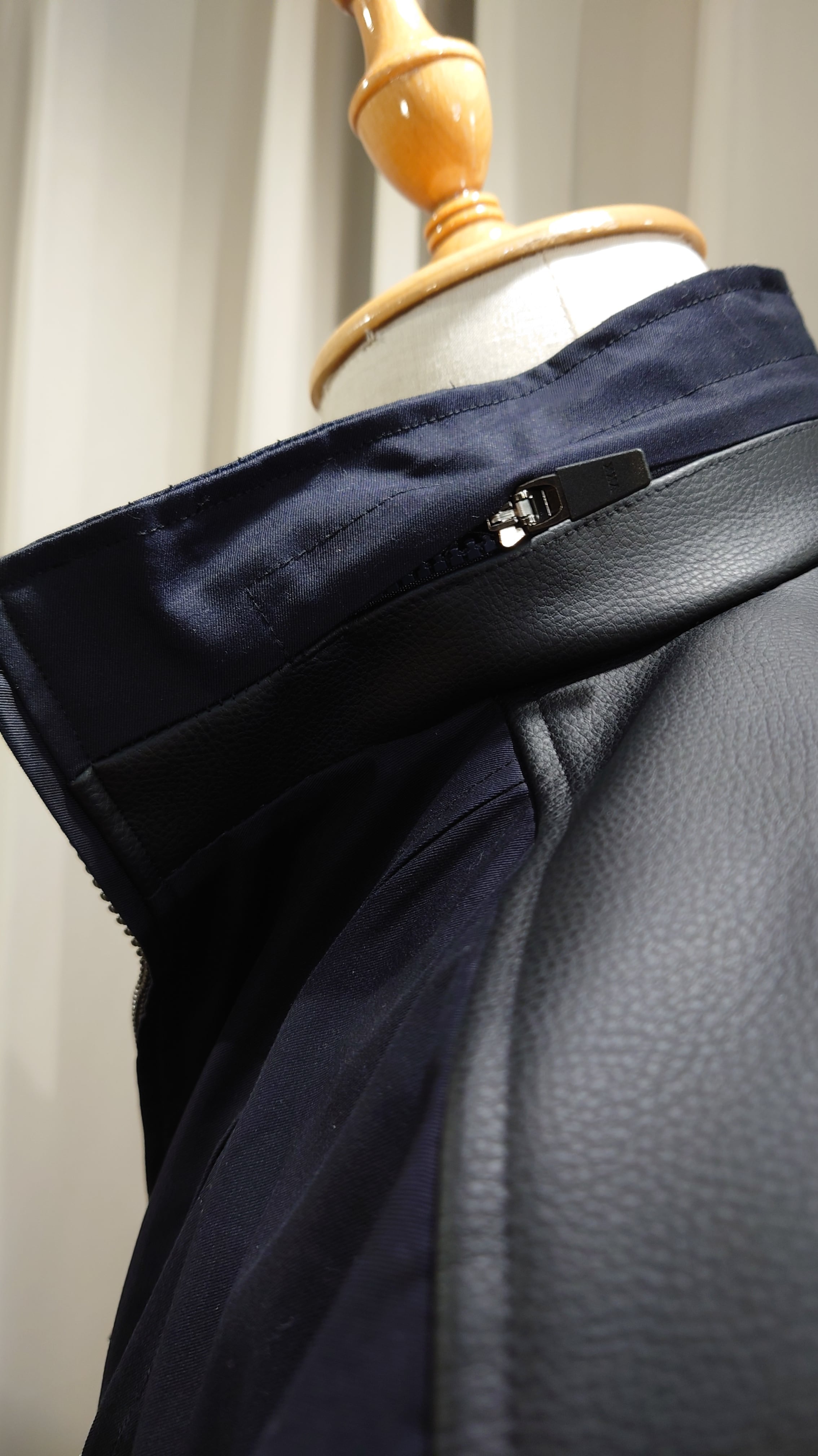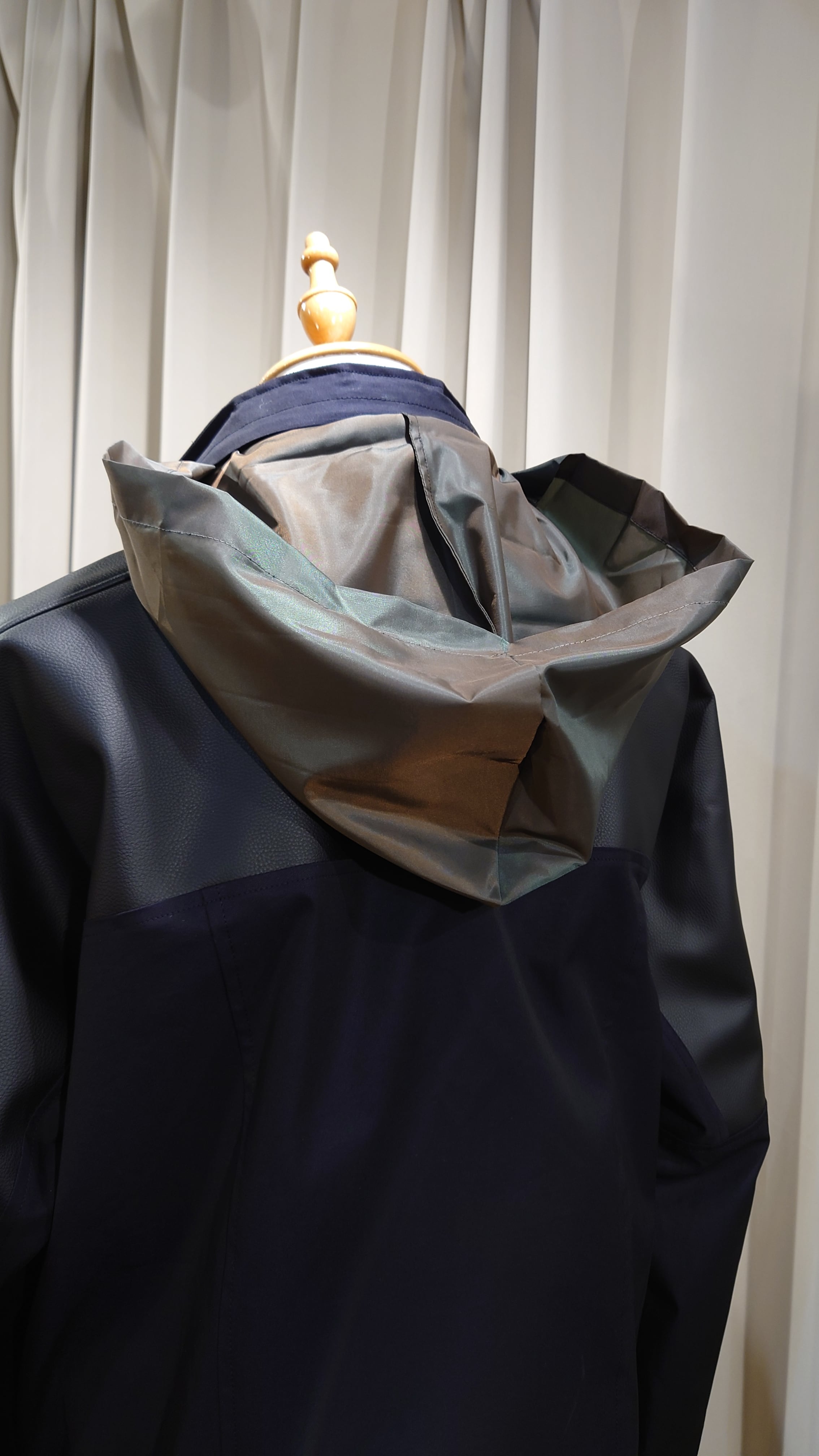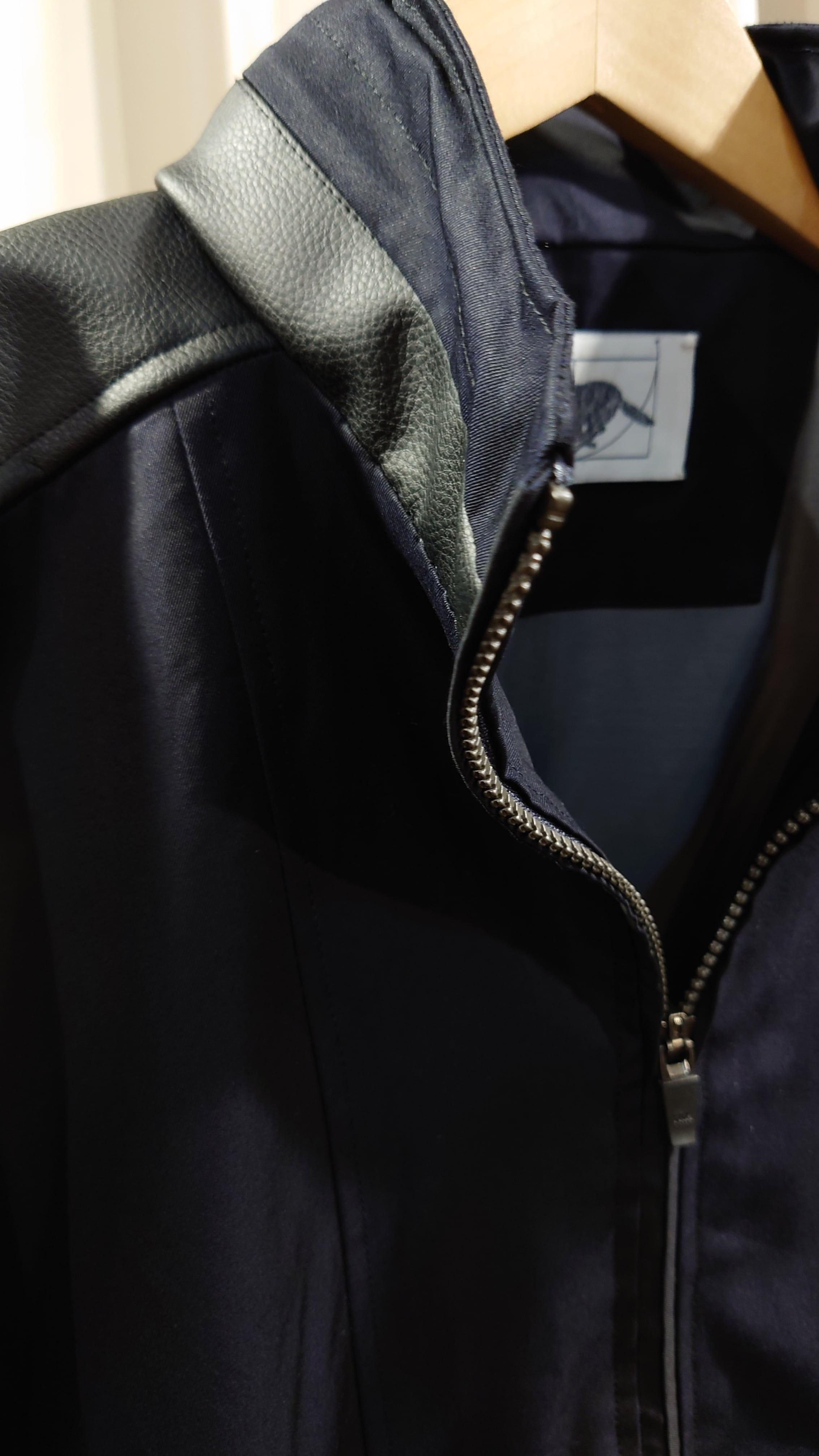 シェルは光の当たる角度で色調がネイビーからカーボンブラックに変化する、スタイルテックス社の上質感ある175g/㎡の7双高密度コットンギャバジン。