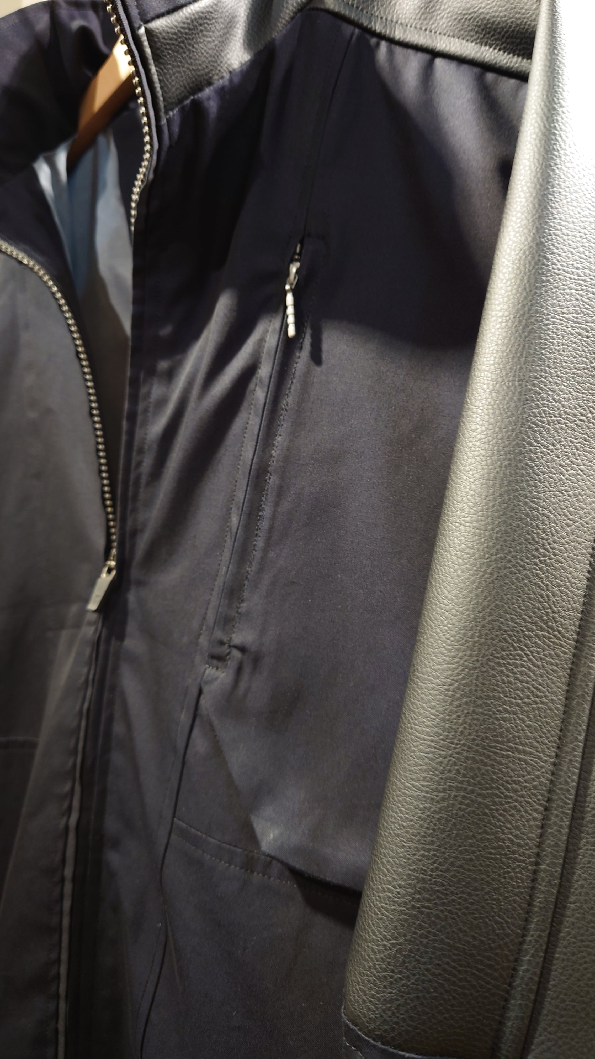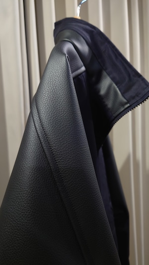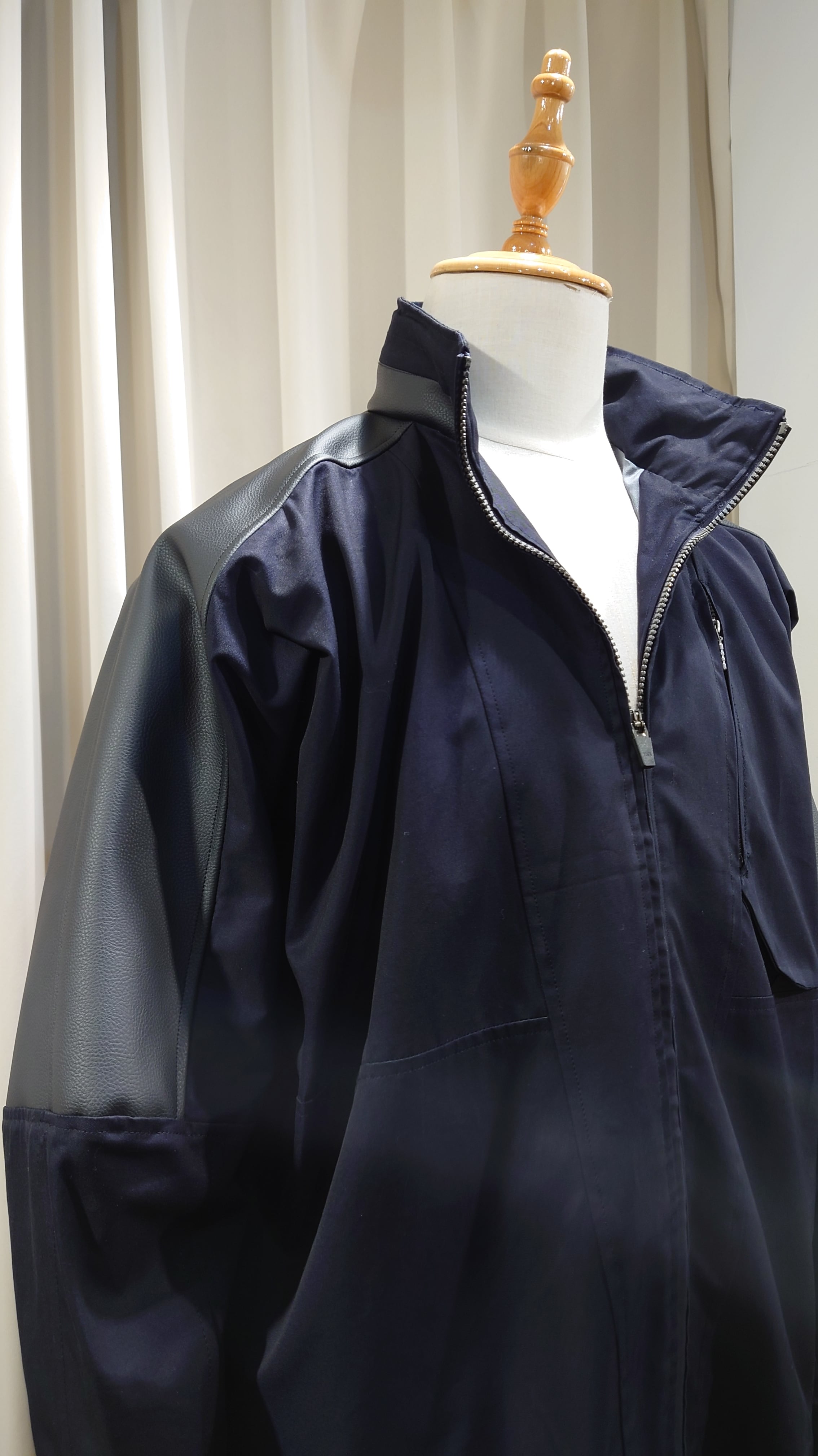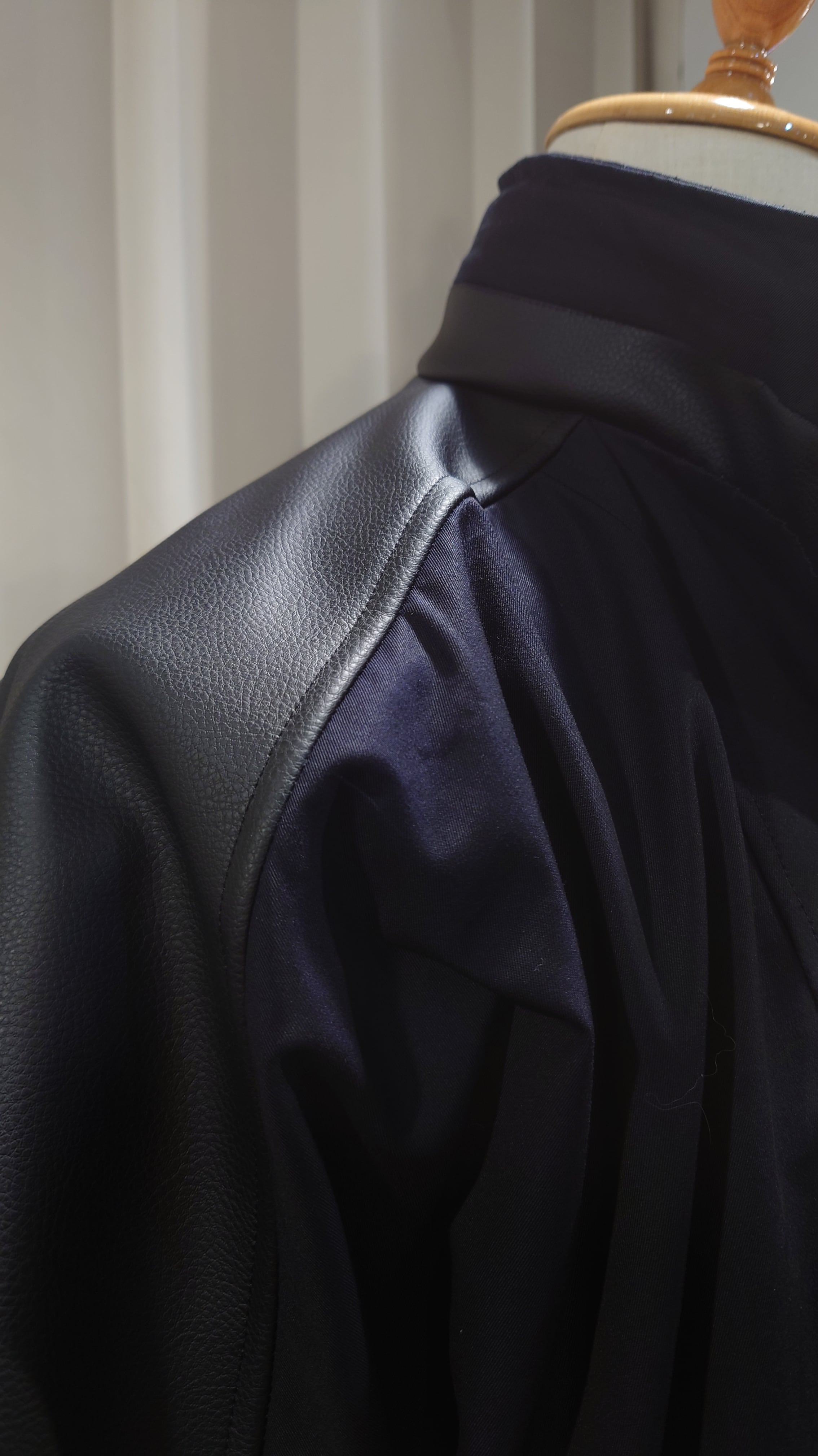 シェルは光の当たる角度で色調がネイビーからカーボンブラックに変化する、スタイルテックス社の上質感ある175g/㎡の7双高密度コットンギャバジン。