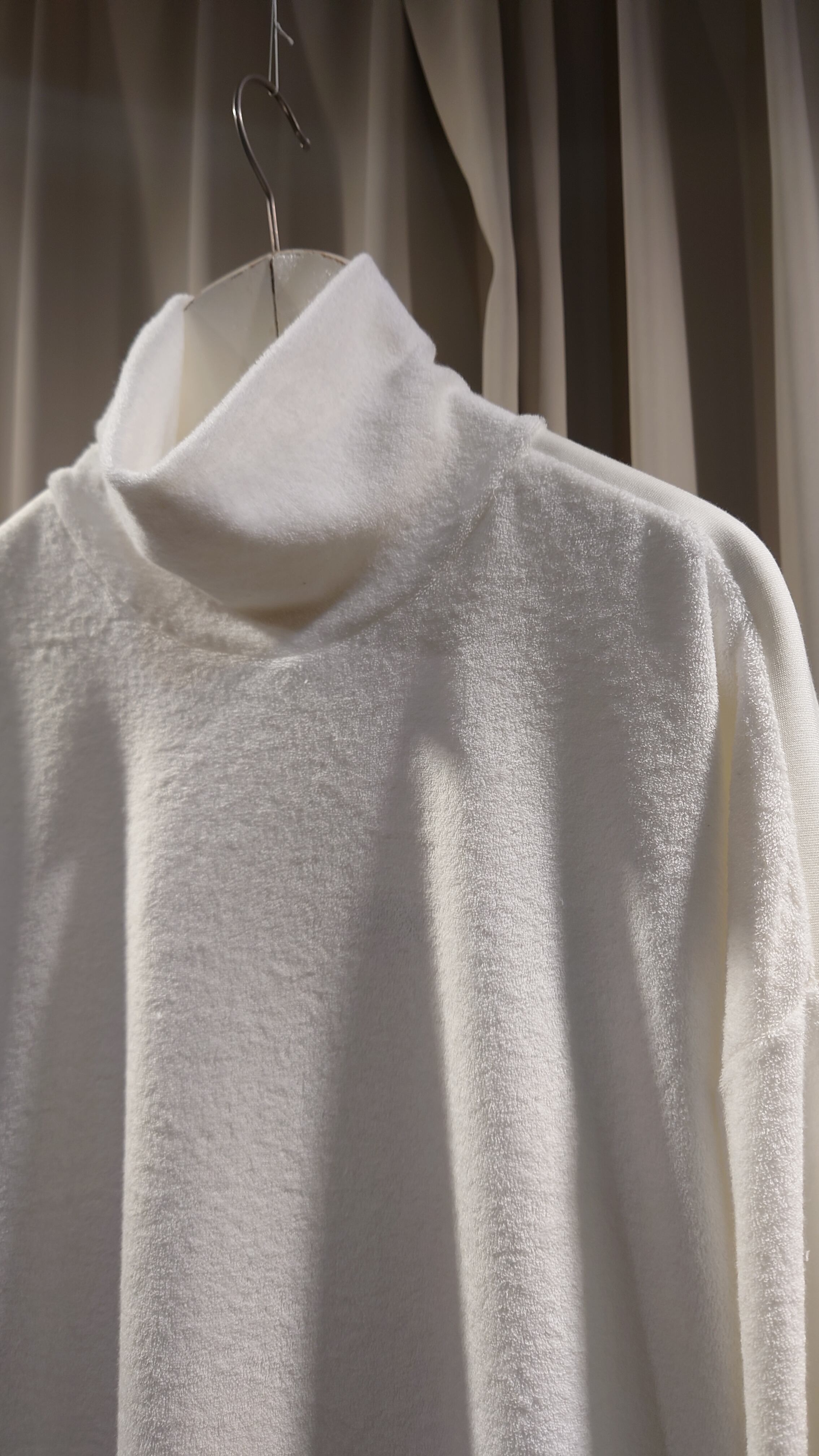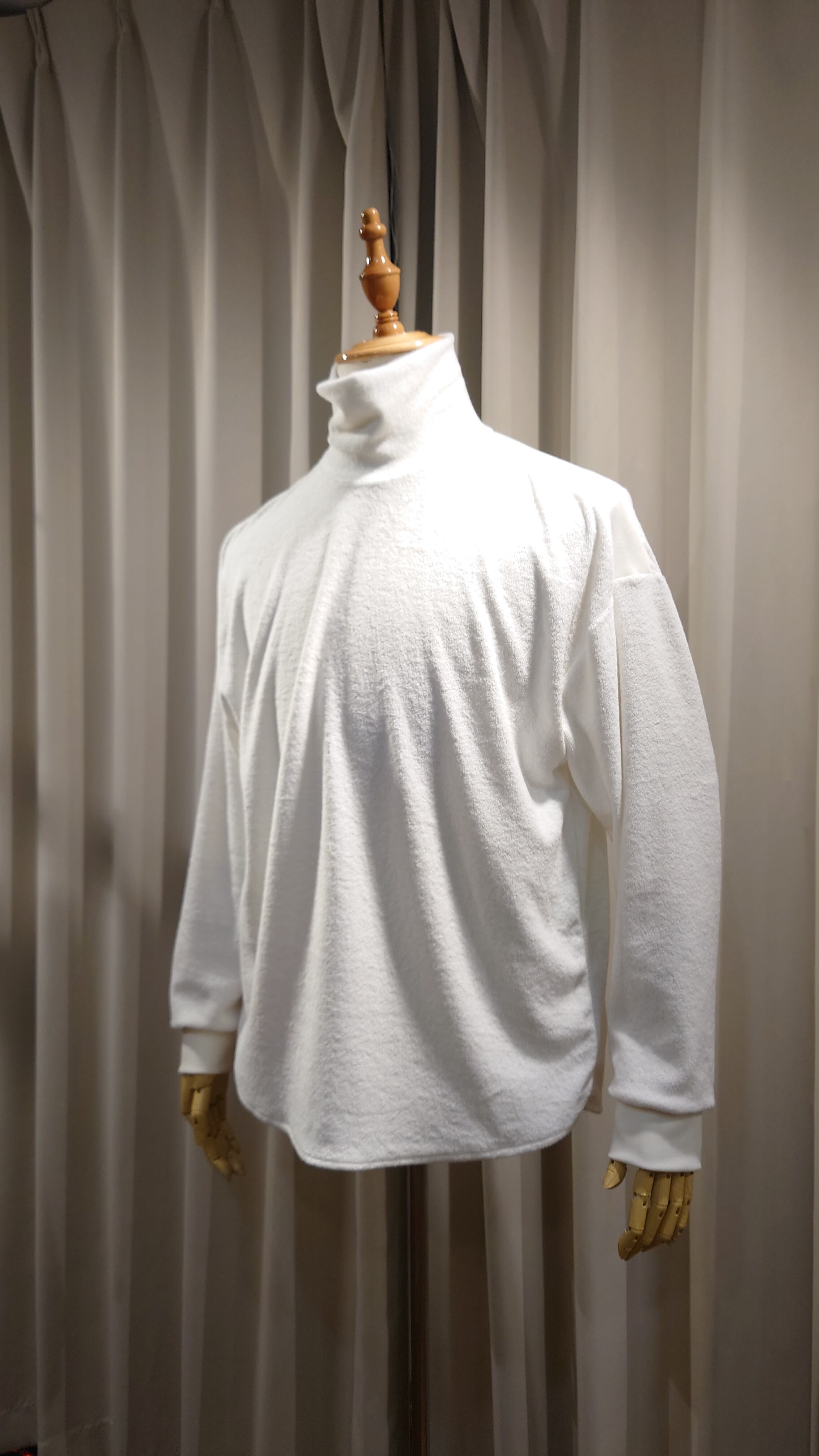 肩の切り替えが特徴のハイネックロングスリーブです。ウーリー糸を使用した度詰感のあるロック縫製です。