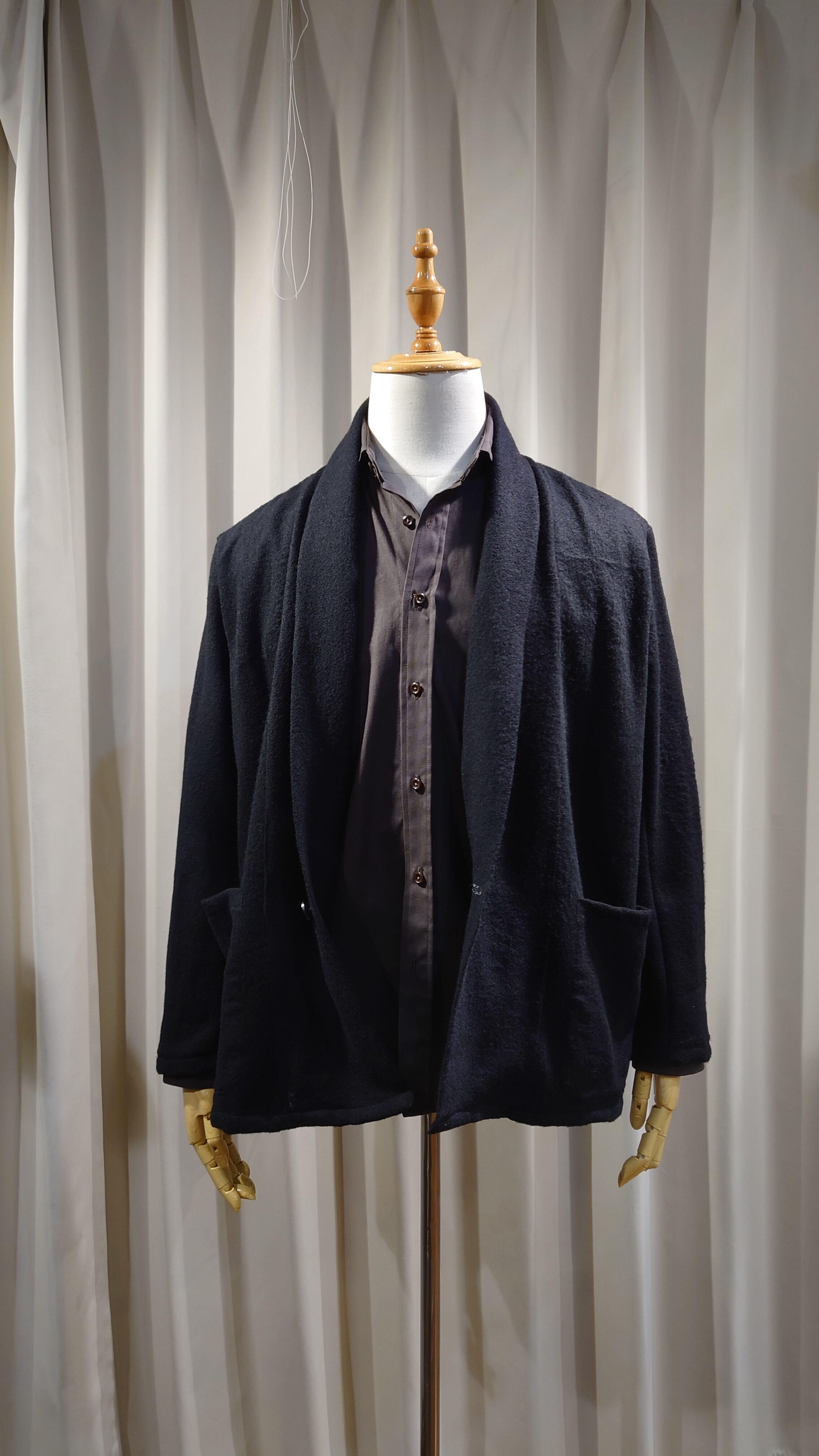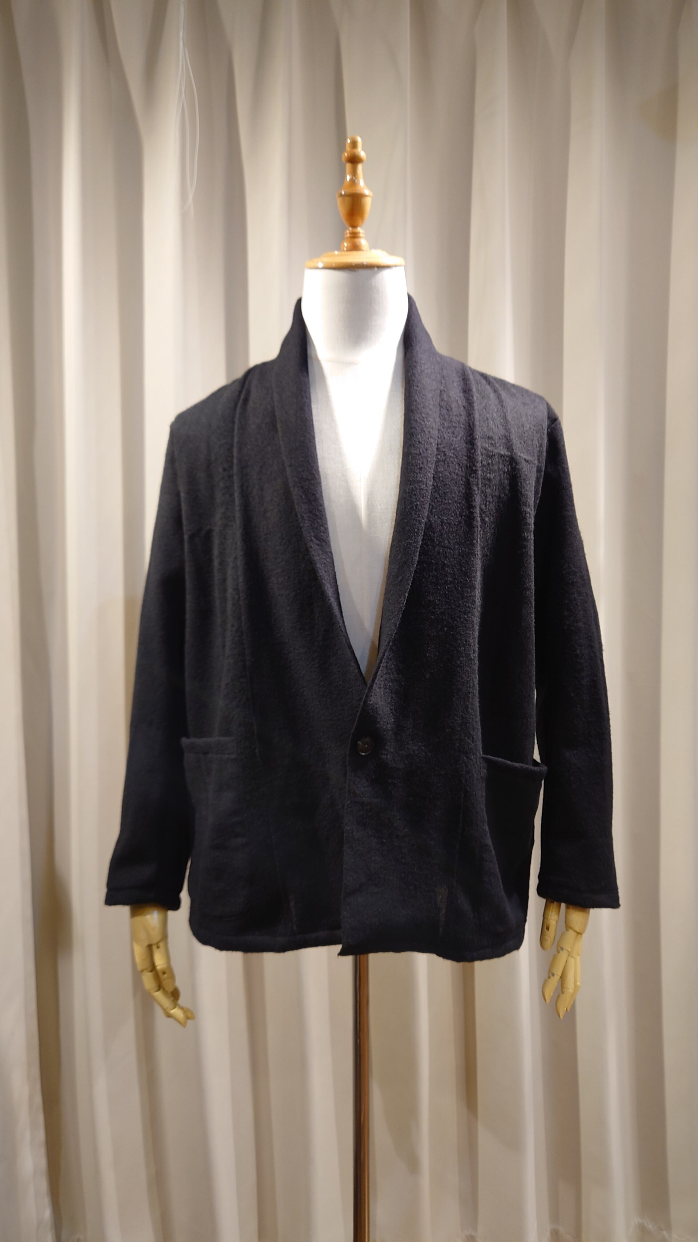 カーディガンのデザイン、テーラードジャケットを基本設計としたフォルムのショールカラーデザイン。一重の作り、1つボタン、テーラ―ドジャケットの2枚袖の仕様になっています。
