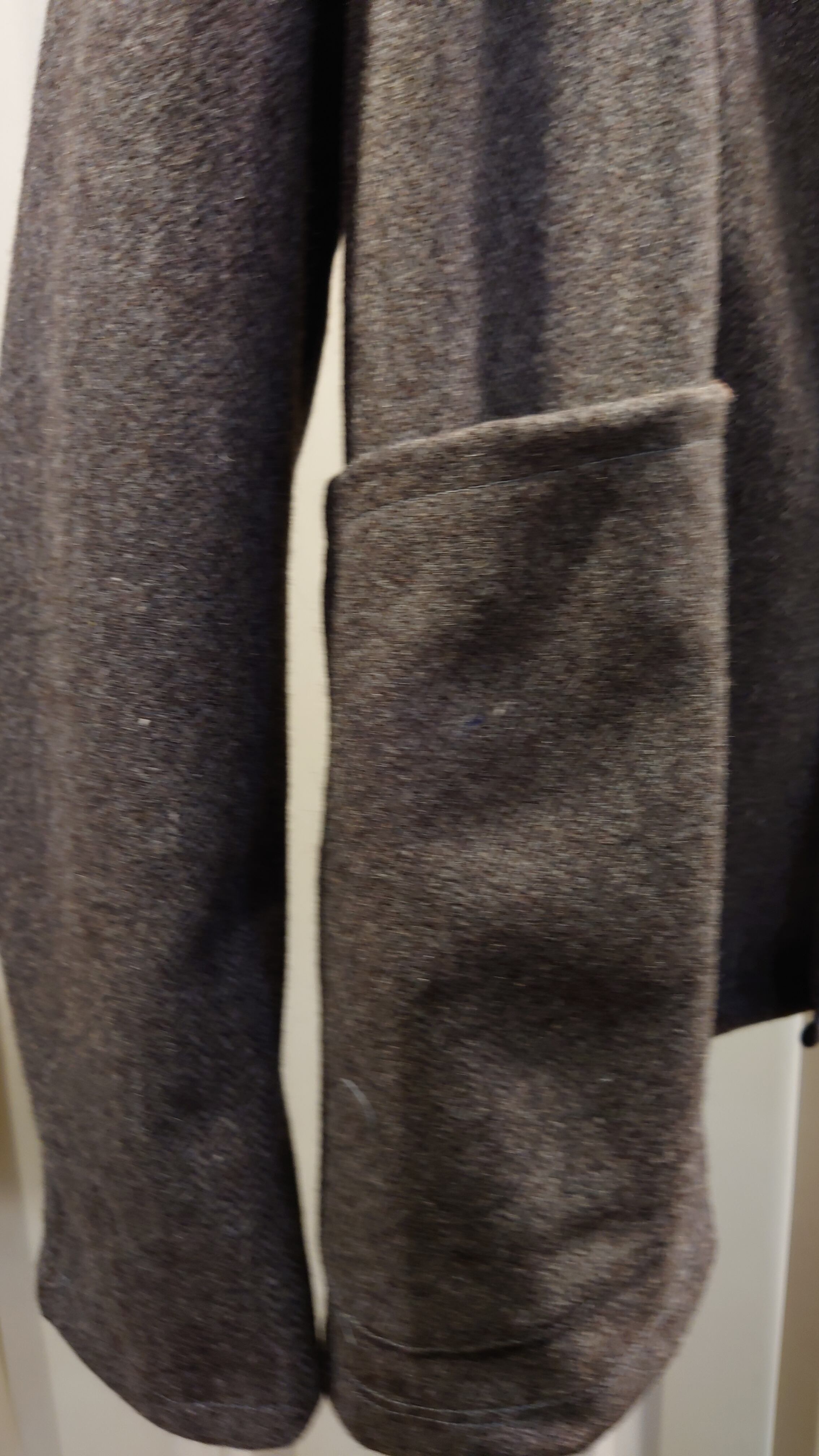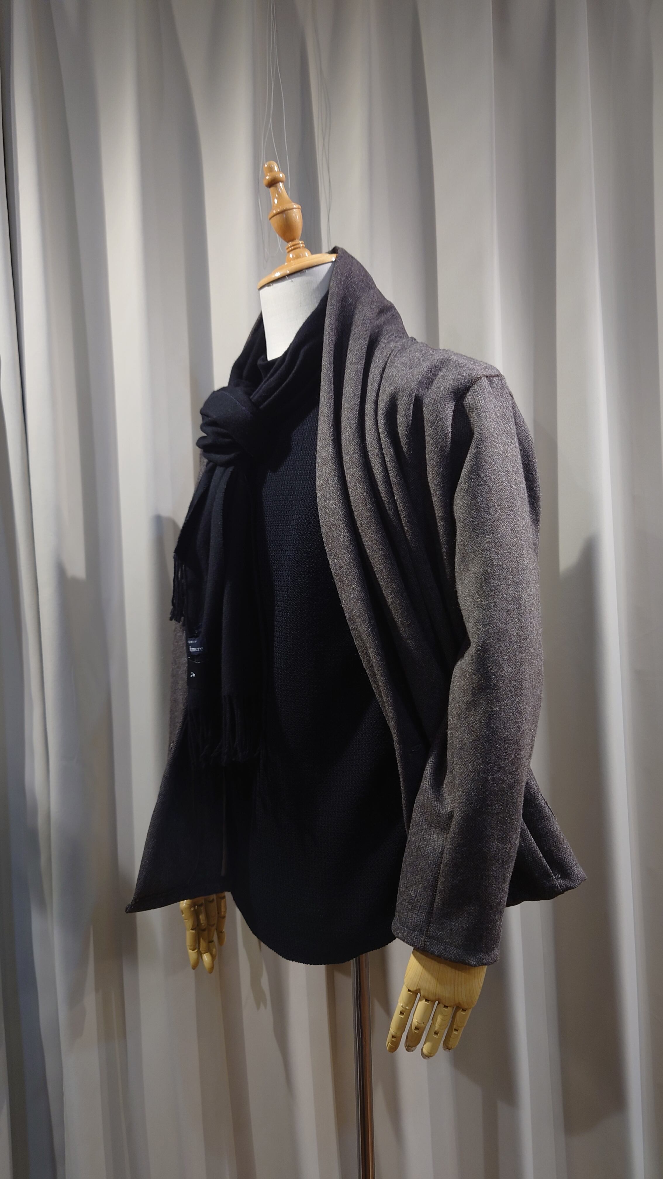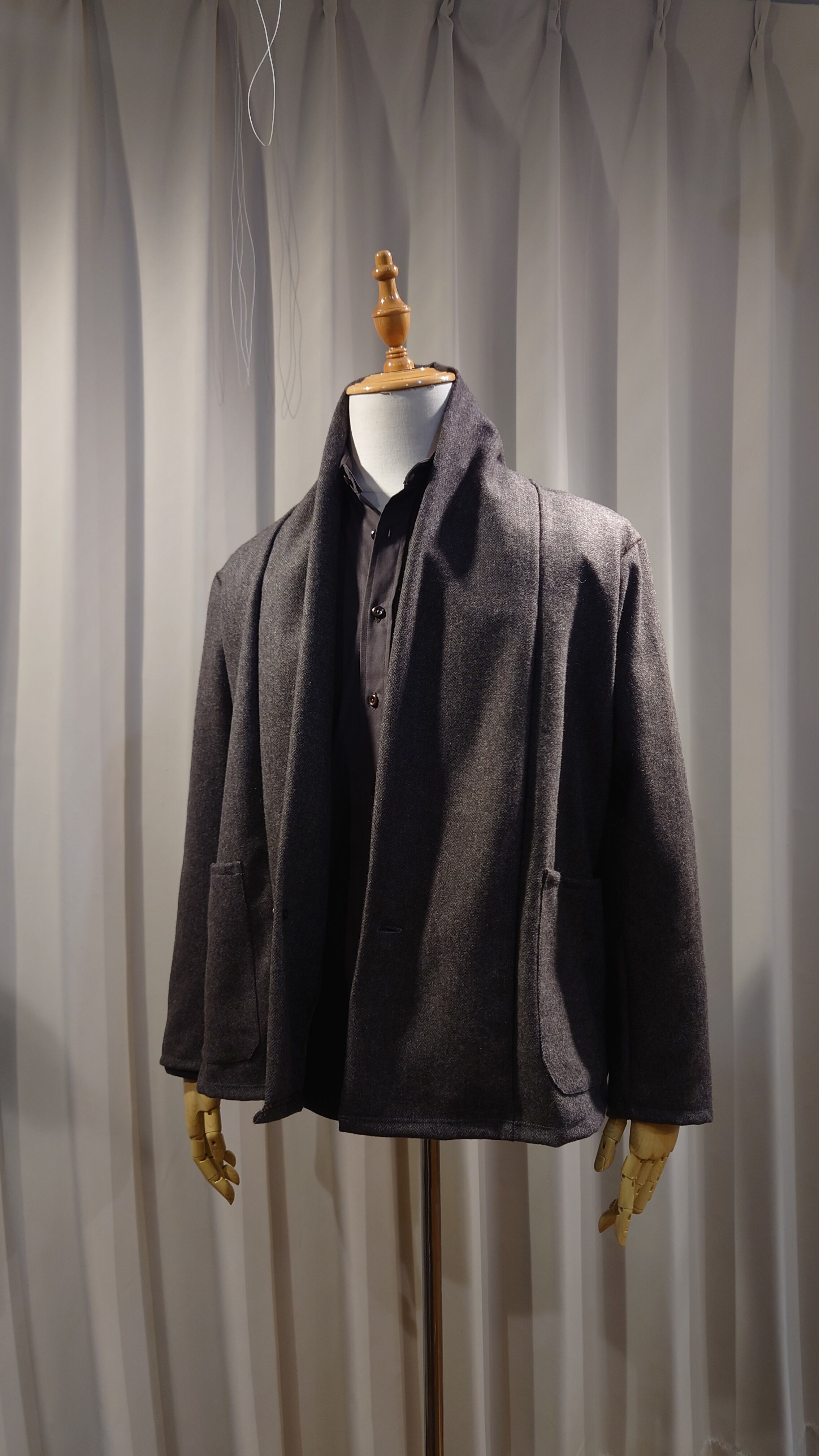 カーディガンのデザイン、テーラードジャケットを基本設計としたフォルムのショールカラーデザイン。一重の作り、1つボタン、テーラ―ドジャケットの2枚袖の仕様になっています。
